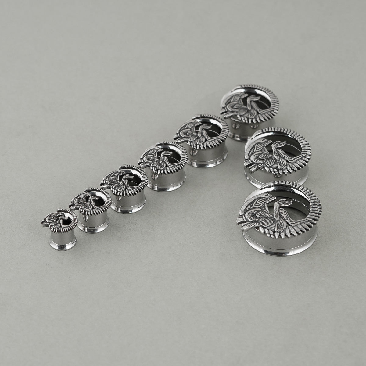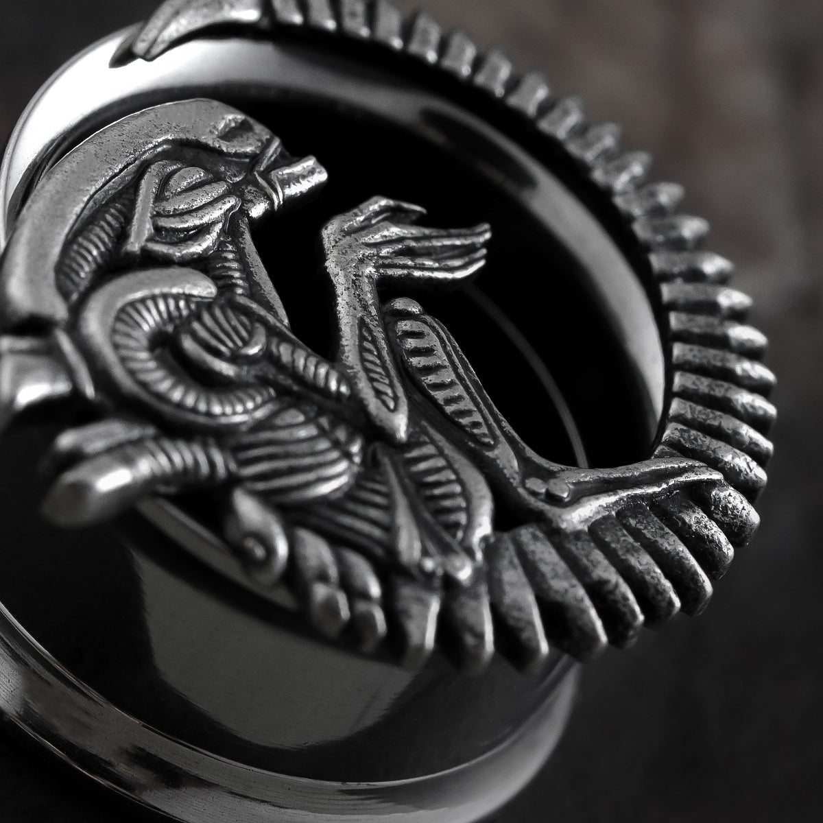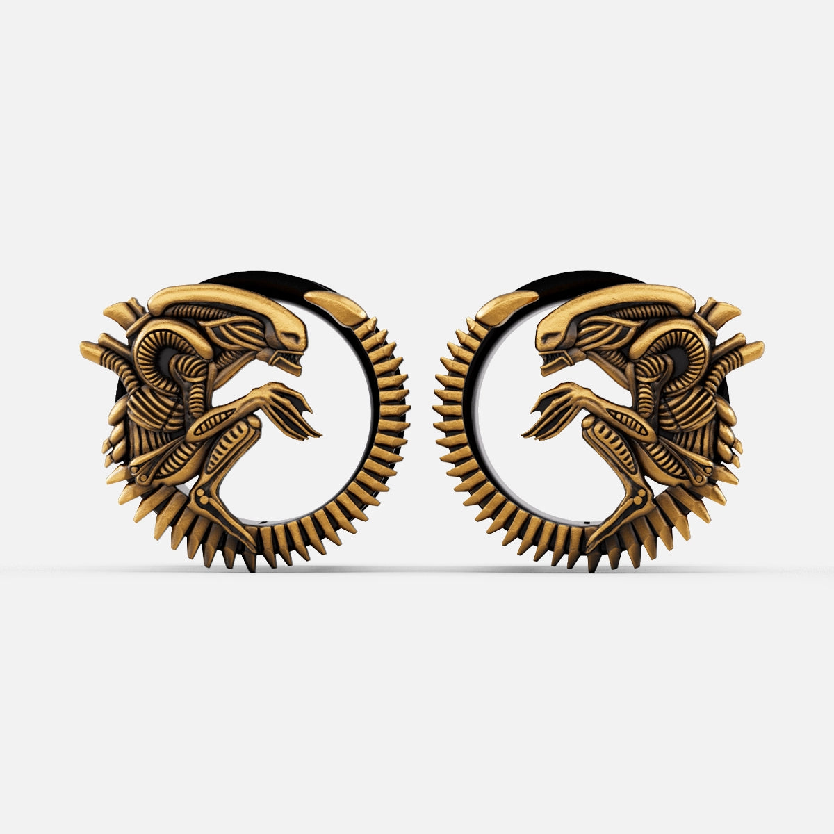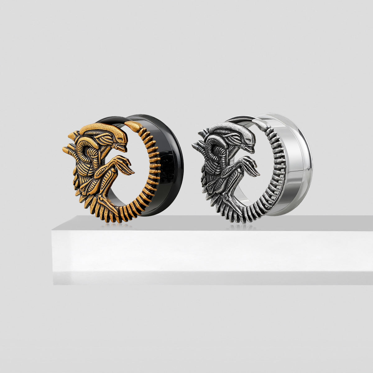 Alien Invasion Tunnels feature an intricate design with cosmic patterns and extraterrestrial motifs, crafted from high-quality surgical steel. This item is sold as a pair.