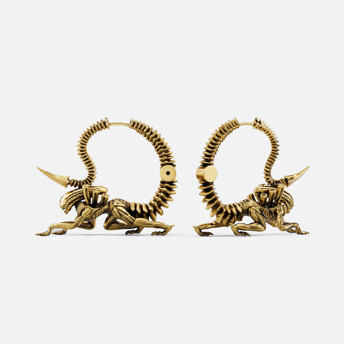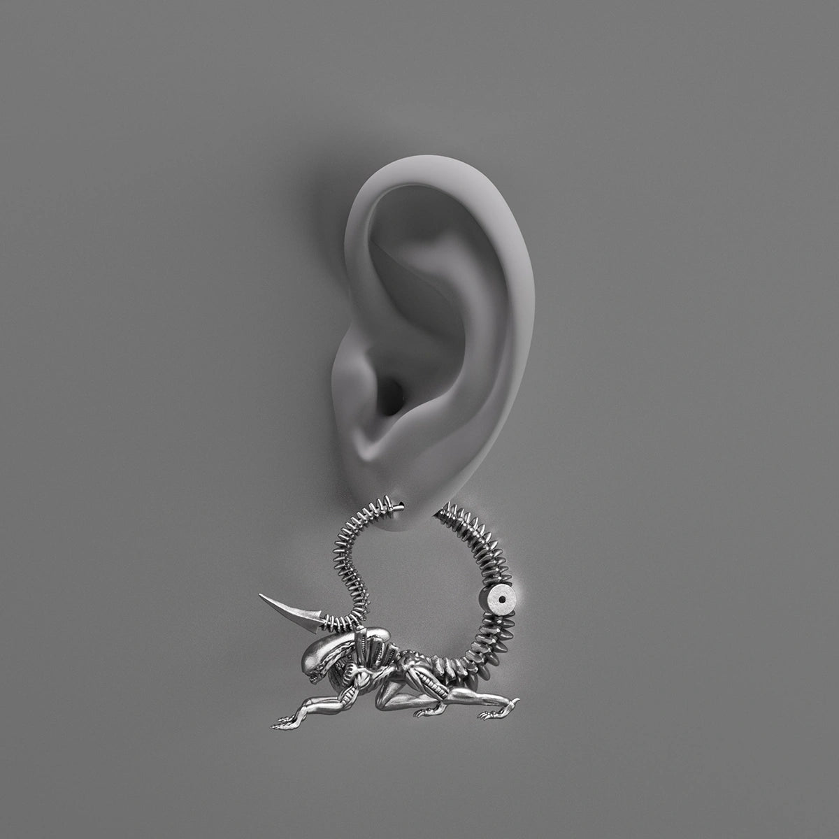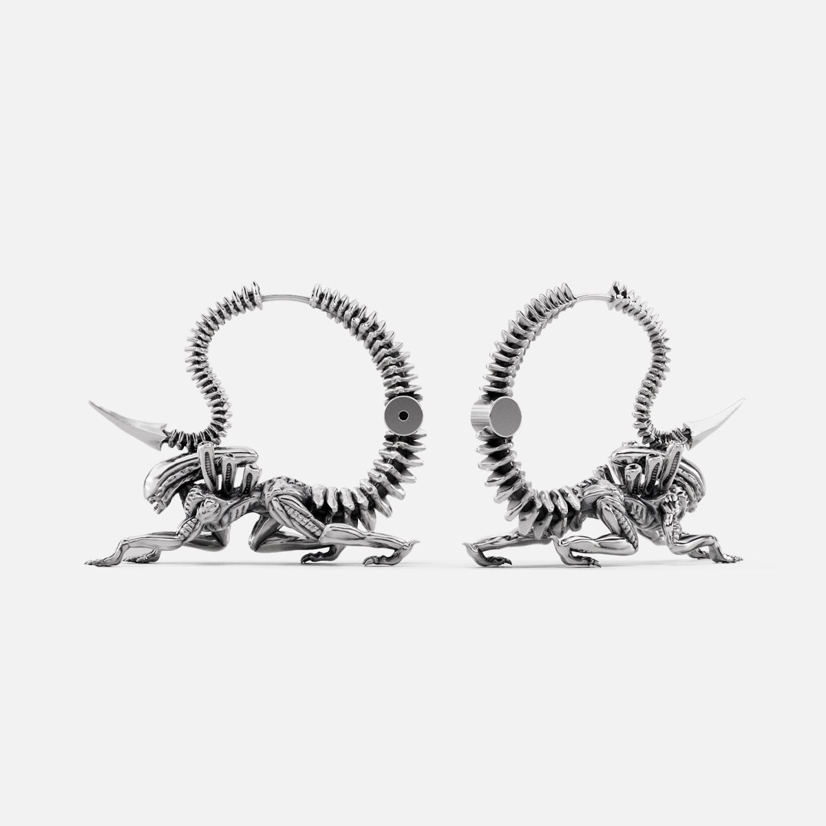 These Xenomorph Alien Earrings feature intricate biomechanical designs, inspired by the mysterious and otherworldly aesthetics of alien art. This item is sold as a pair.