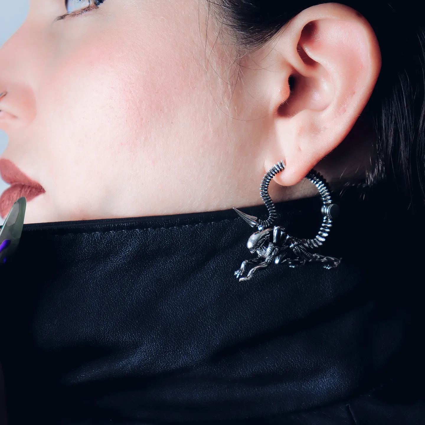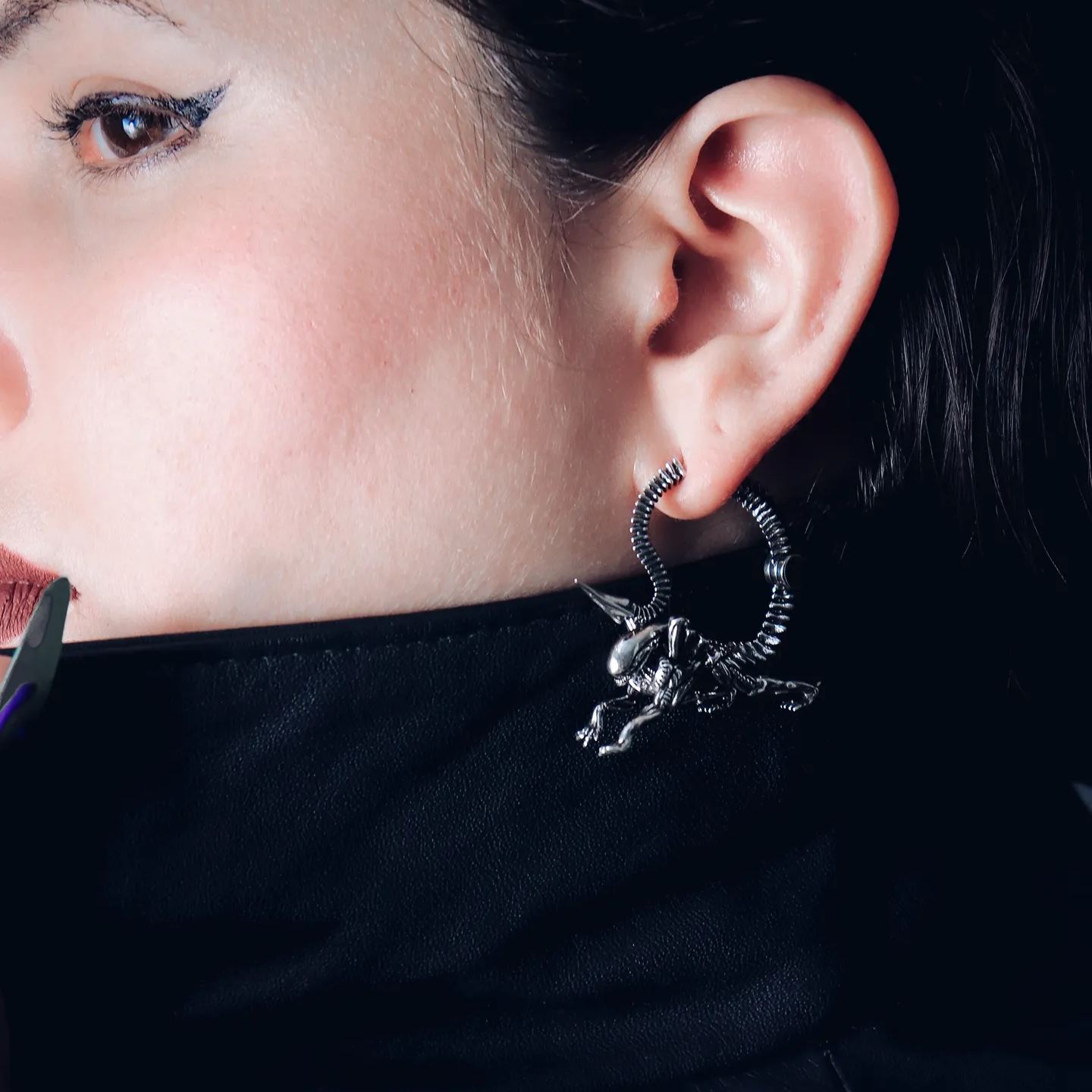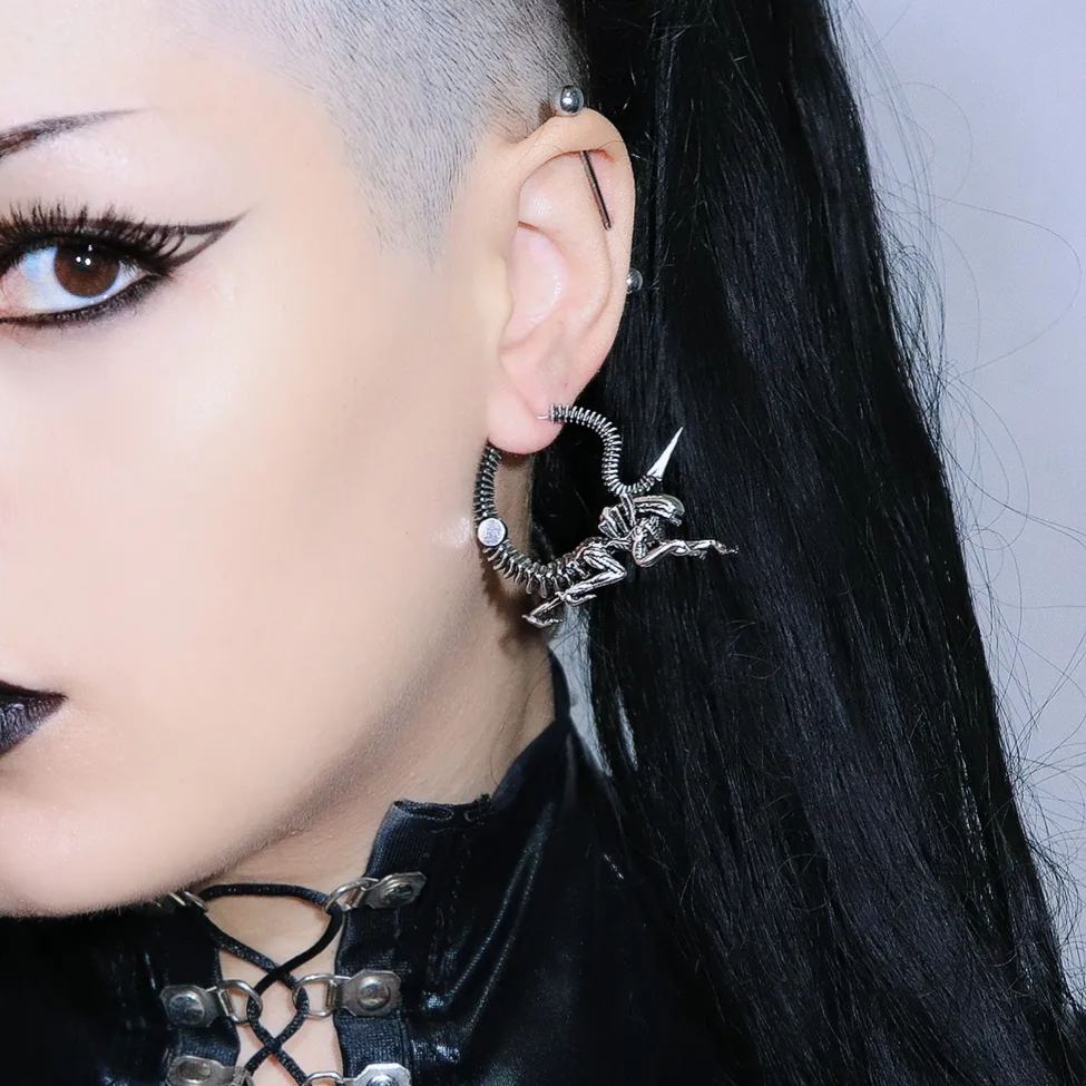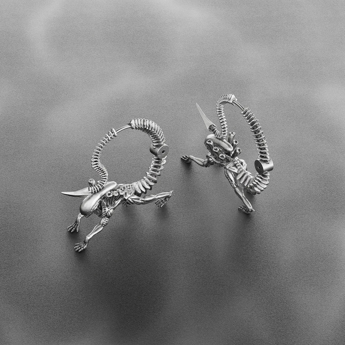 Drawing inspiration from sci-fi movies and biomechanical art, these earrings blend futuristic elements with organic forms.