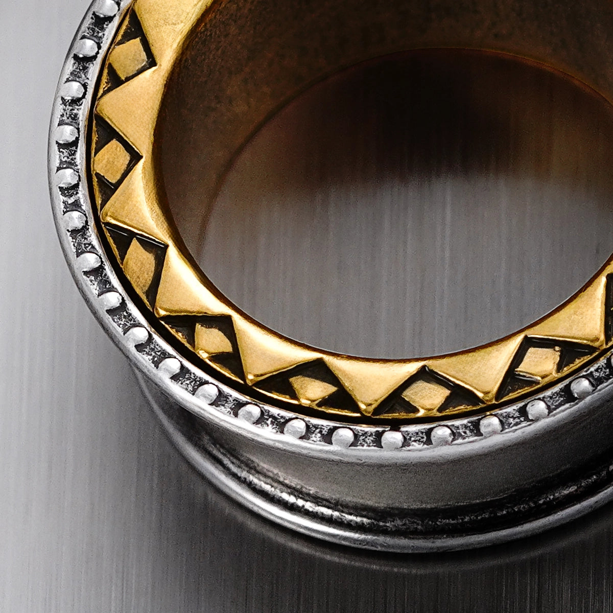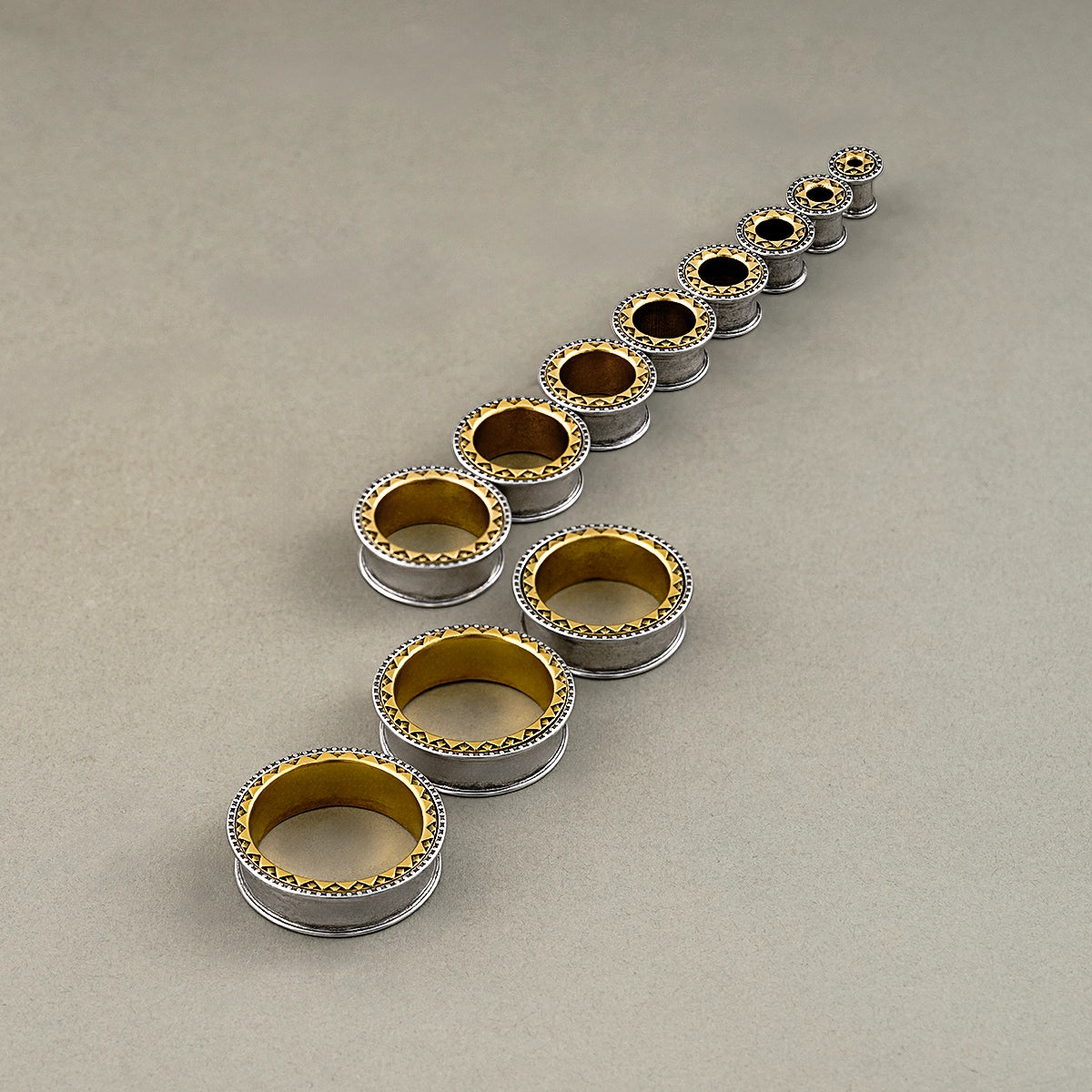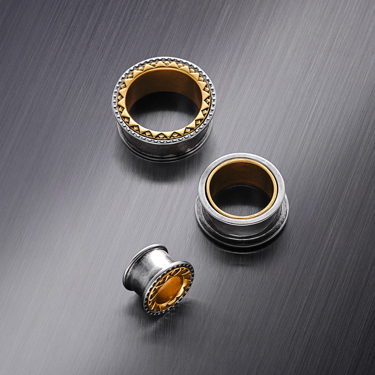 Featuring a bold metallic design, these tunnels combine silver and gold tones with intricate geometric patterns, creating a striking visual impact. This item is sold as a pair.