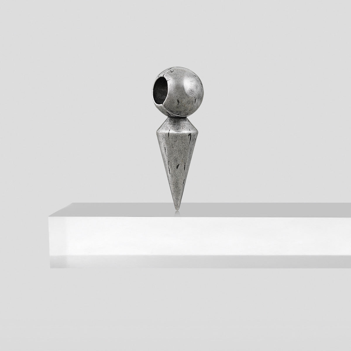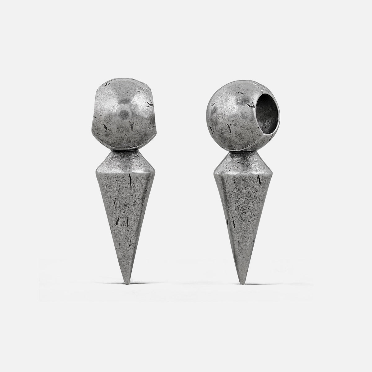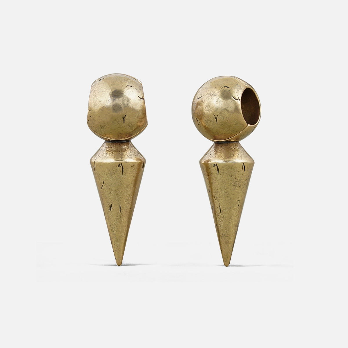 The Ancient Geometry Ear Weight features a minimalist design with a spherical top and conical bottom, finished with a textured, weathered look. This item is sold as a pair.