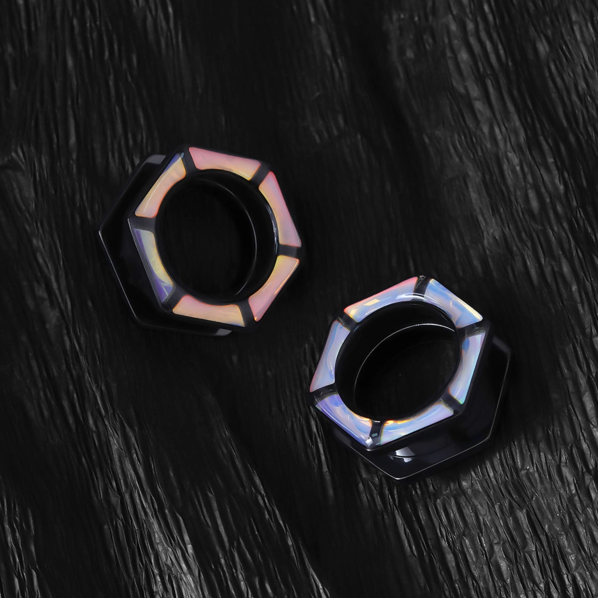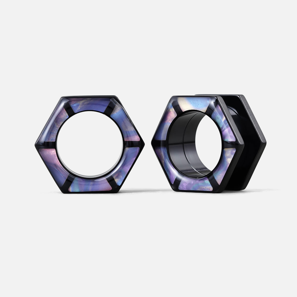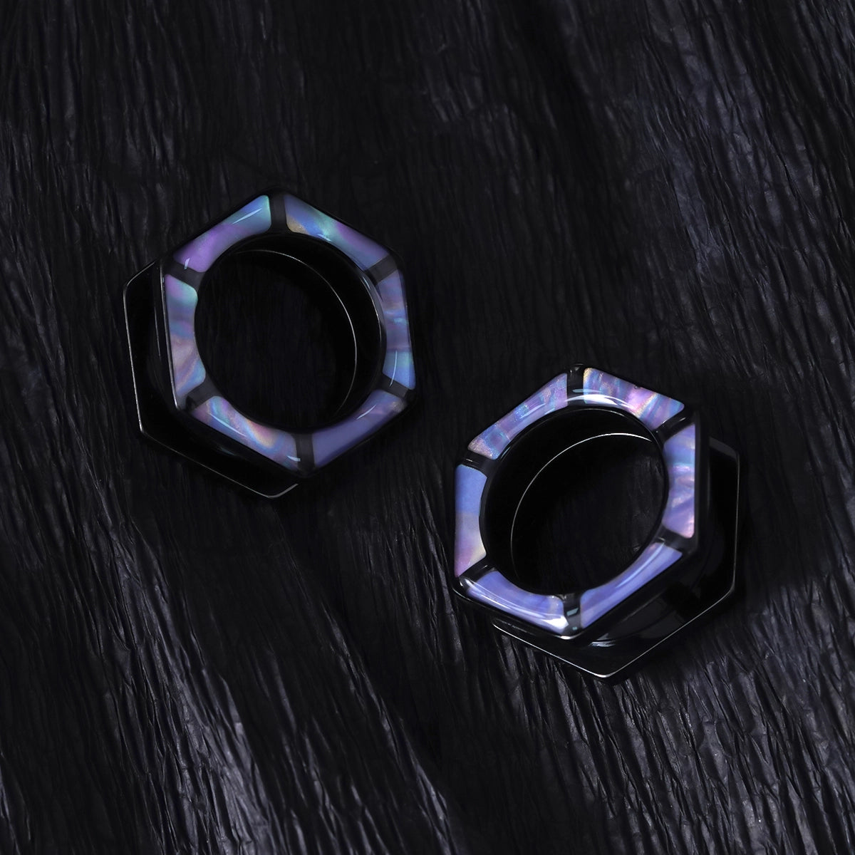 Aurora Hexagon Glow Tunnels are available in three stunning colors: turquoise green, purple, and aurora pink, each forming a unique hexagonal design. This item is sold as a pair.