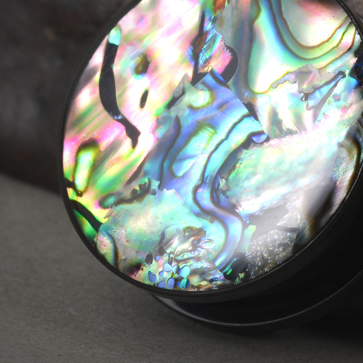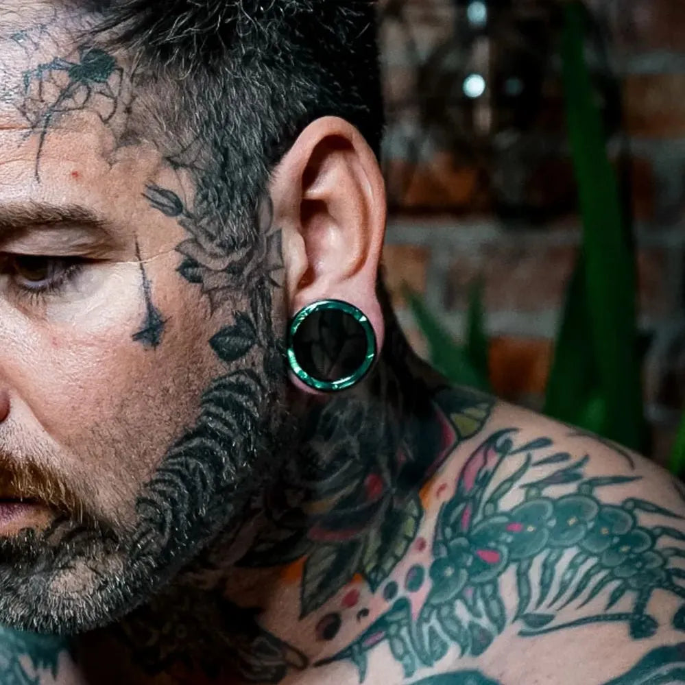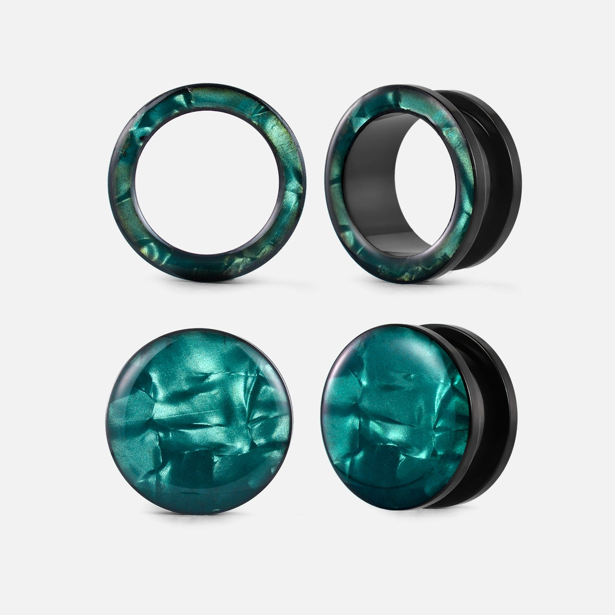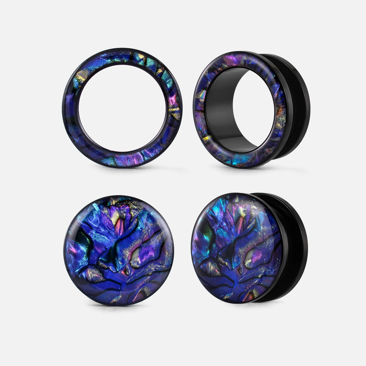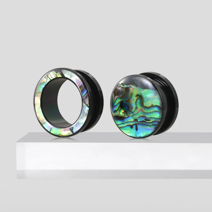 Aurora Shell Plugs feature a stunning blend of deep greens, purples, and blues with a glossy, mirror-like finish. Each pair is unique, showcasing natural shell patterns.This item is sold as a pair.