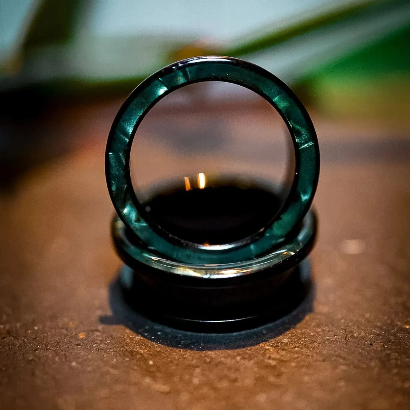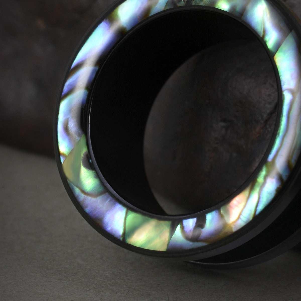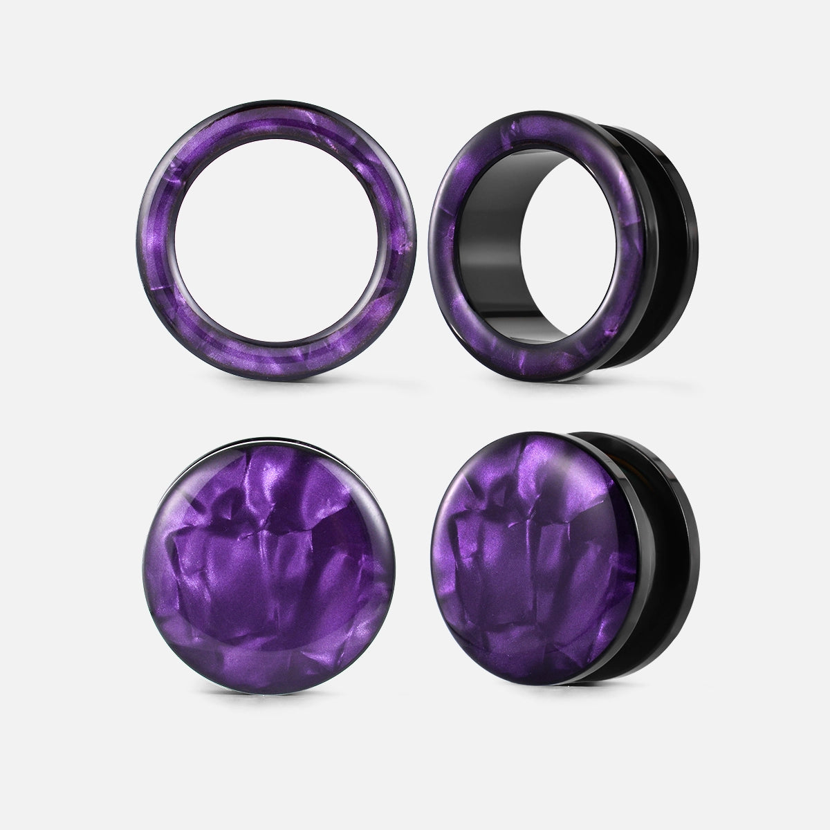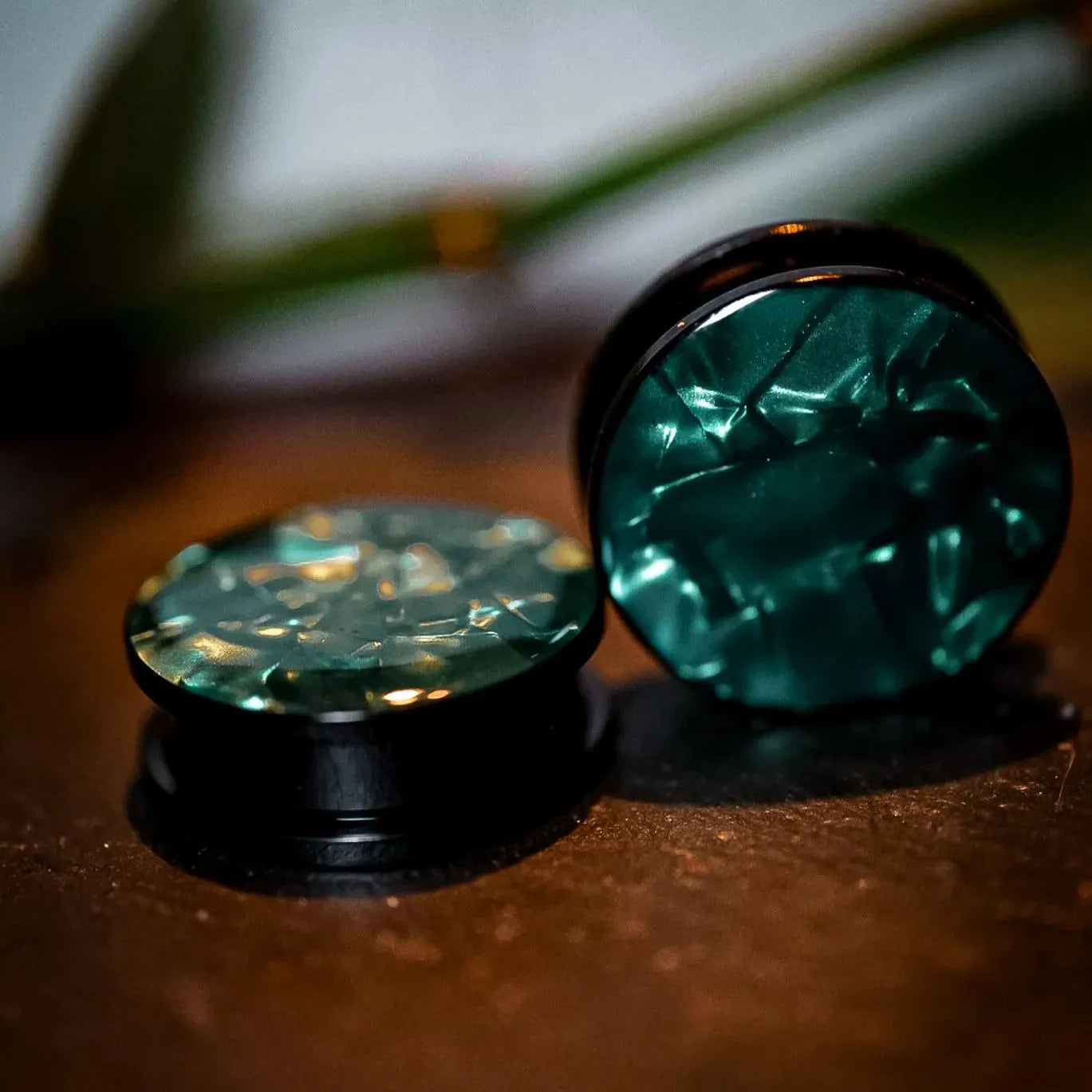 Aurora Shell Plugs feature a stunning blend of deep greens, purples, and blues with a glossy, mirror-like finish. Each pair is unique, showcasing natural shell patterns.This item is sold as a pair.
