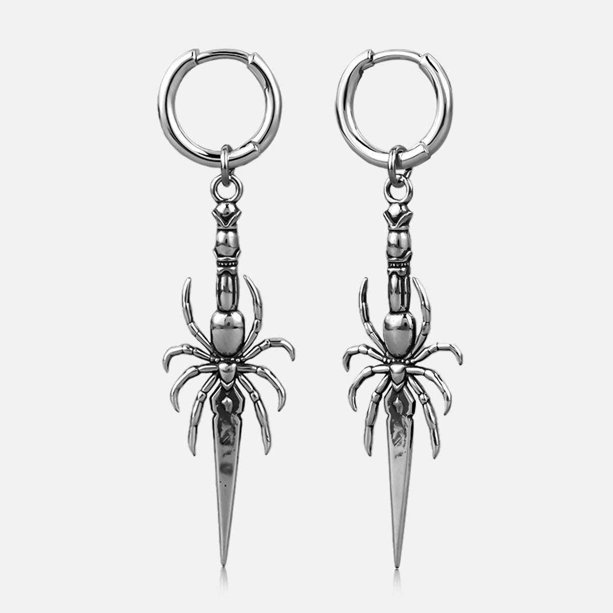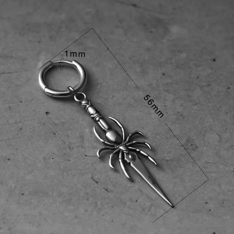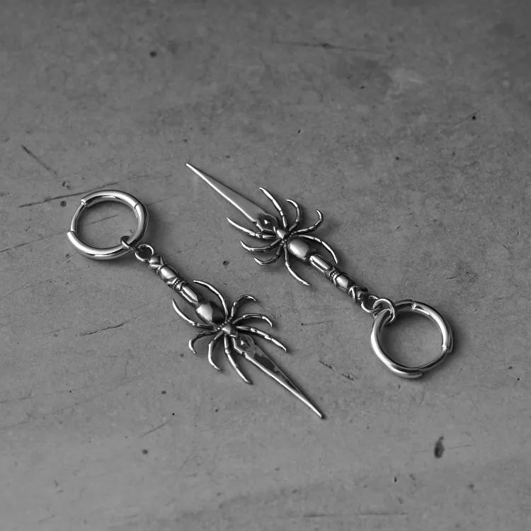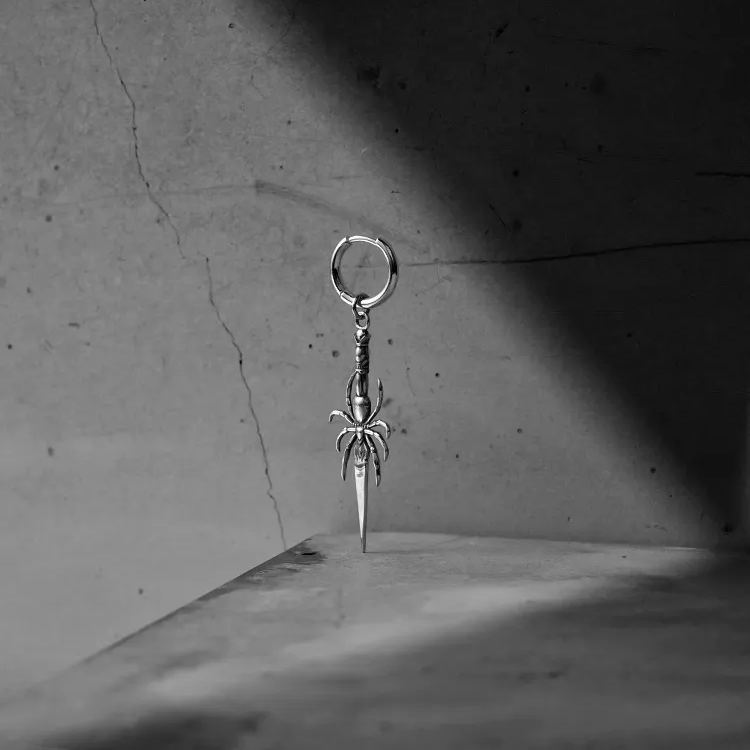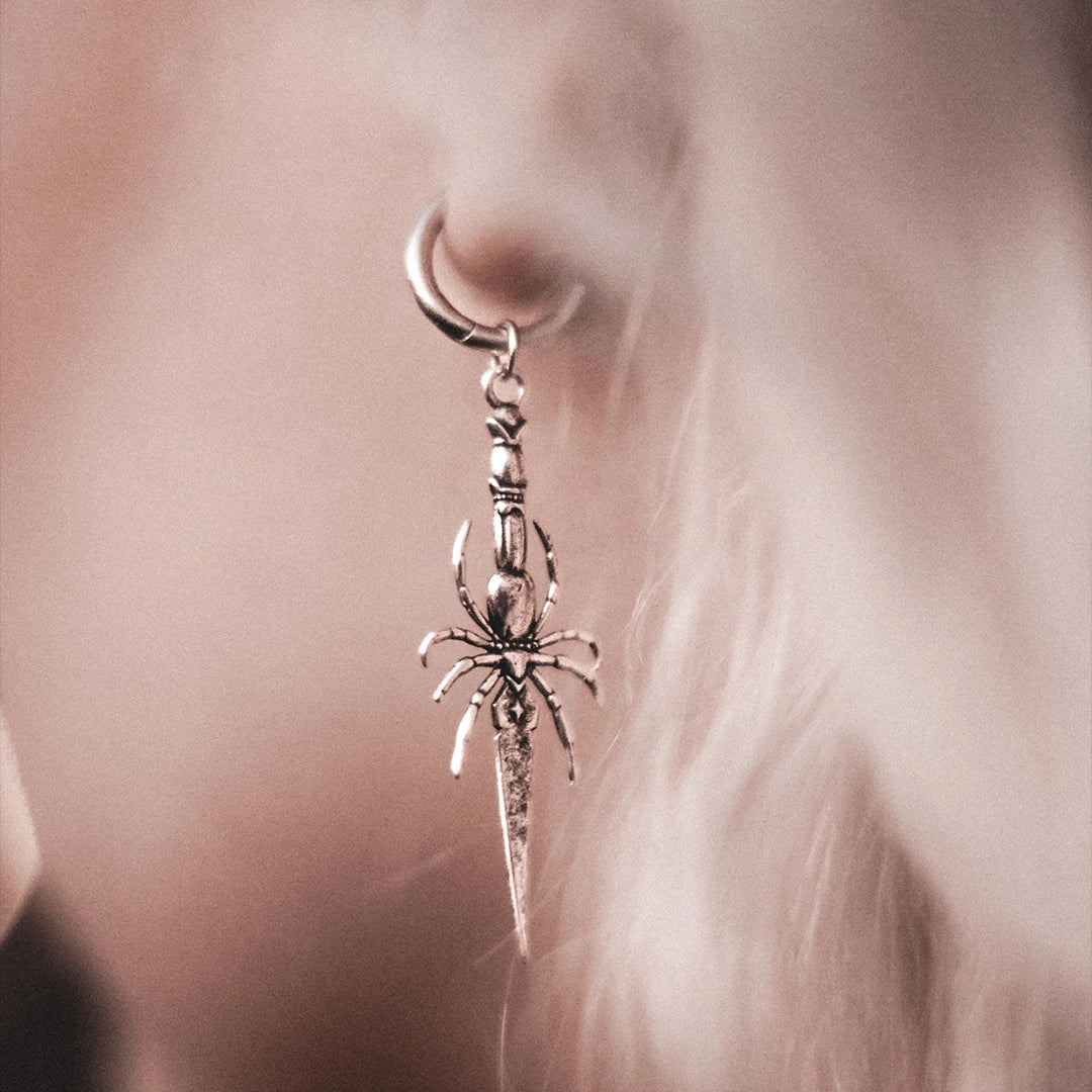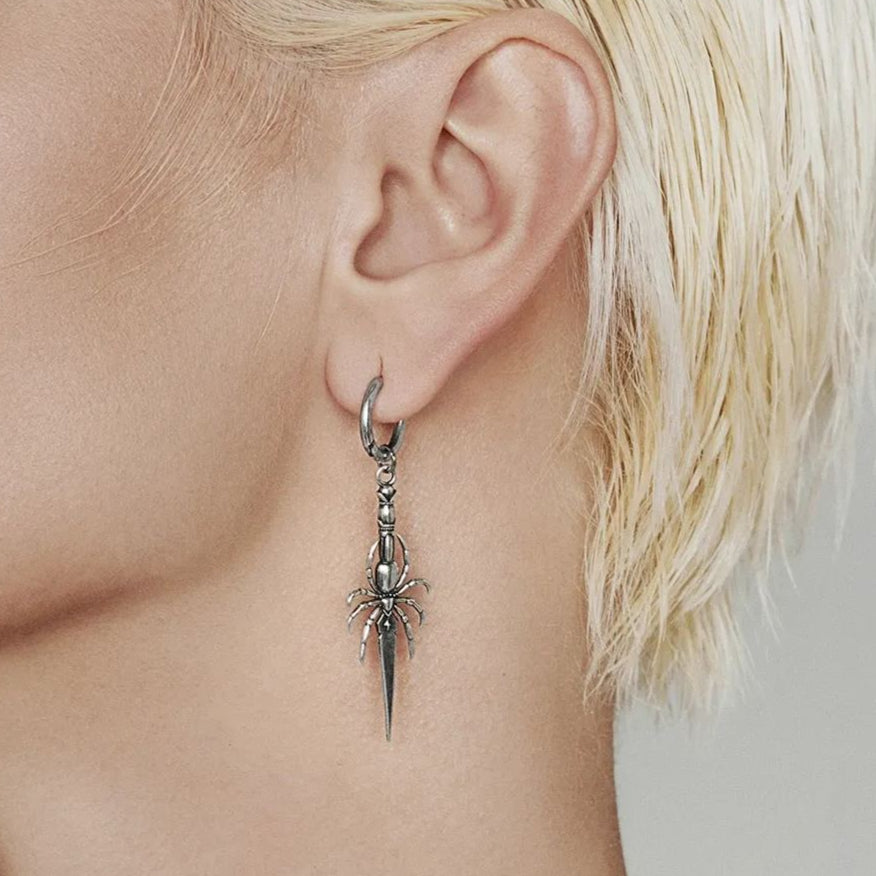 Intricately designed, these earrings feature a spider holding a delicate blade, exuding a gothic charm.This item is sold as a pair.
