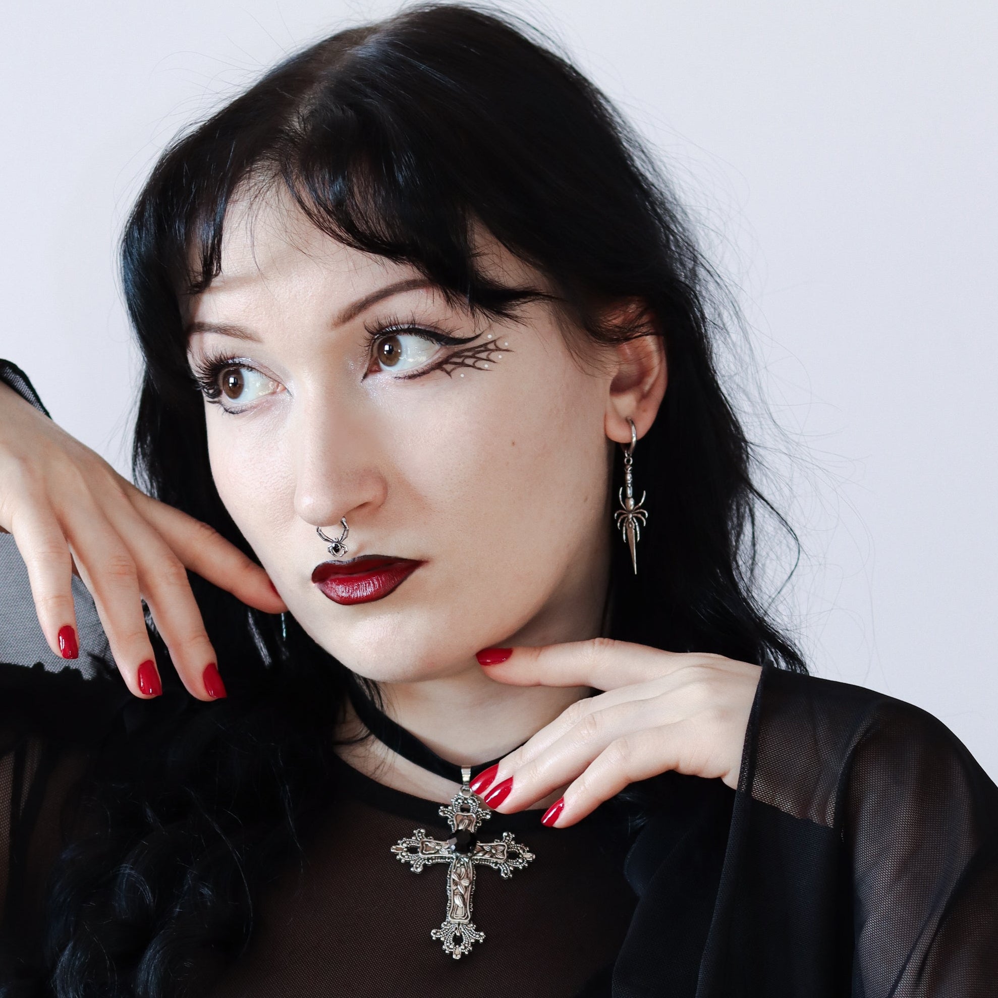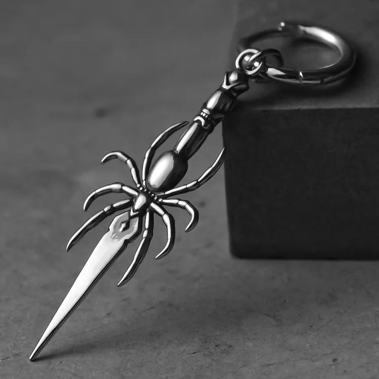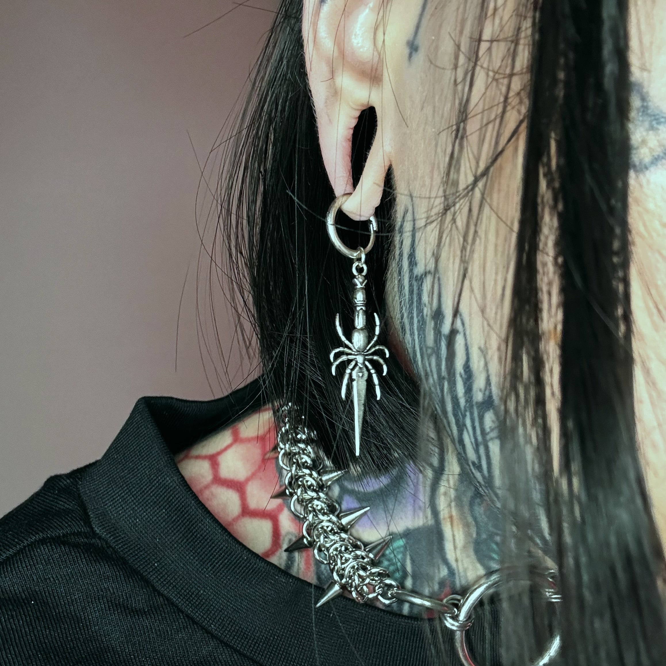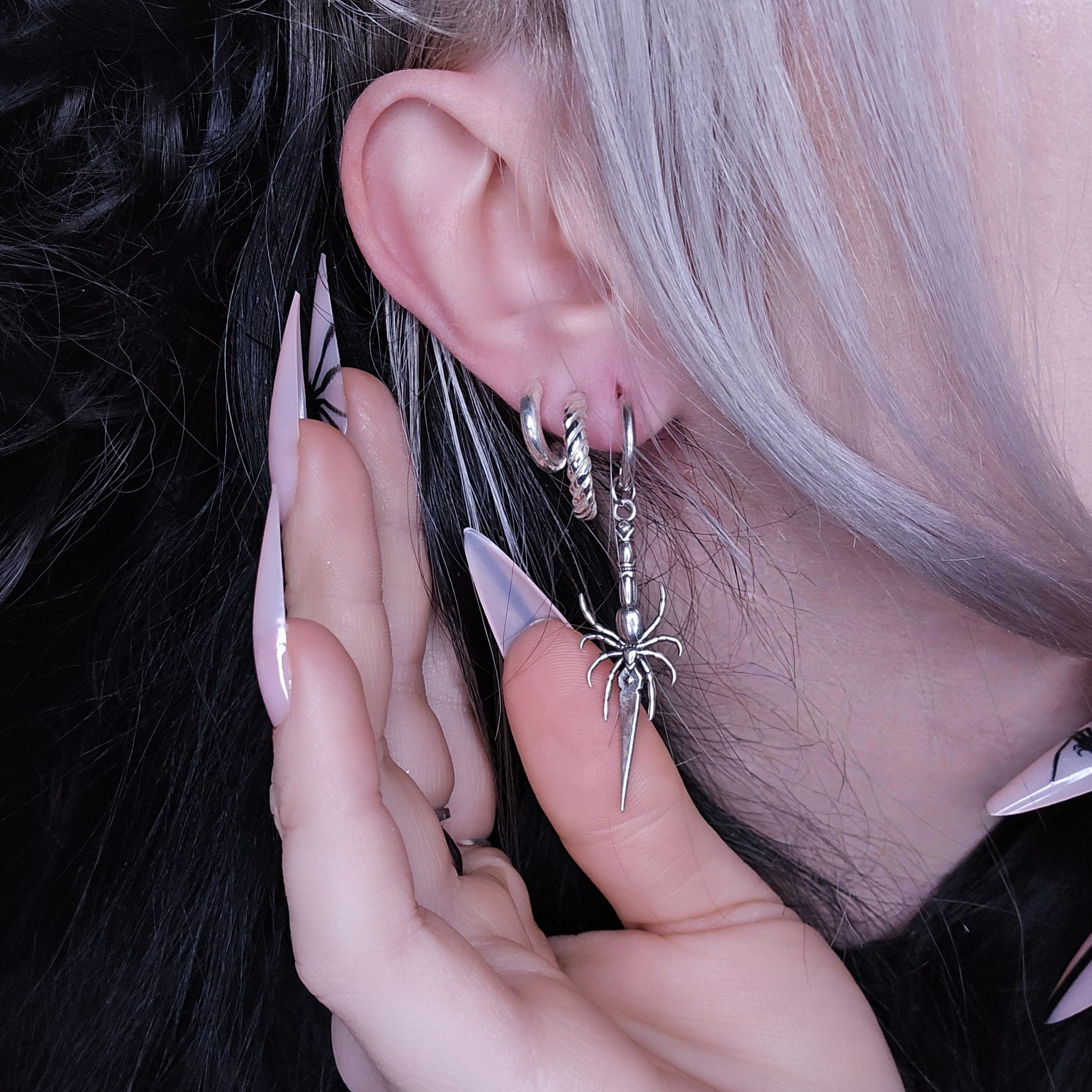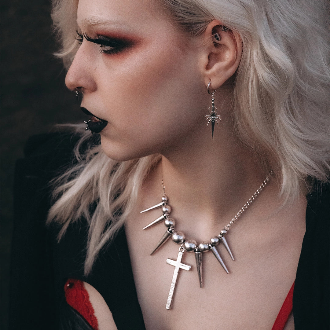 Intricately designed, these earrings feature a spider holding a delicate blade, exuding a gothic charm.This item is sold as a pair.