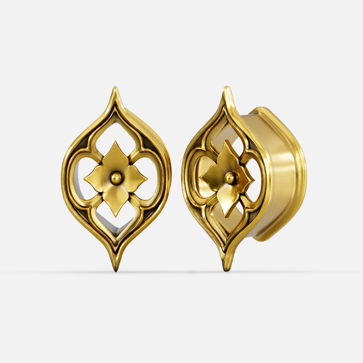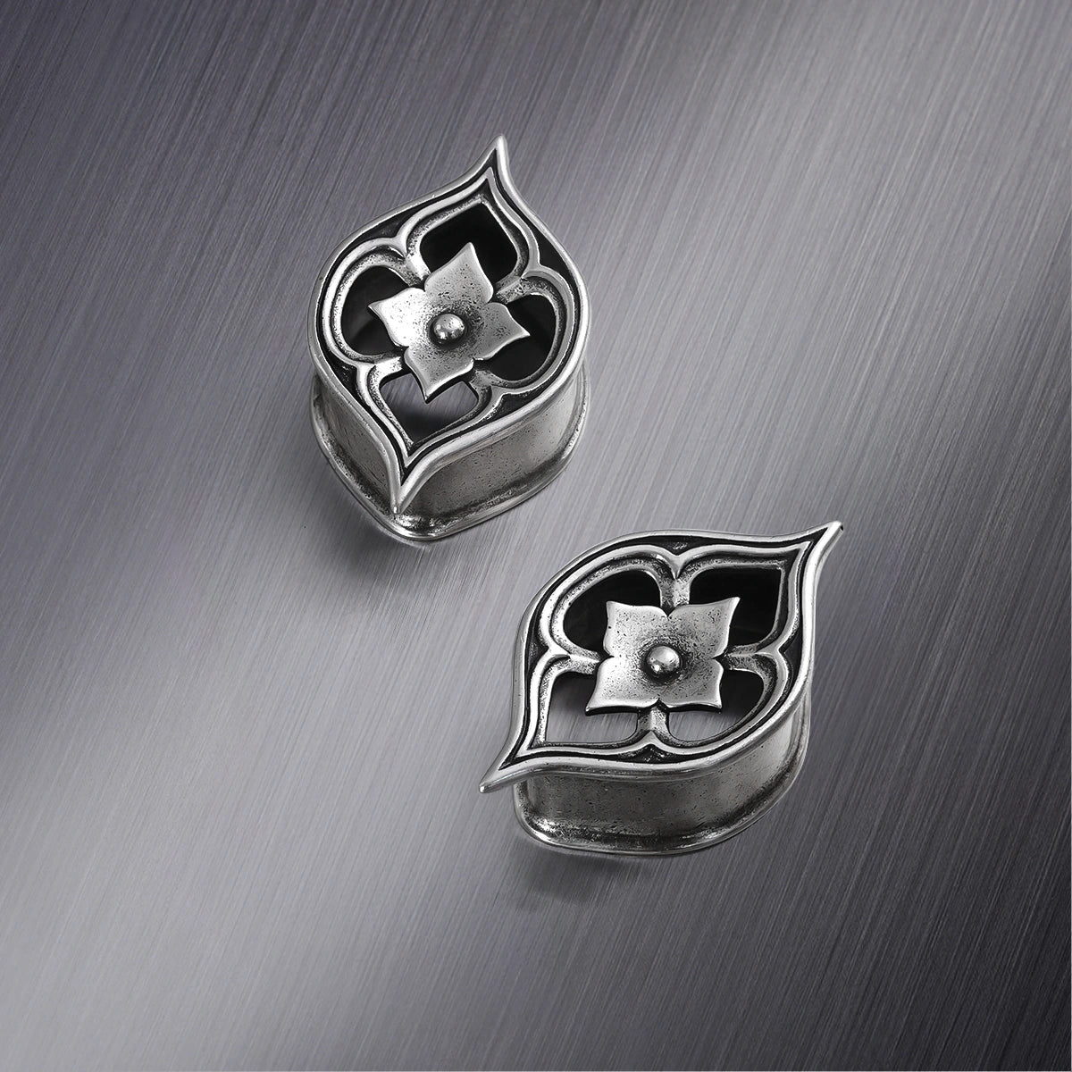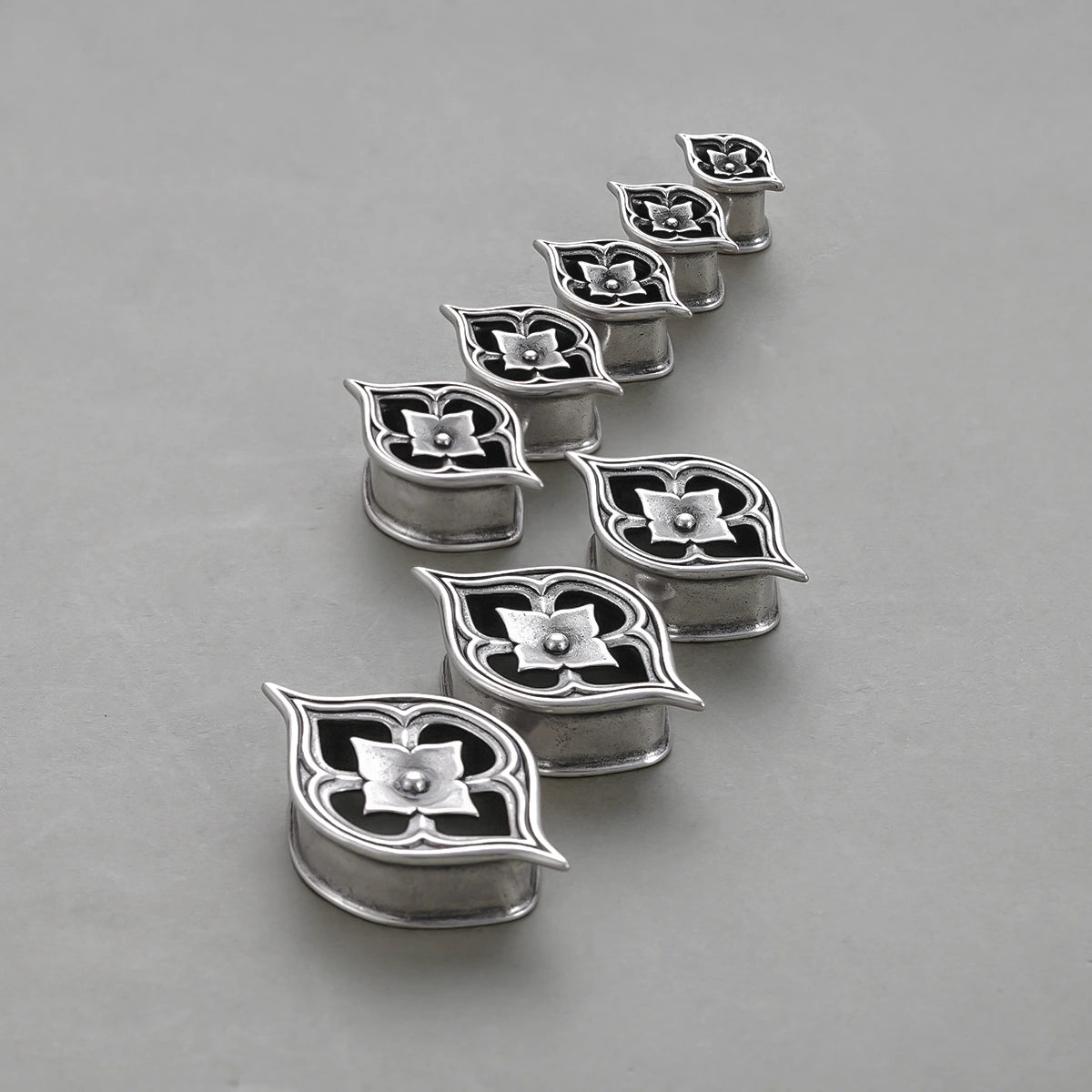 Cathedral Petal Tunnels feature exquisite petal shapes with intricate carvings, reminiscent of Gothic cathedral windows. This item is sold as a pair.
