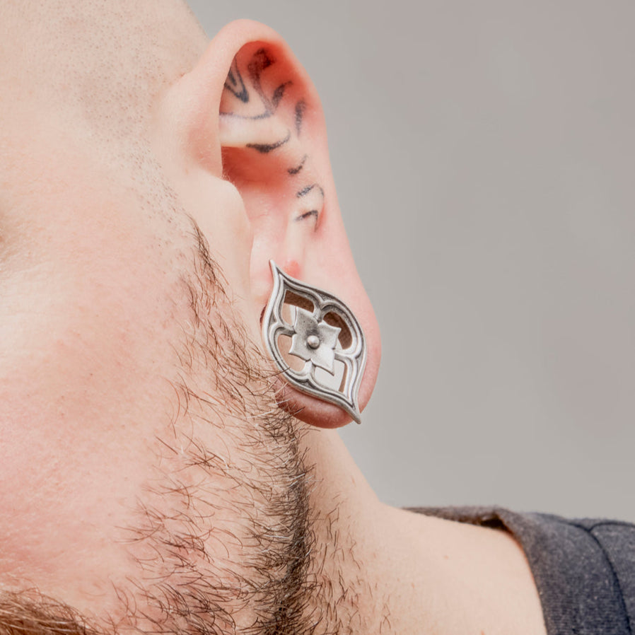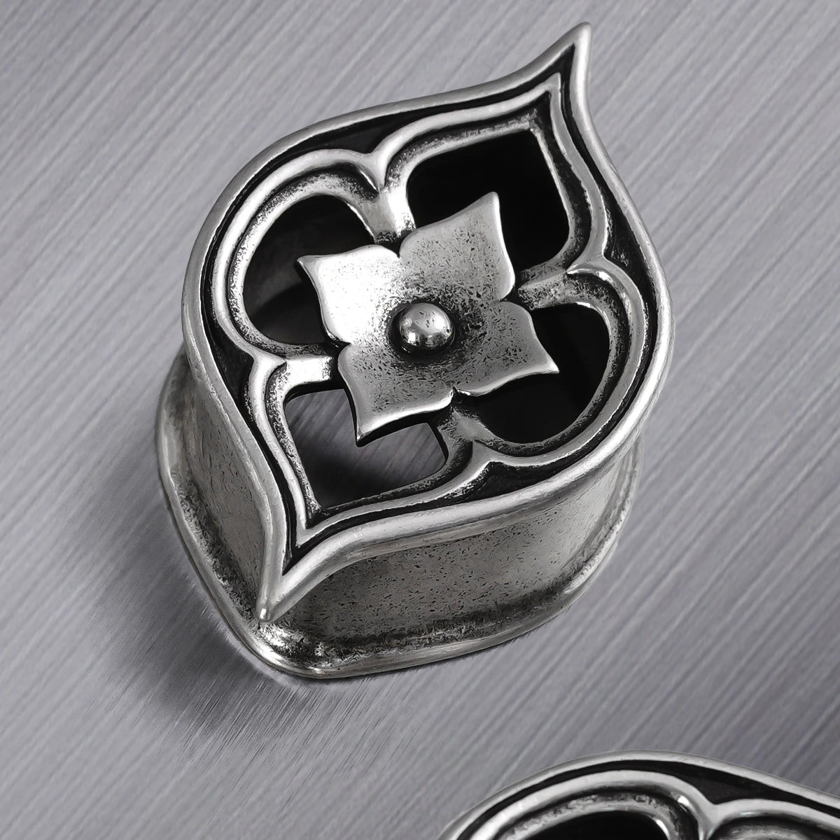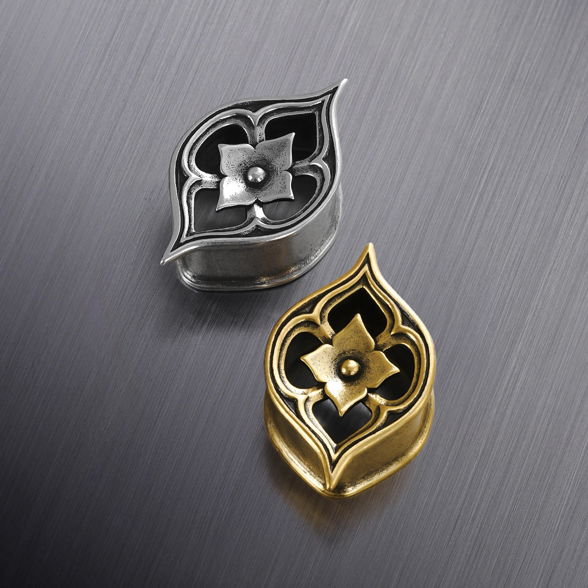Cathedral Petal Tunnels feature exquisite petal shapes with intricate carvings, reminiscent of Gothic cathedral windows. This item is sold as a pair.