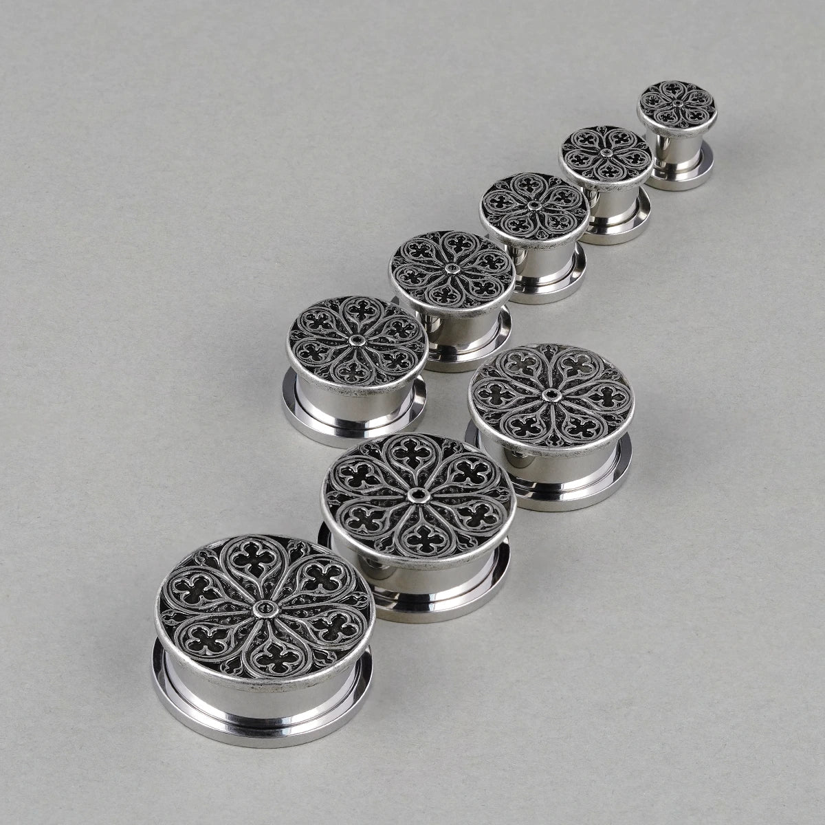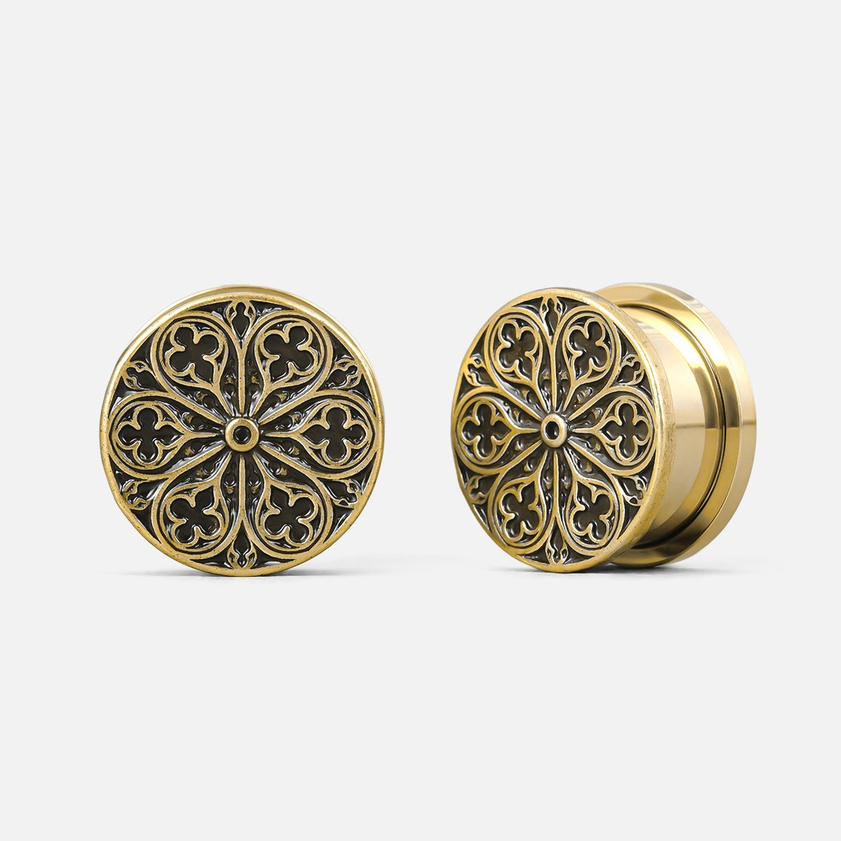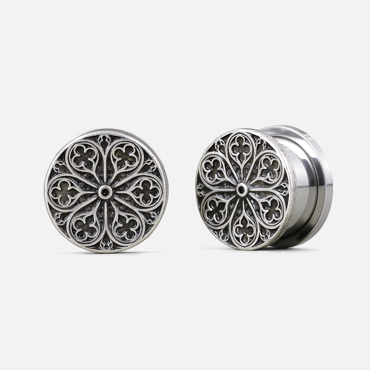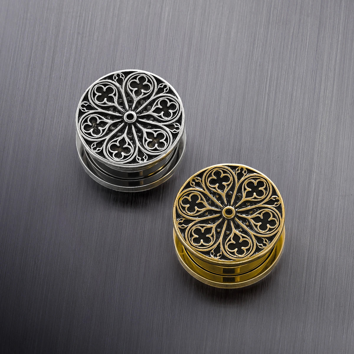 Cathedral Rose Plugs feature an intricate design inspired by the stunning stained glass windows of Gothic cathedrals, capturing the elegance of historical architecture. This item is sold as a pair.
