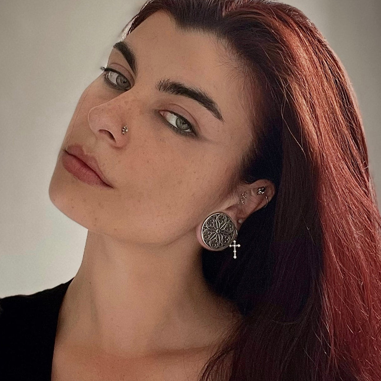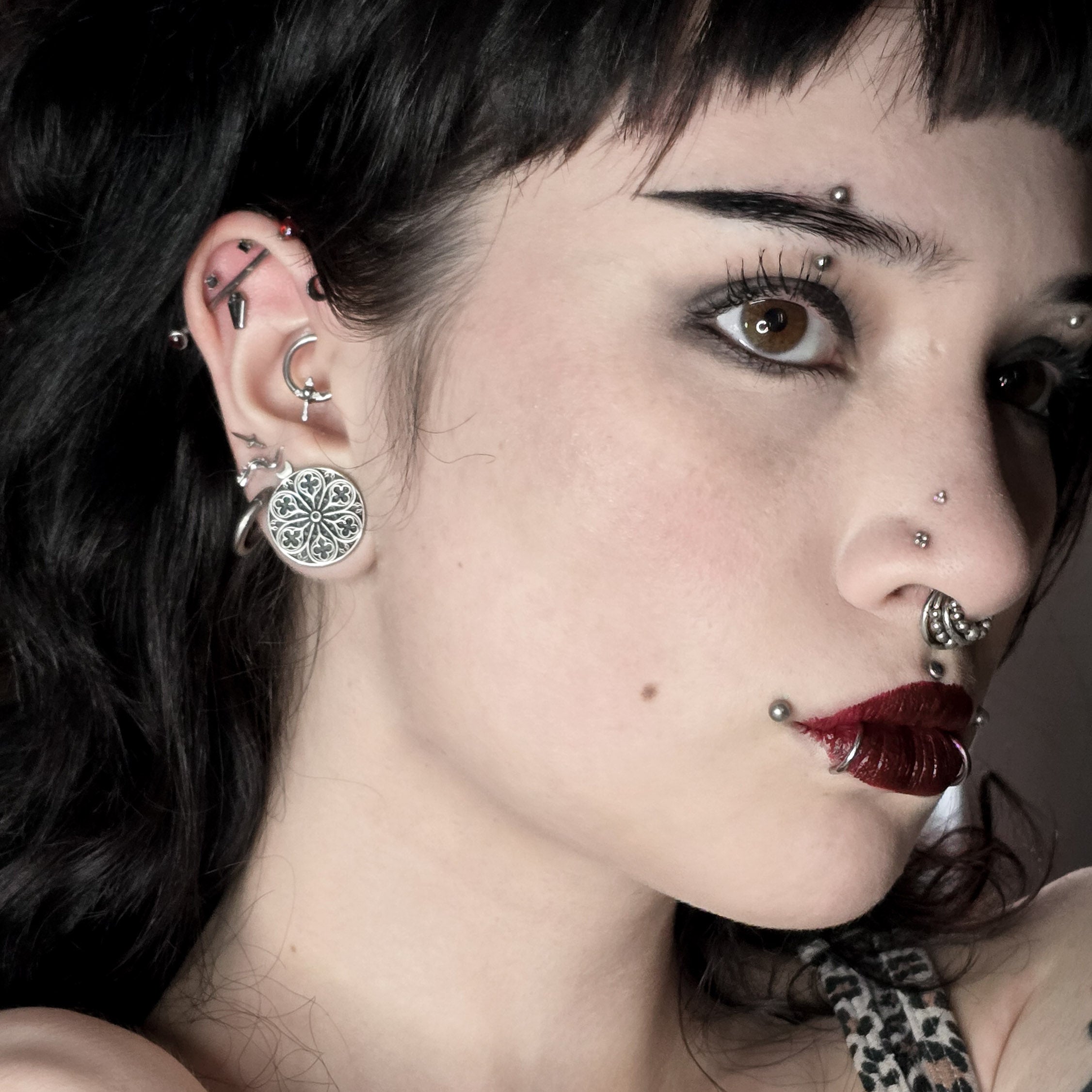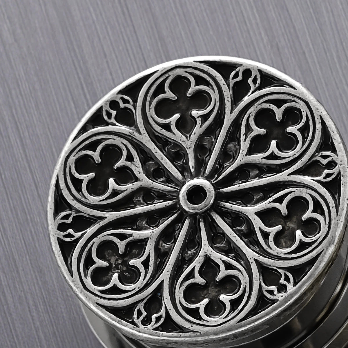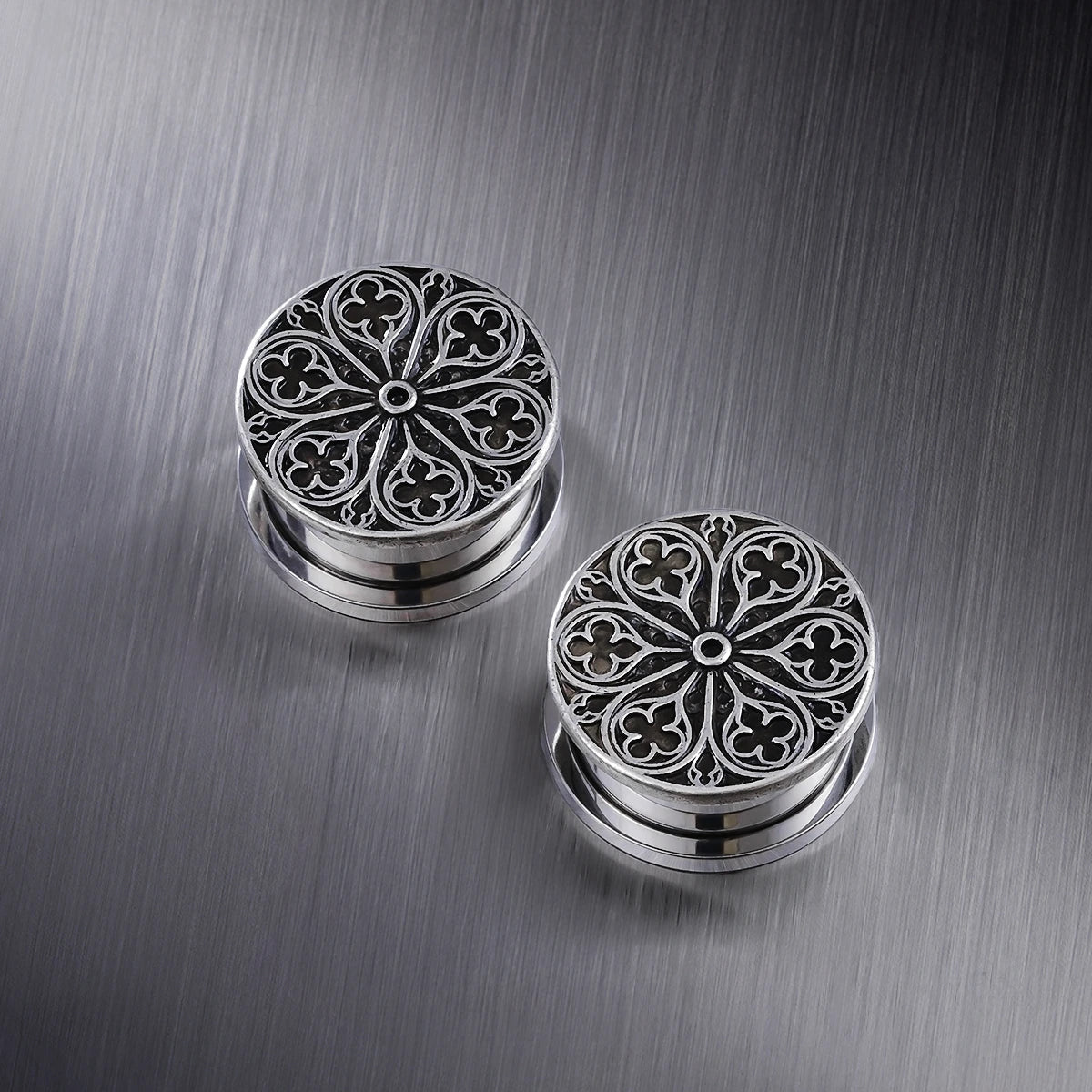Cathedral Rose Plugs feature an intricate design inspired by the stunning stained glass windows of Gothic cathedrals, capturing the elegance of historical architecture. This item is sold as a pair.