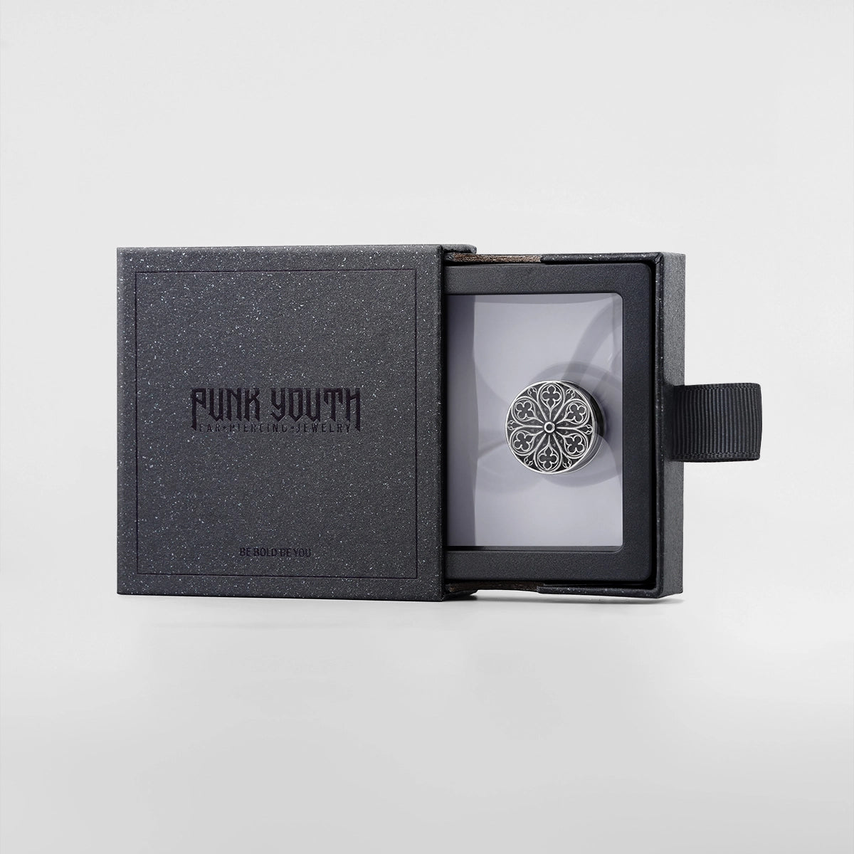 The design draws inspiration from the timeless beauty of rose windows, blending art and spirituality into a wearable form.