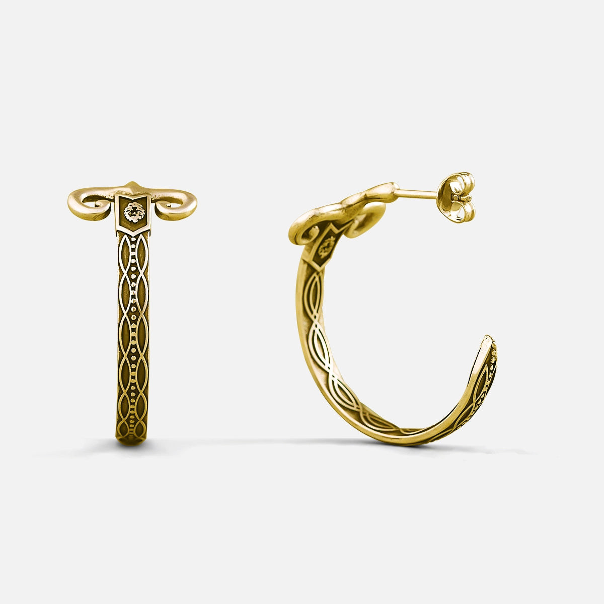 With a design reminiscent of a celestial sword, these earrings feature intricate patterns that blend classical architecture and Celtic art. This item is sold as a pair.