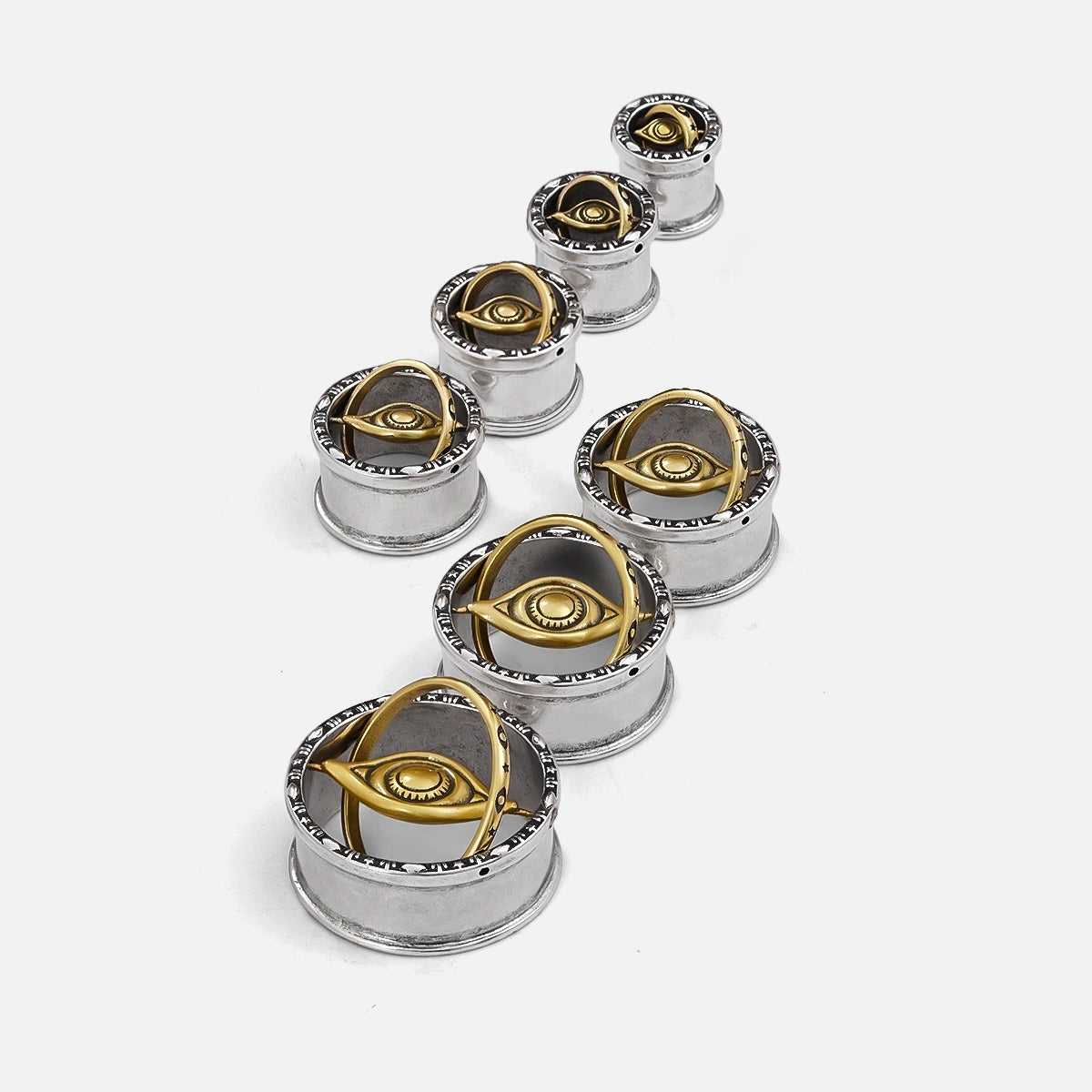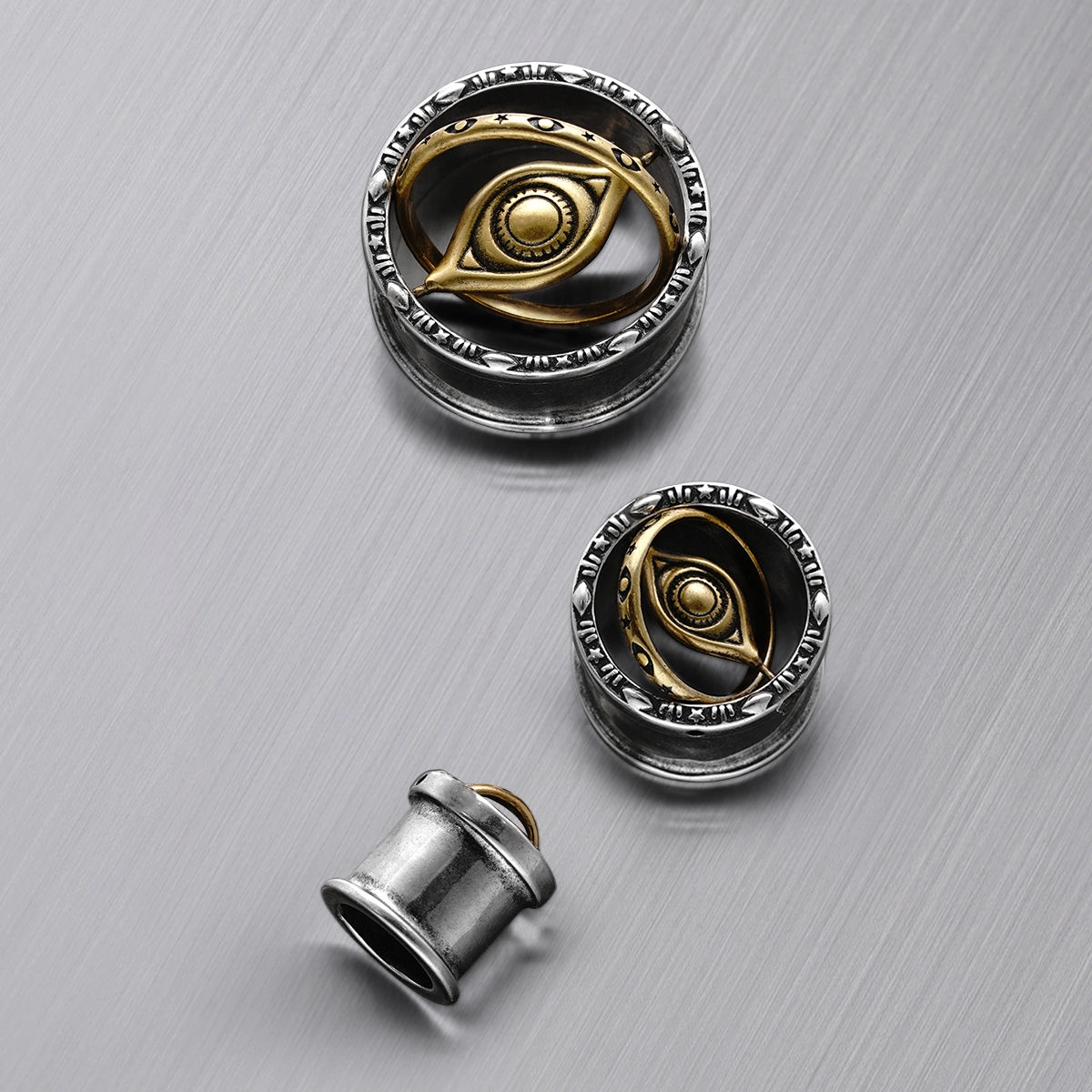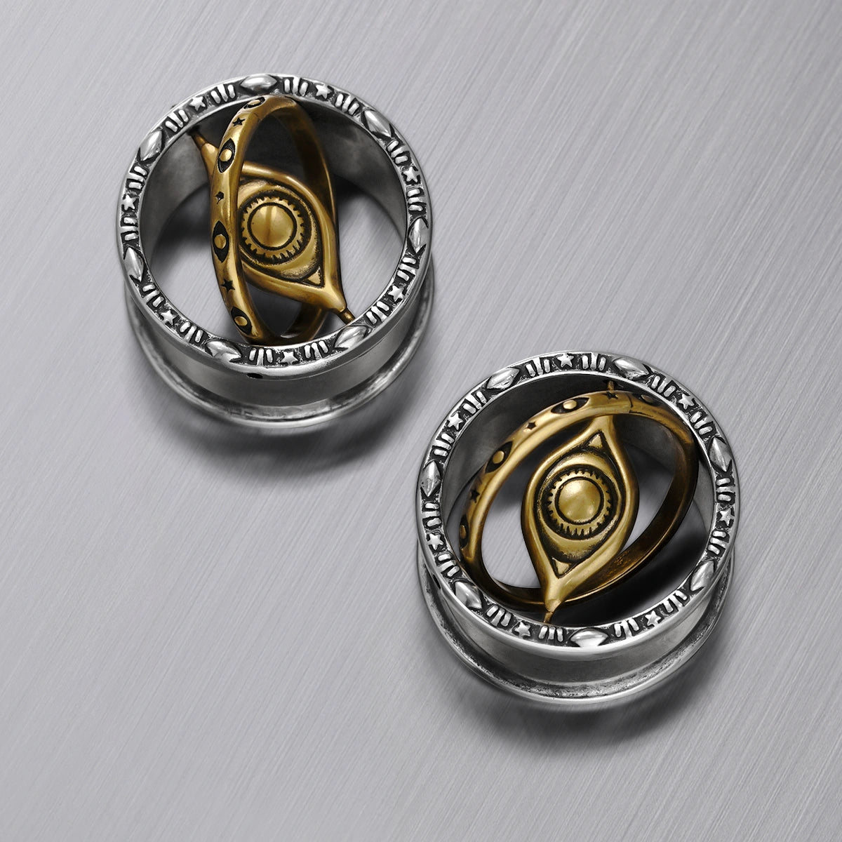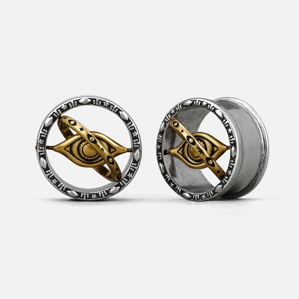 Crafted in dual-tone metal, these tunnels feature a golden cosmic eye suspended in orbit, framed by engraved mystical runes. This item is sold as a pair.
