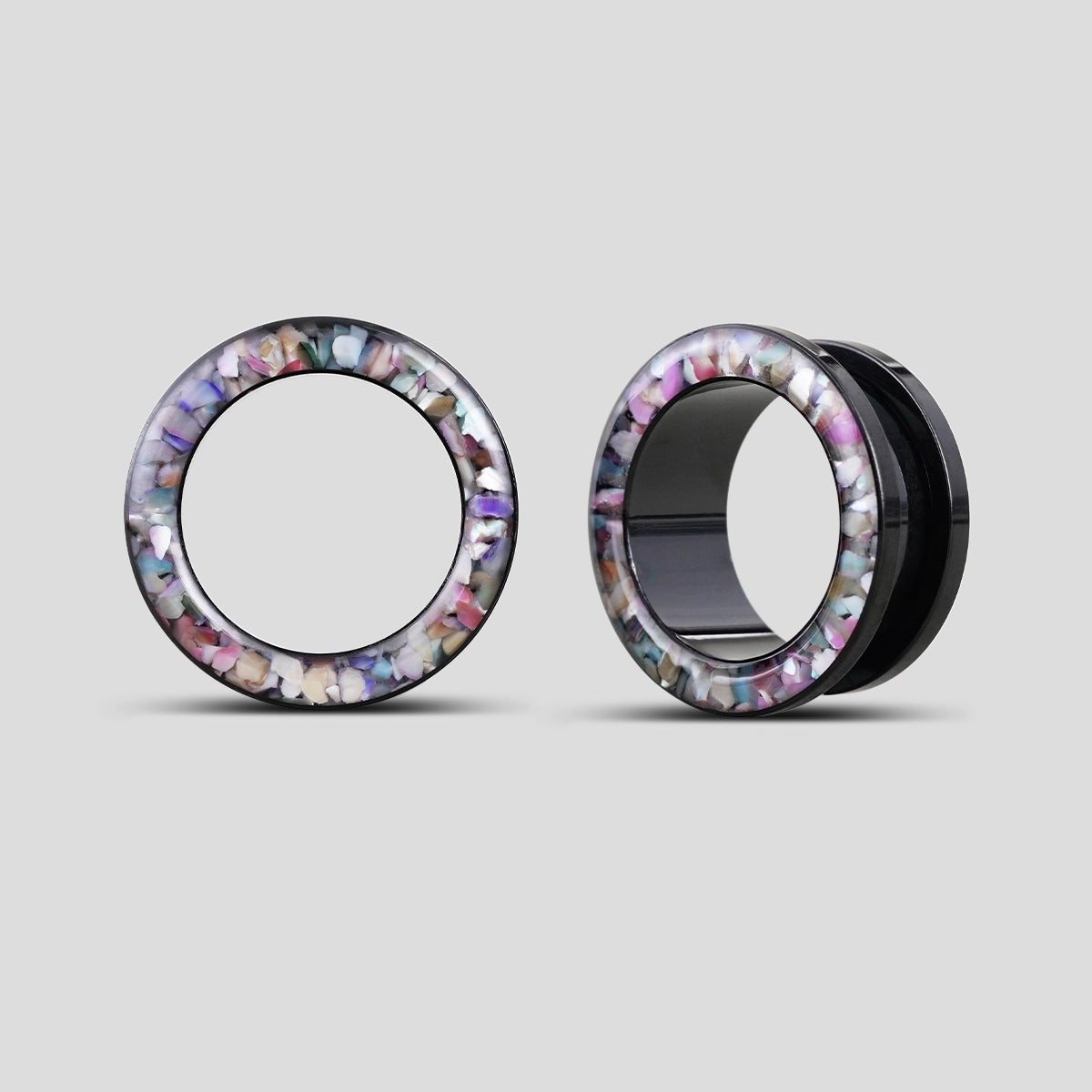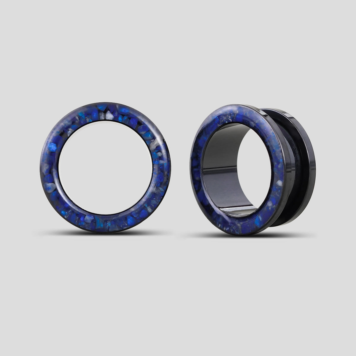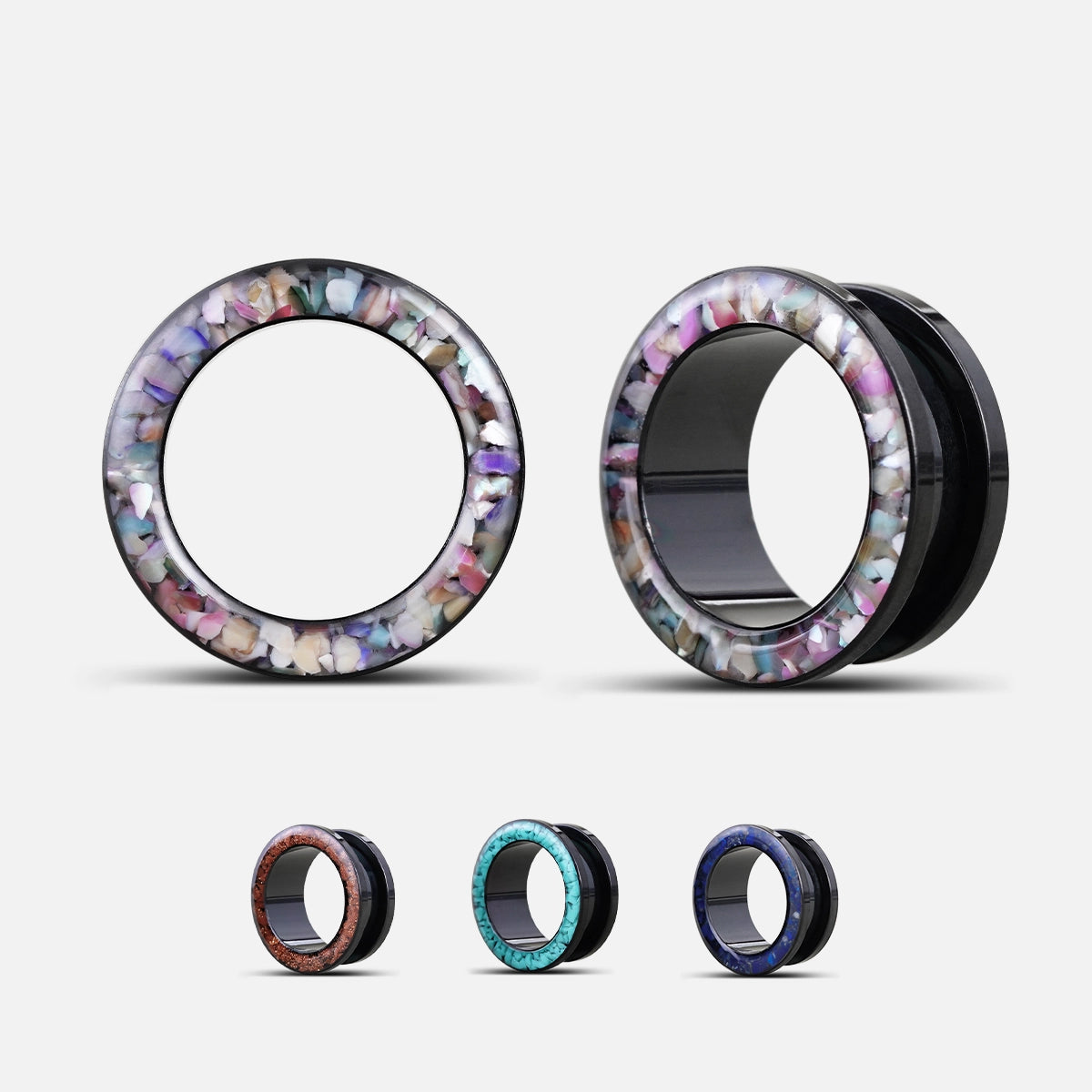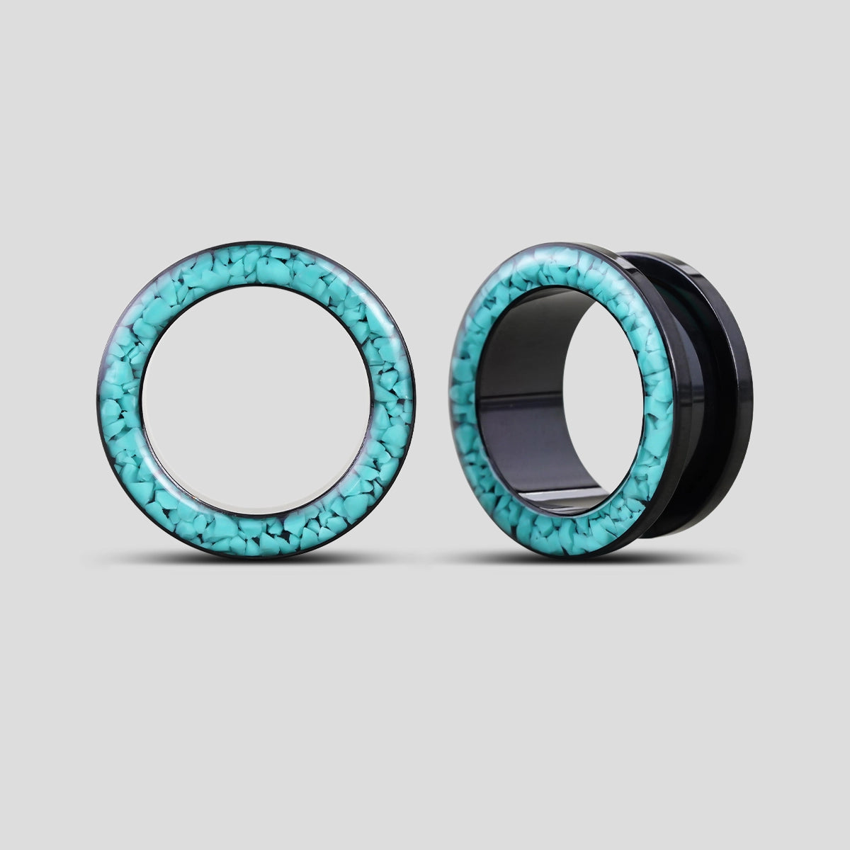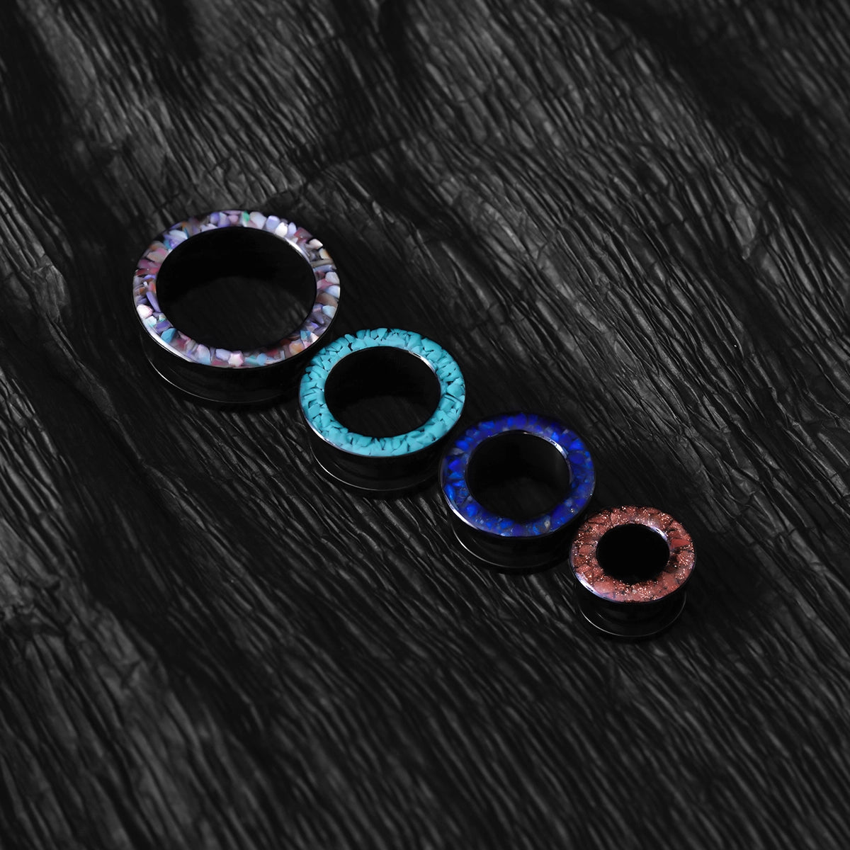 These tunnels feature a sleek, circular design with vibrant inlays of turquoise, tourmaline, lapis lazuli, and goldstone, offering a unique and elegant look. This item is sold as a pair.
