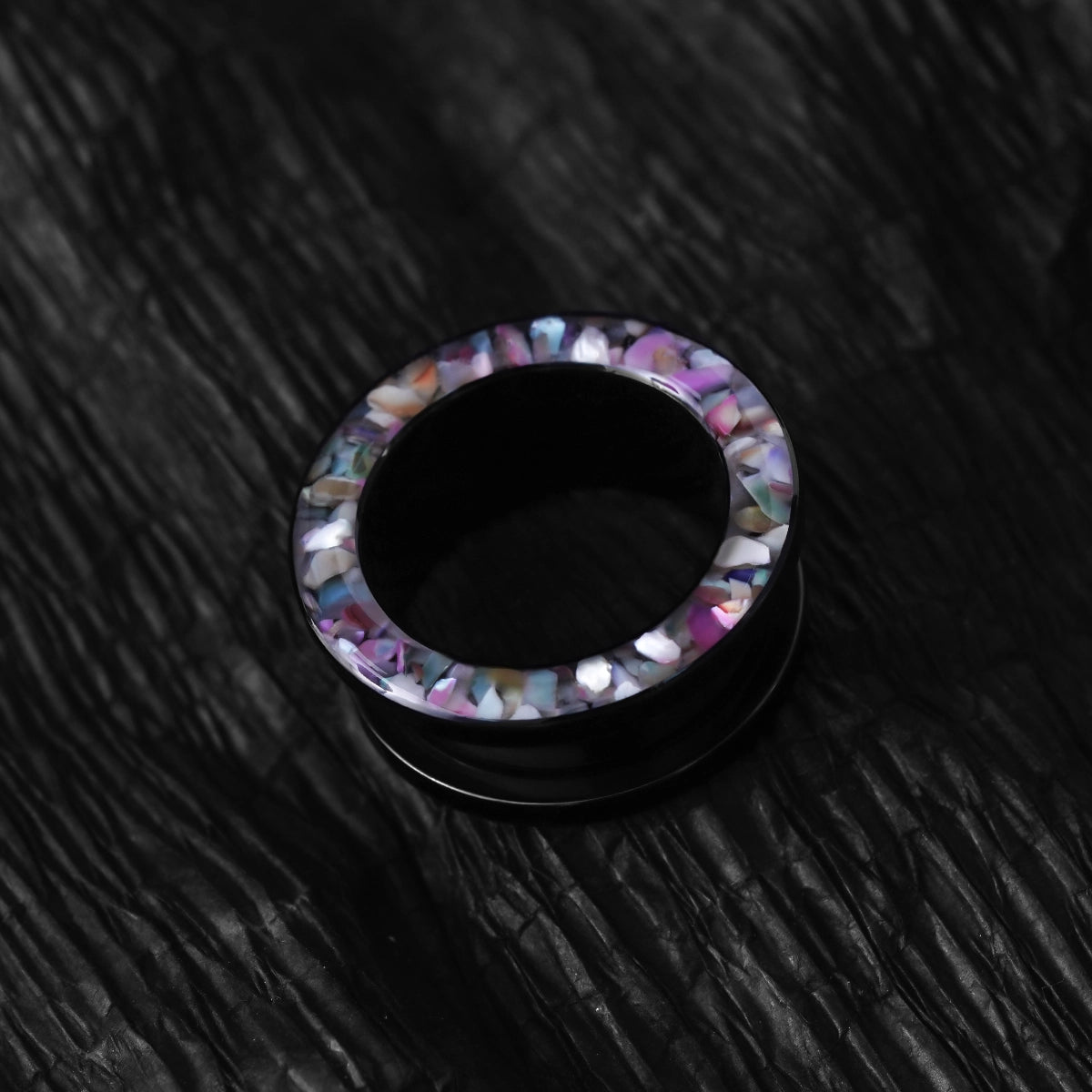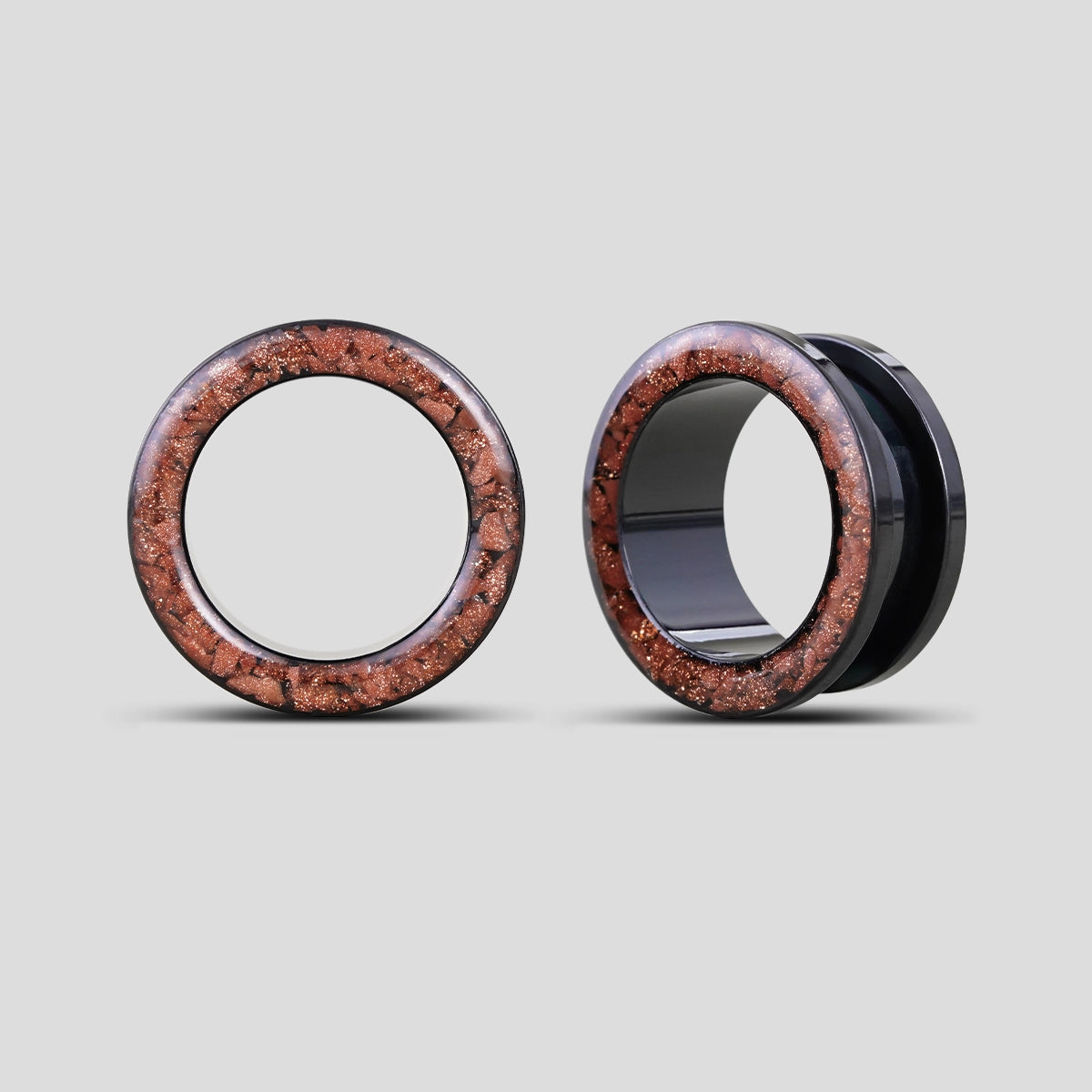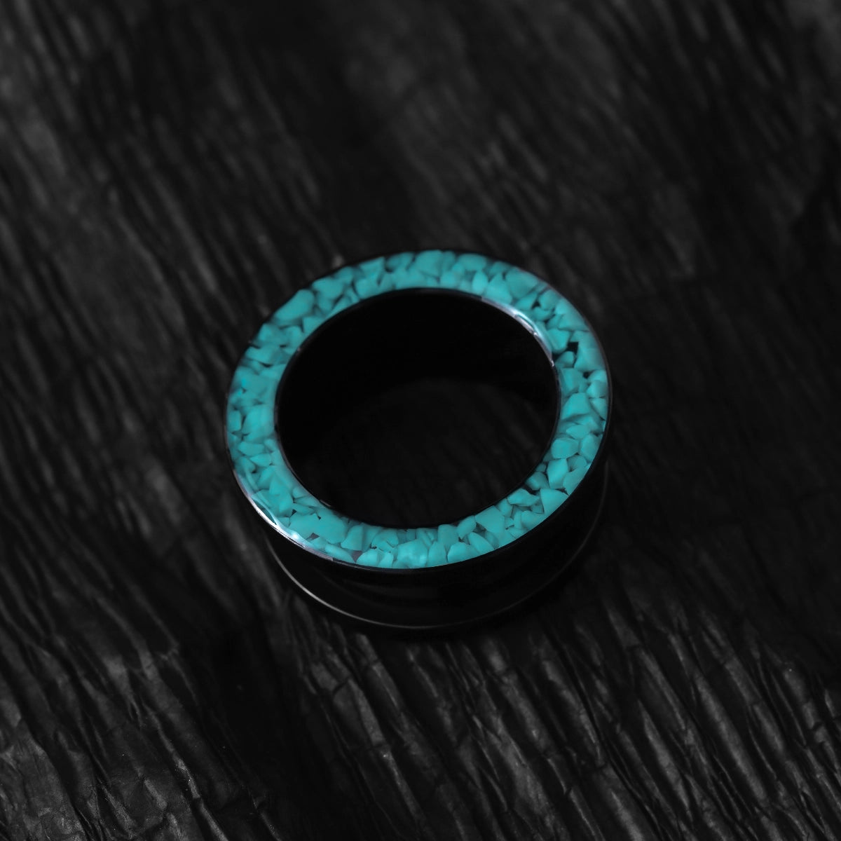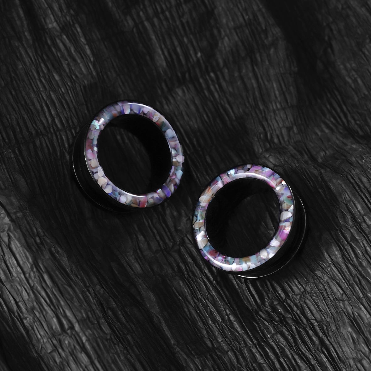 These tunnels feature a sleek, circular design with vibrant inlays of turquoise, tourmaline, lapis lazuli, and goldstone, offering a unique and elegant look. This item is sold as a pair.
