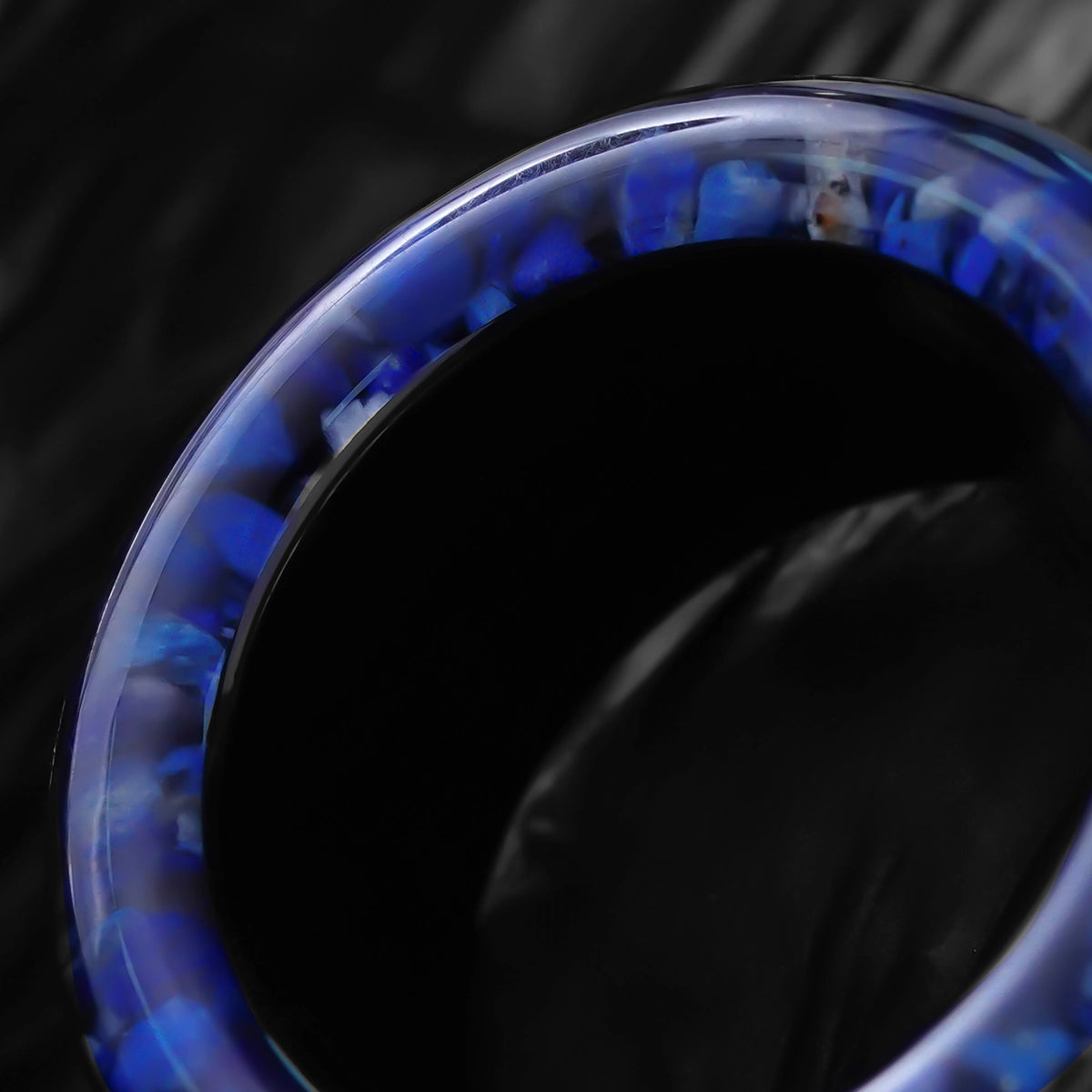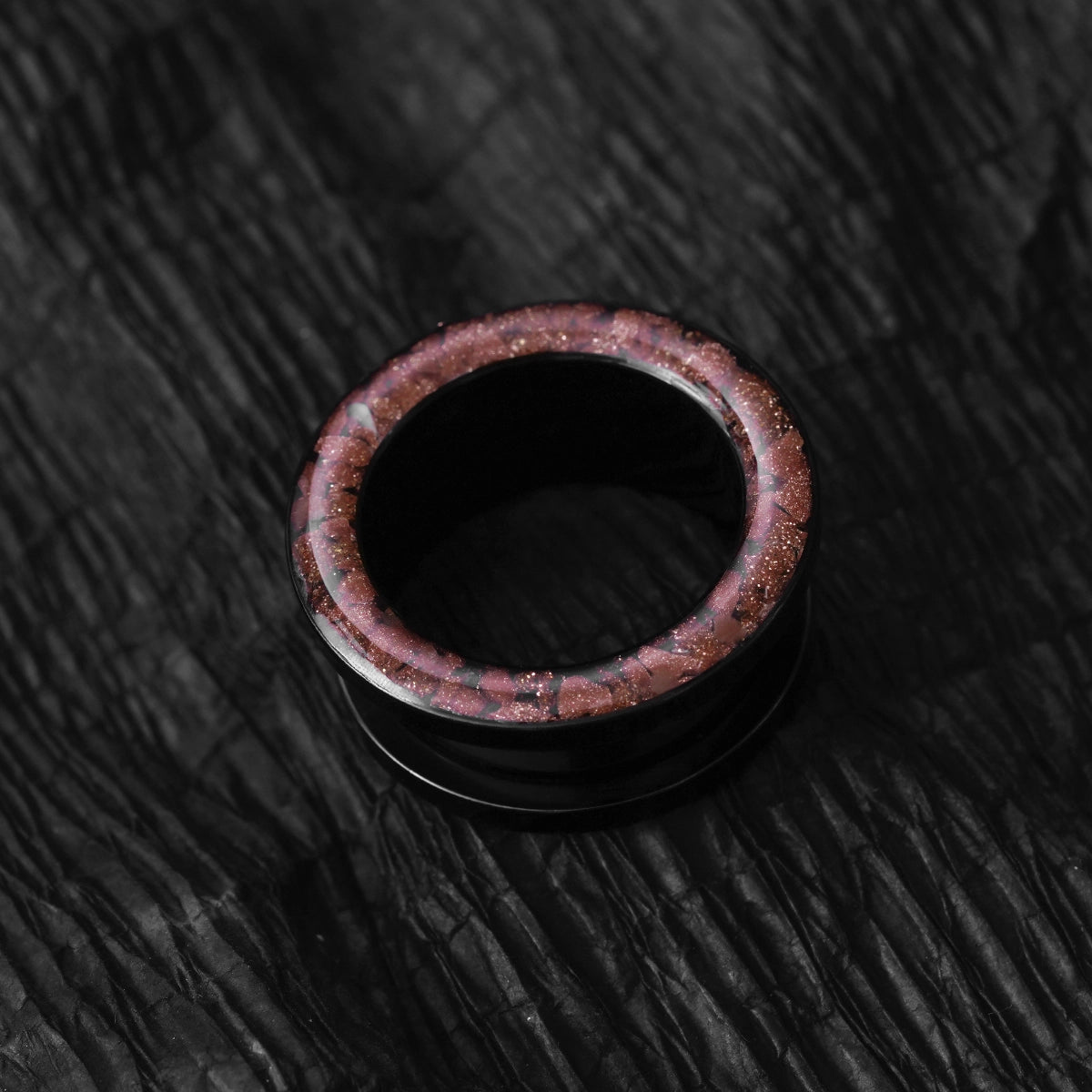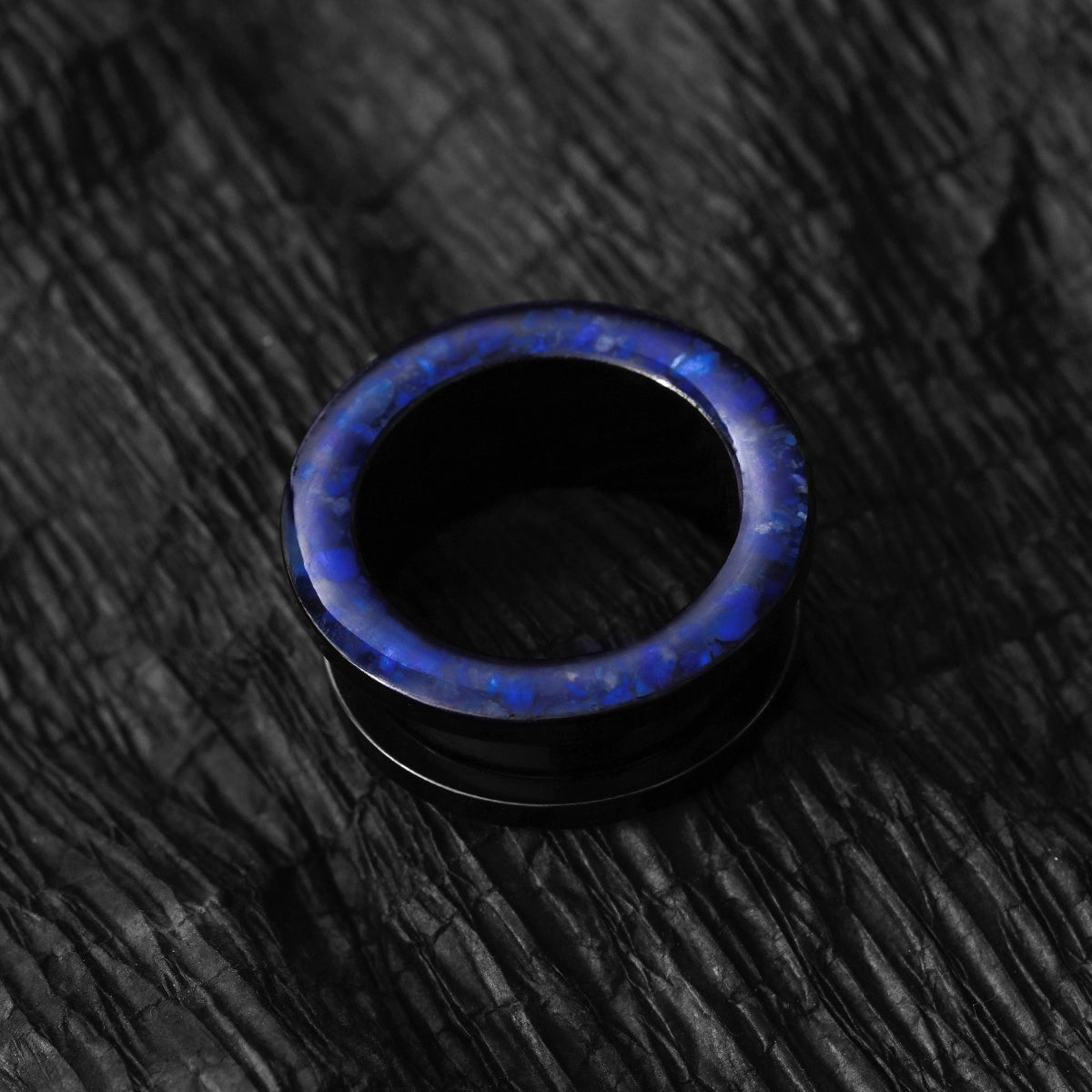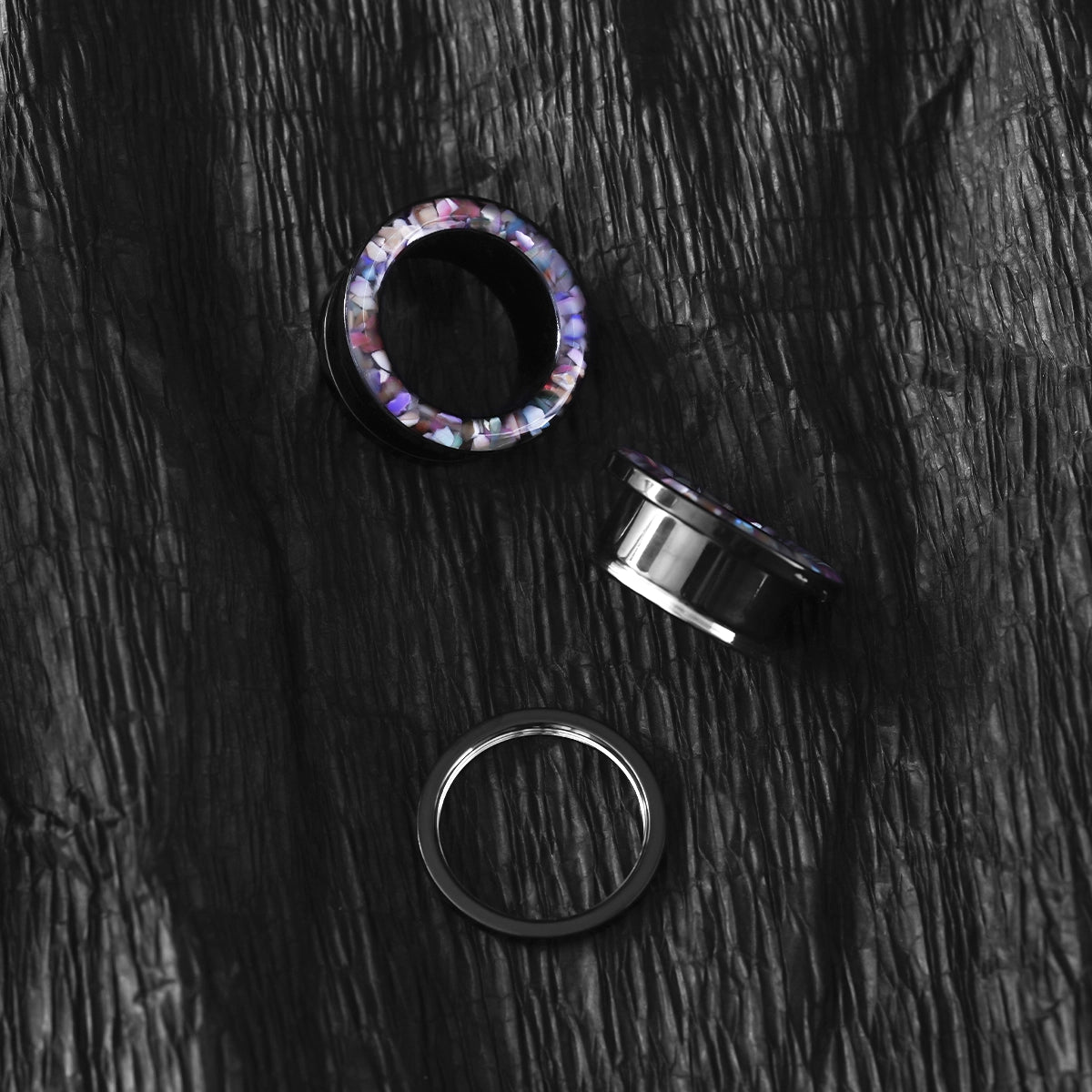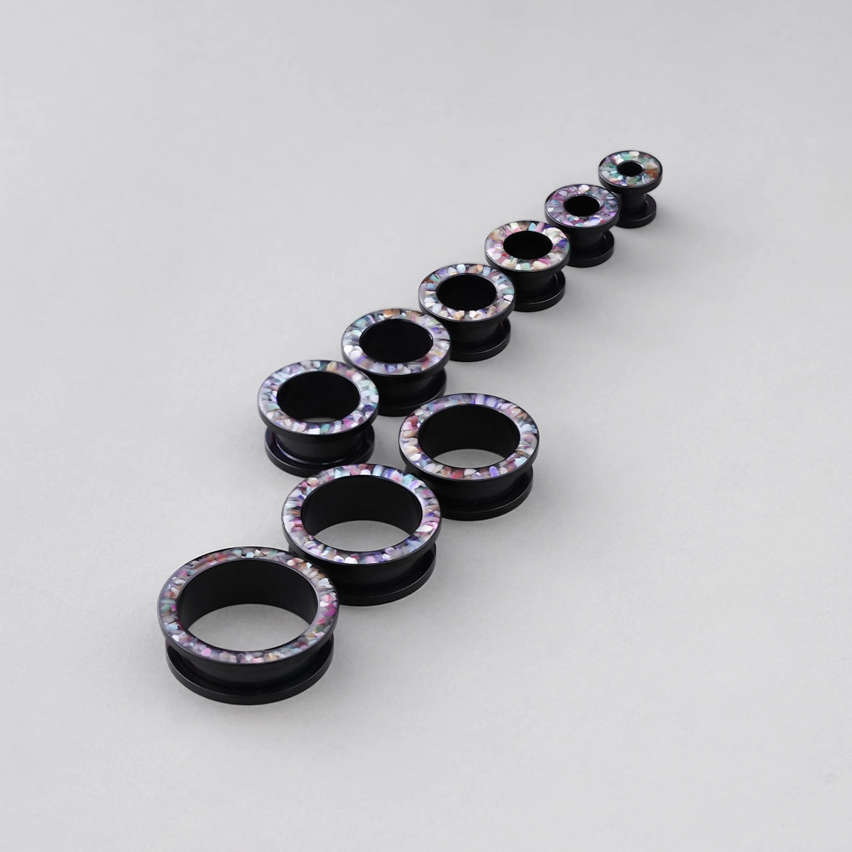 These tunnels feature a sleek, circular design with vibrant inlays of turquoise, tourmaline, lapis lazuli, and goldstone, offering a unique and elegant look. This item is sold as a pair.