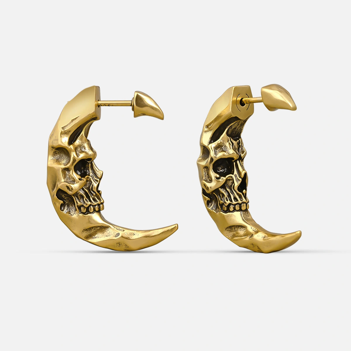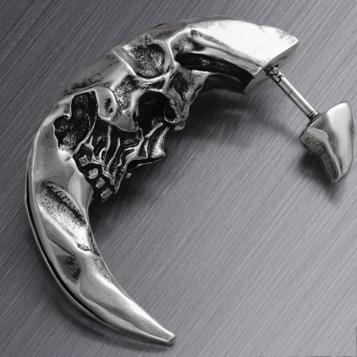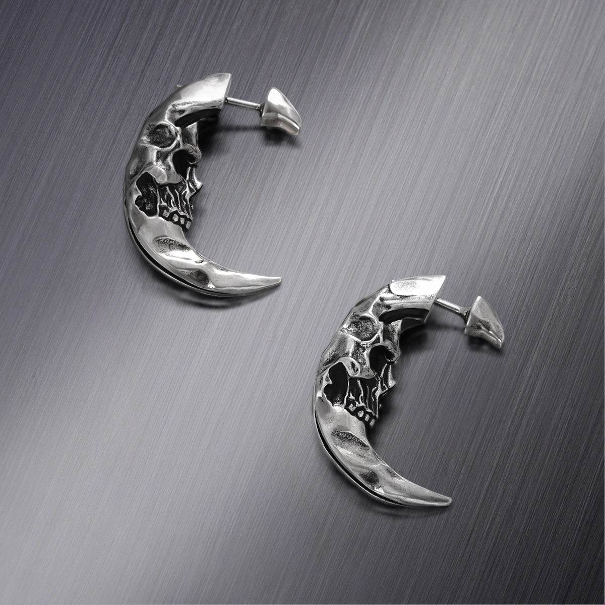 The Crescent Skull earrings blend skull and crescent motifs, showcasing a unique Gothic style. The intricate craftsmanship brings every detail to life, making them perfect for those who embrace individuality and alternative fashion. This item is sold as a pair.