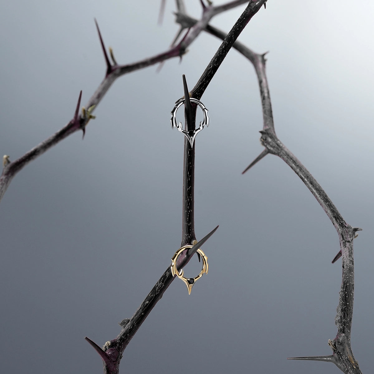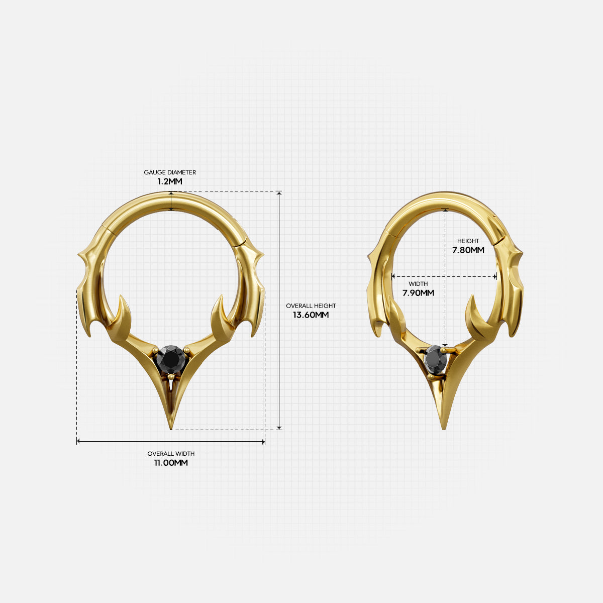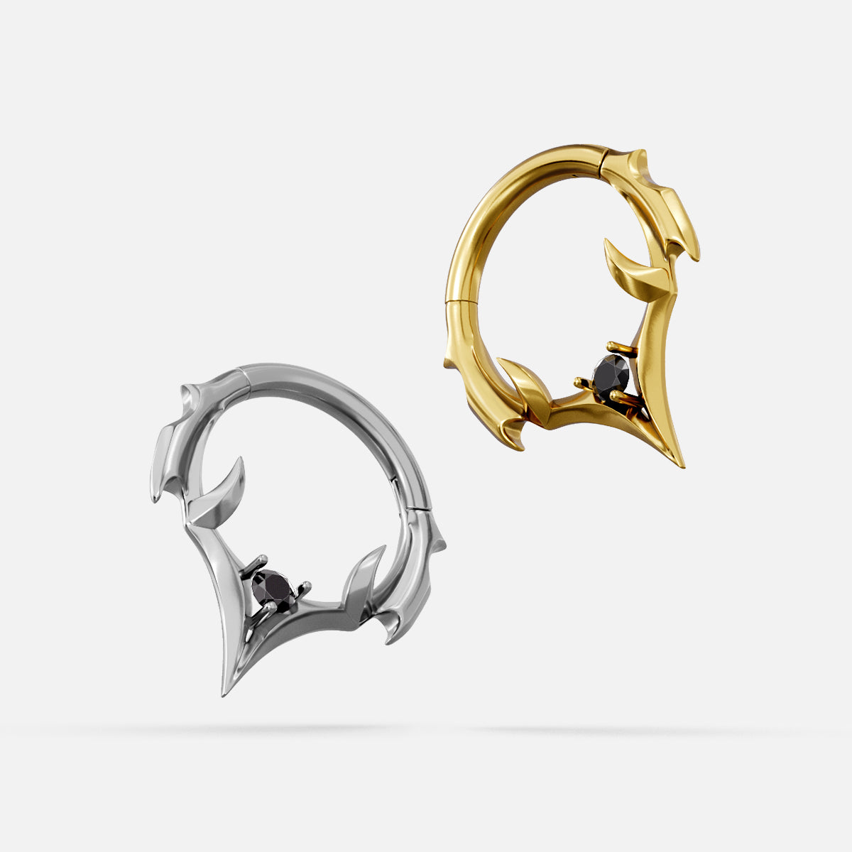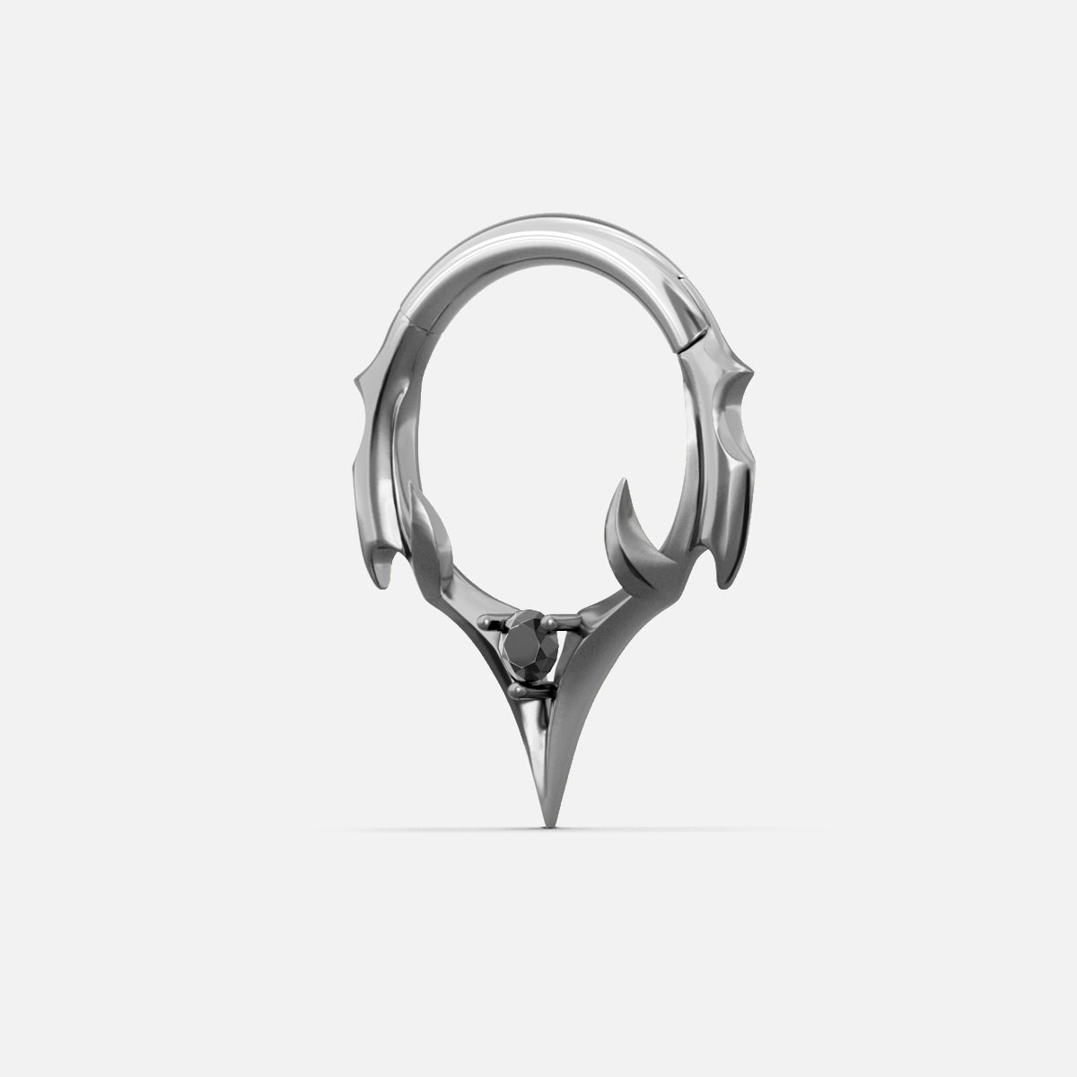 The Crest Point Septum Clicker frames the septum with lifted ridge tips that converge into a single downward point. A round black stone anchors the base; openwork keeps weight low. Spinal Bone logic—mass where pressure sits, edges tapered for clearance.