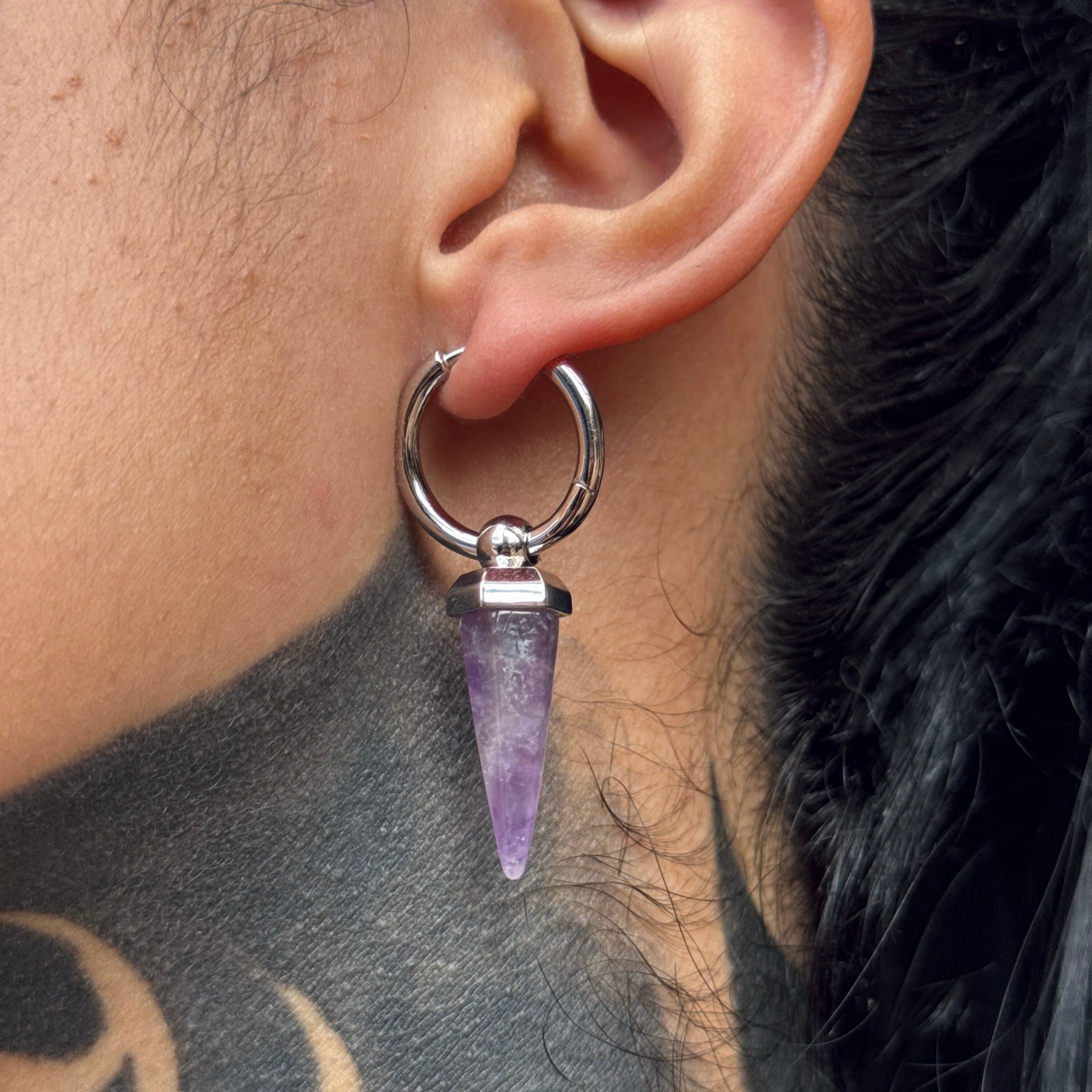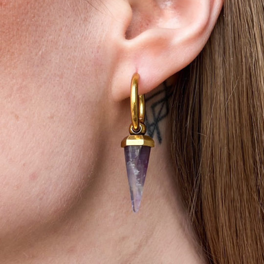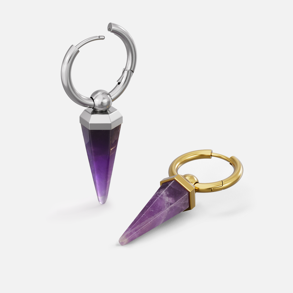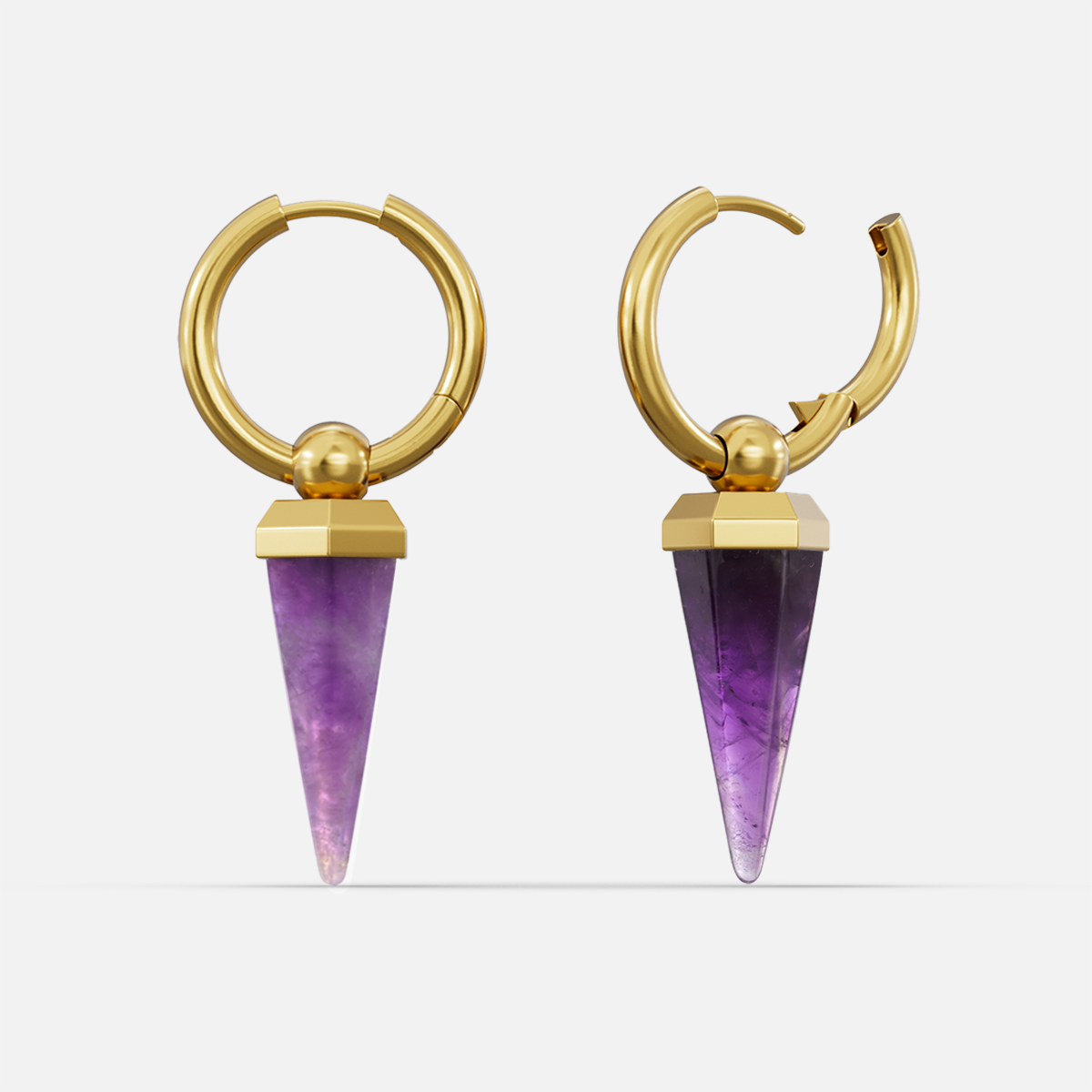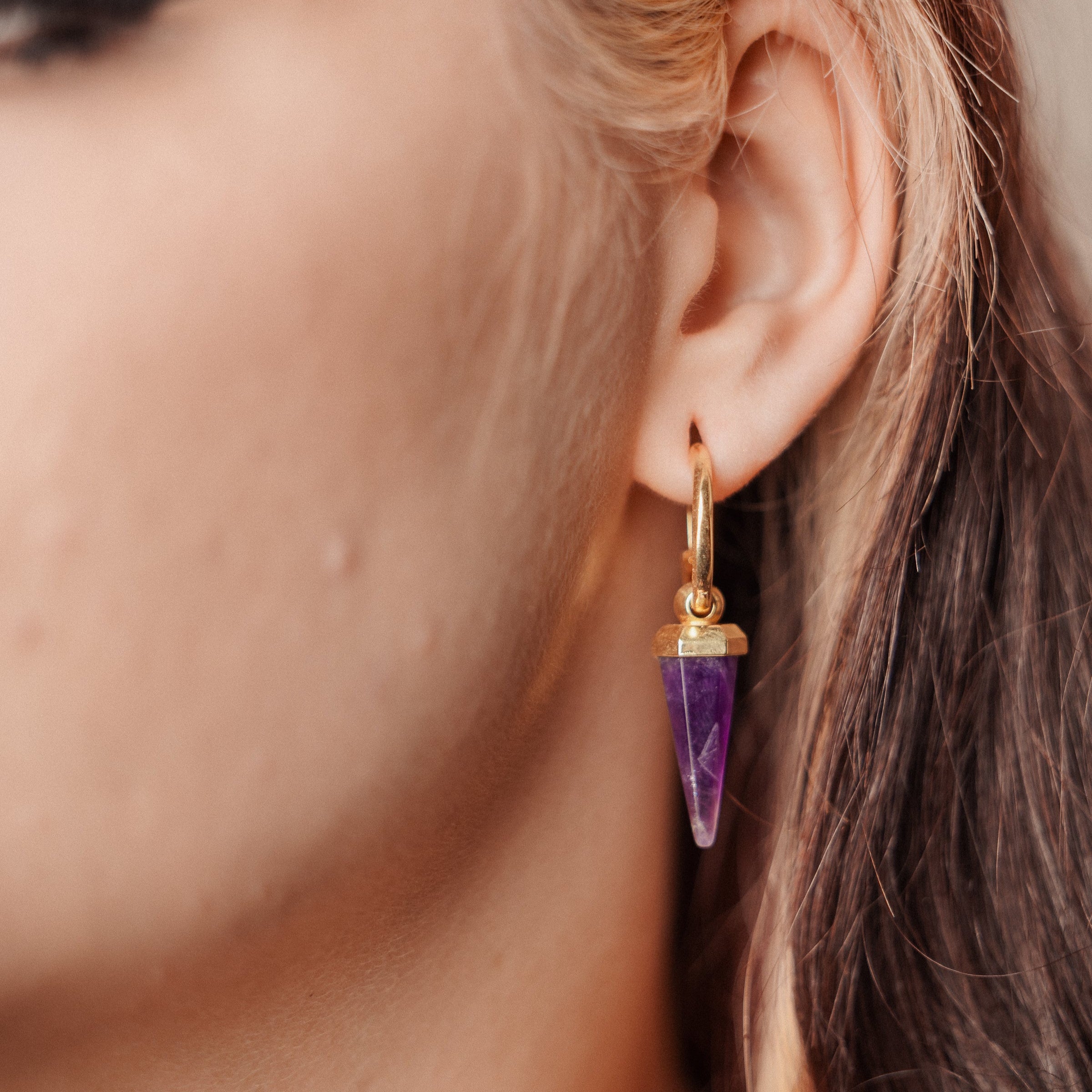 This earring features a unique amethyst shape, combining geometric design with natural elements, showcasing a perfect balance of elegance and individuality. This item is sold as a pair.