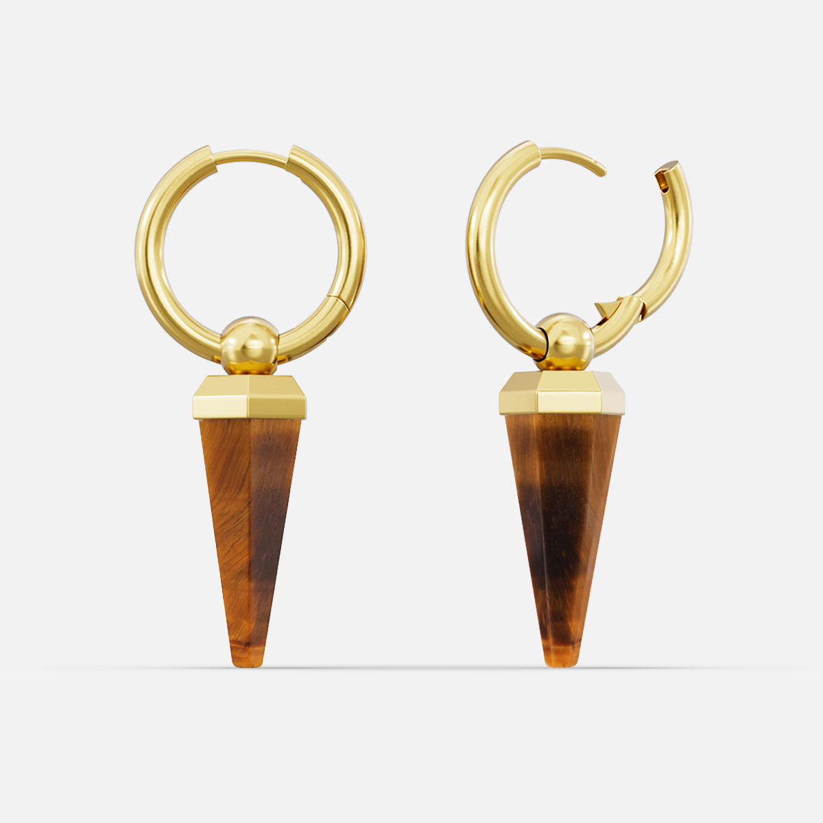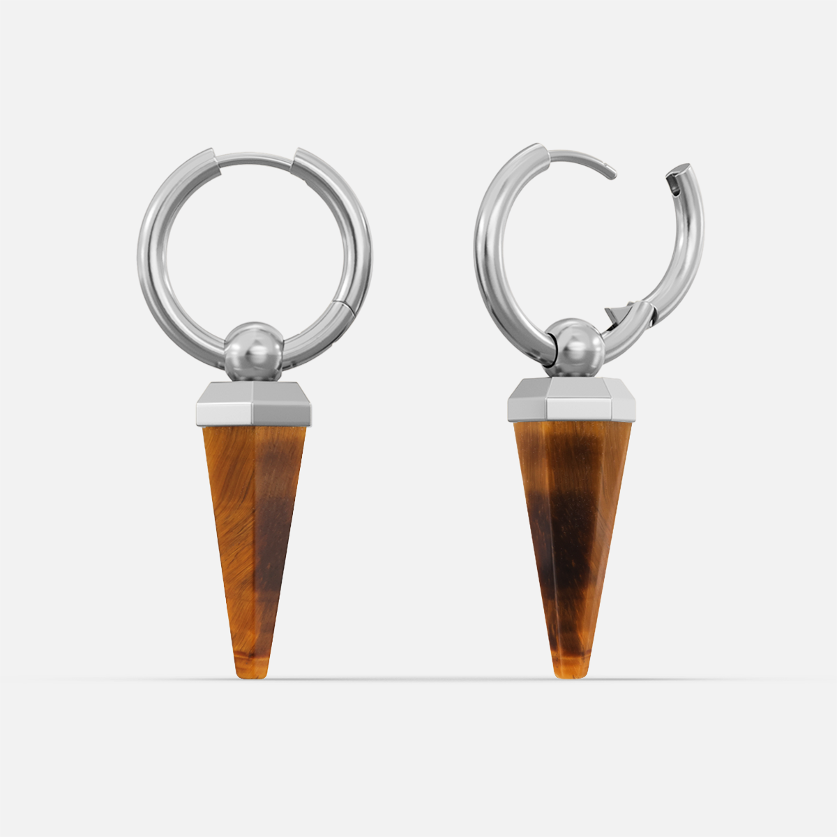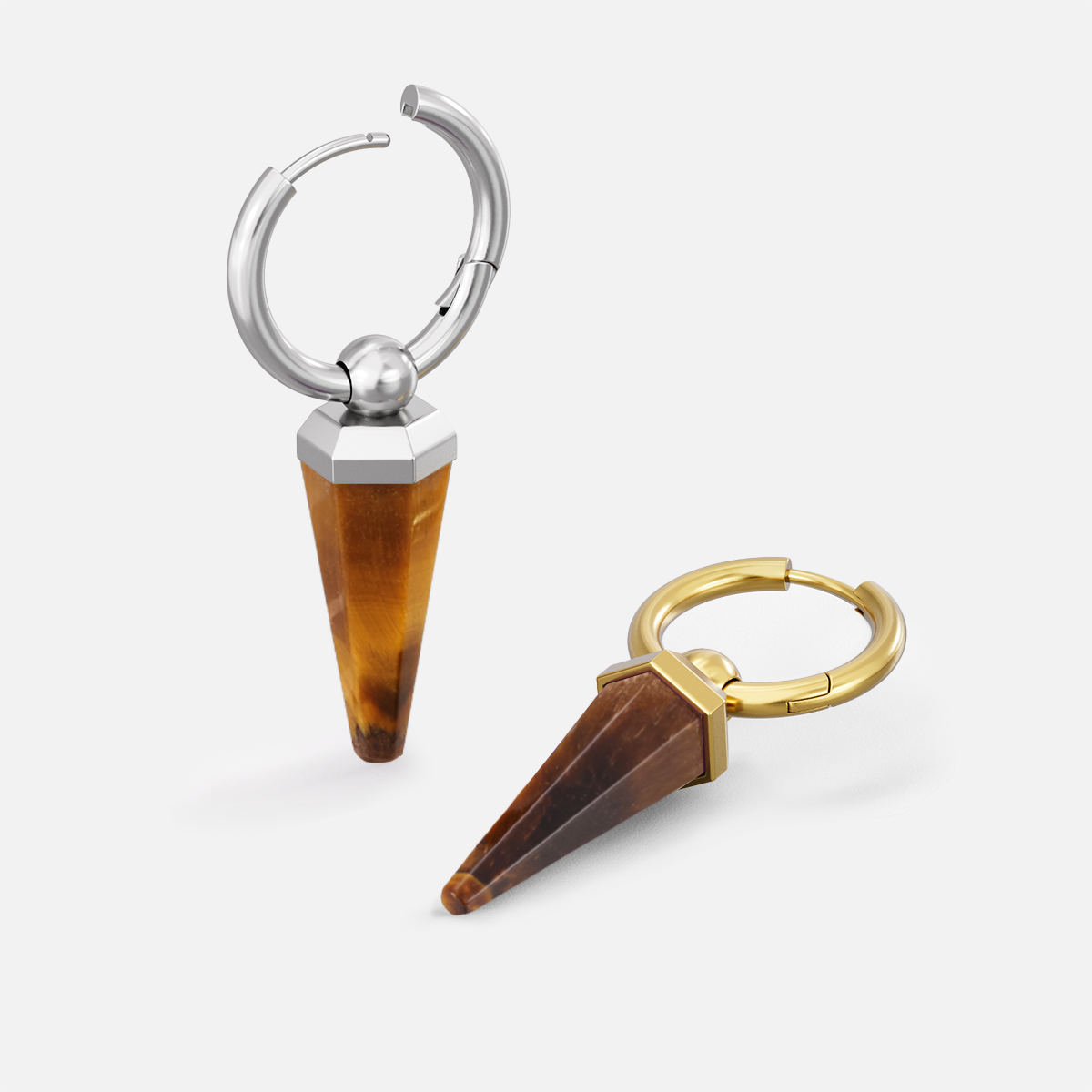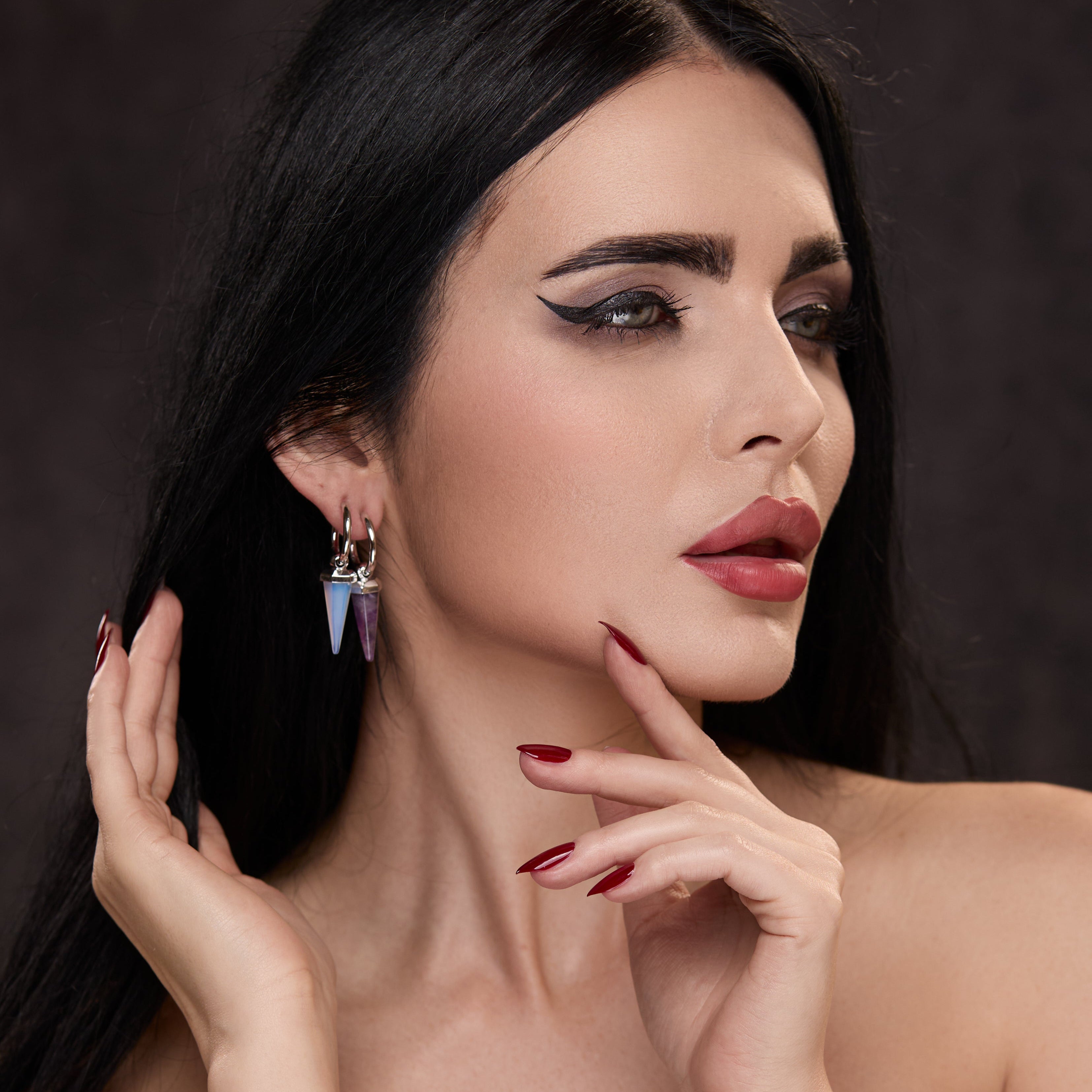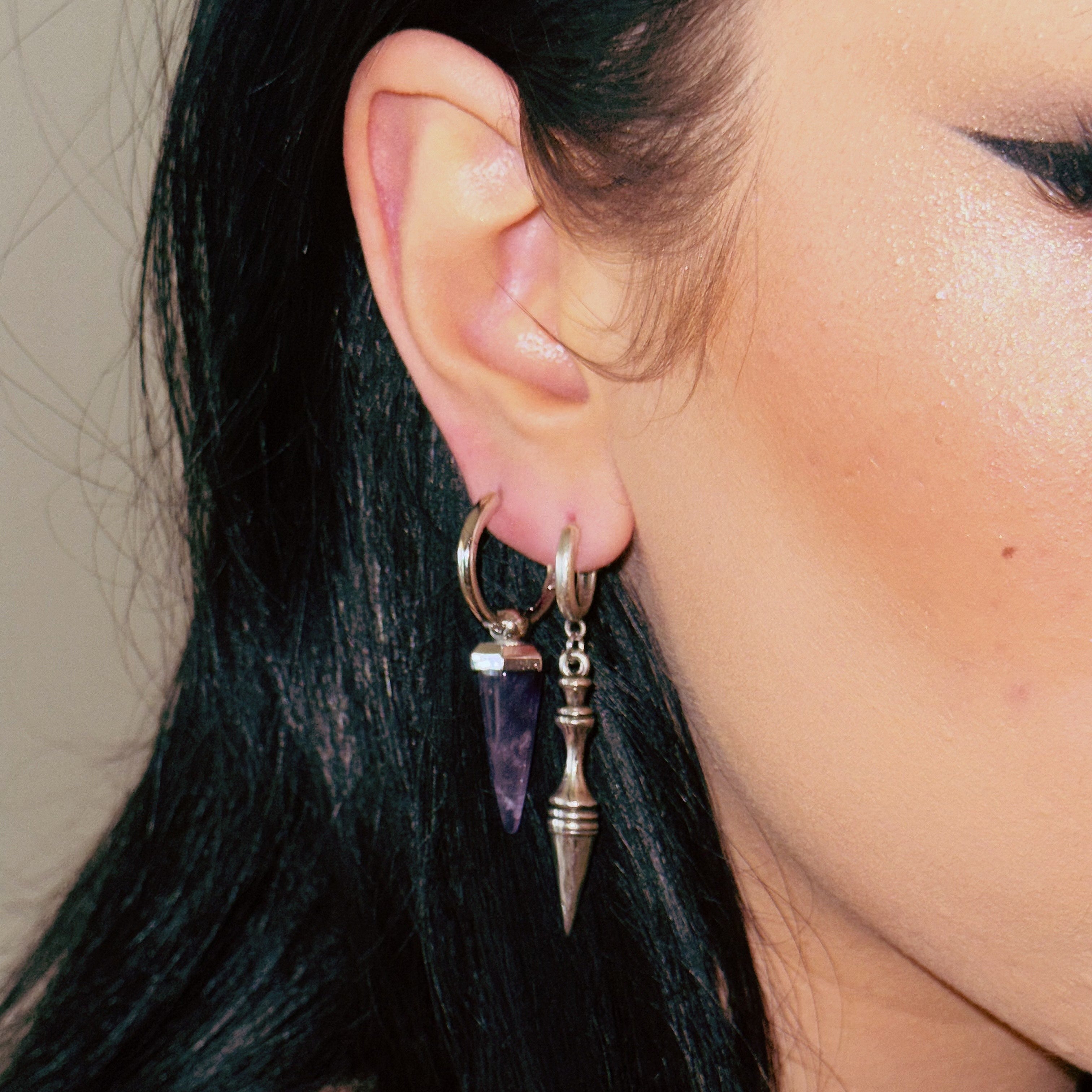 This earring features a unique amethyst shape, combining geometric design with natural elements, showcasing a perfect balance of elegance and individuality. This item is sold as a pair.