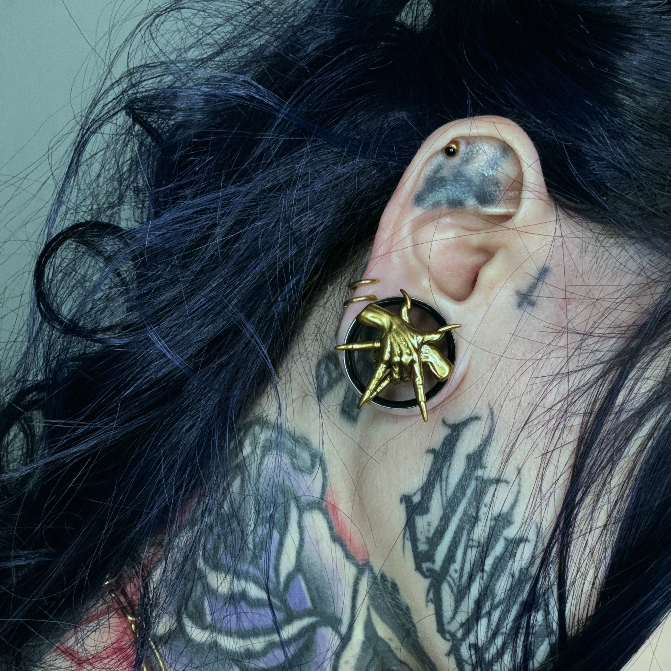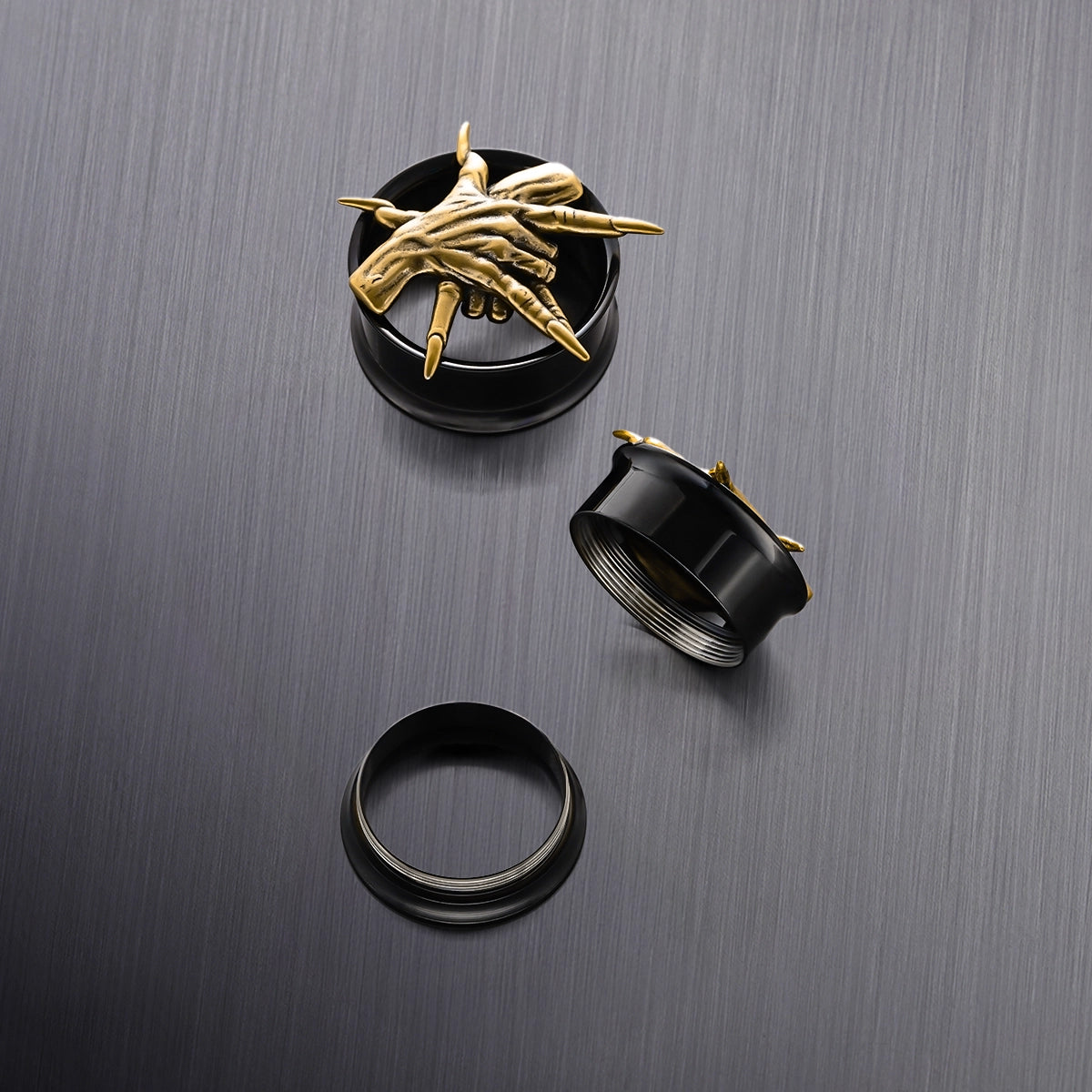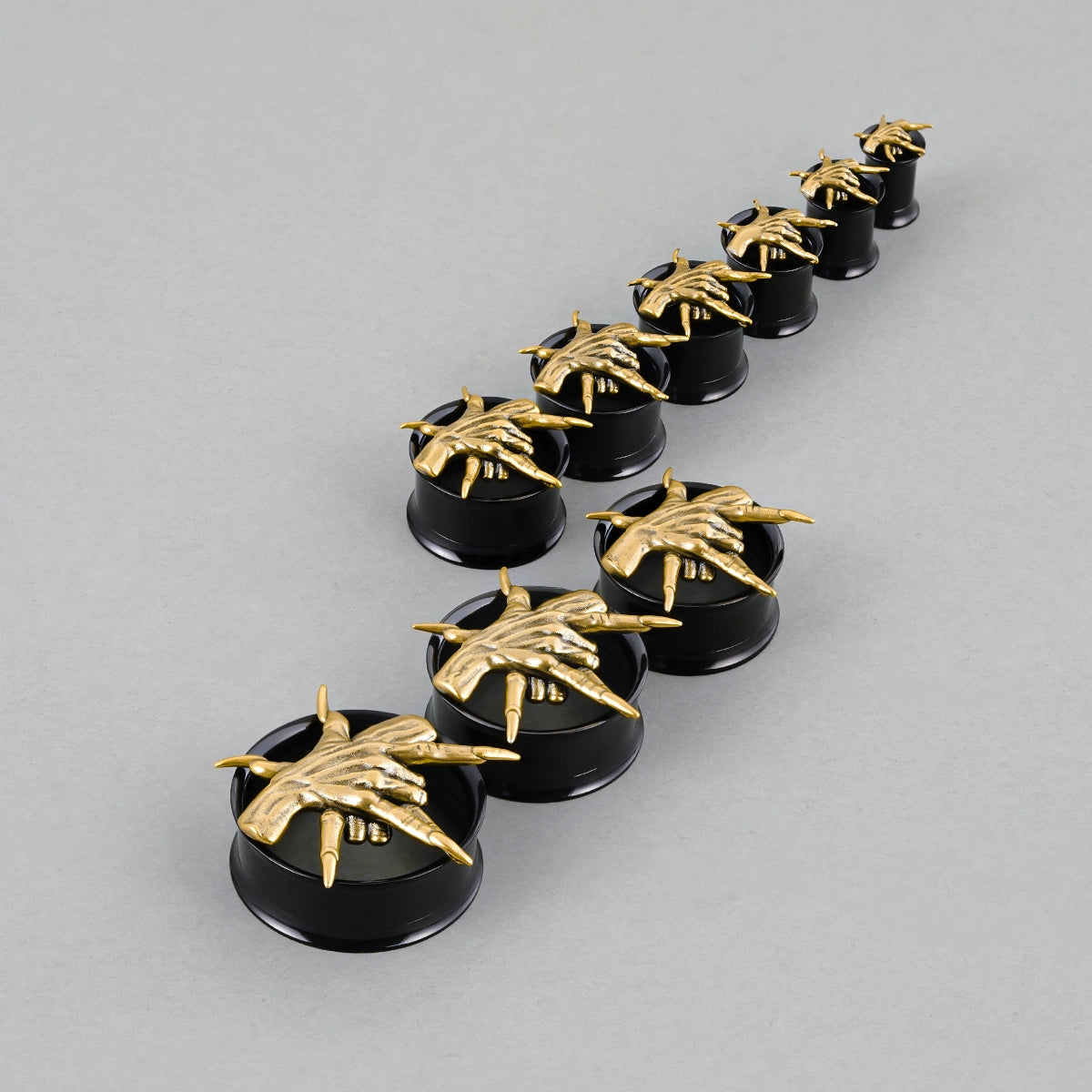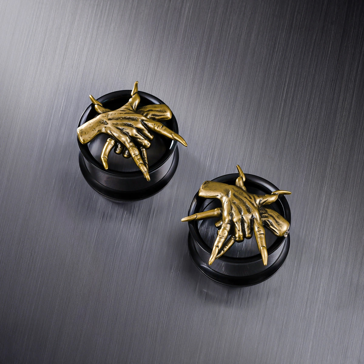 Demonic Grip Tunnels feature intricate details resembling demonic claws, crafted from high-quality metal for a striking visual impact. This item is sold as a pair.