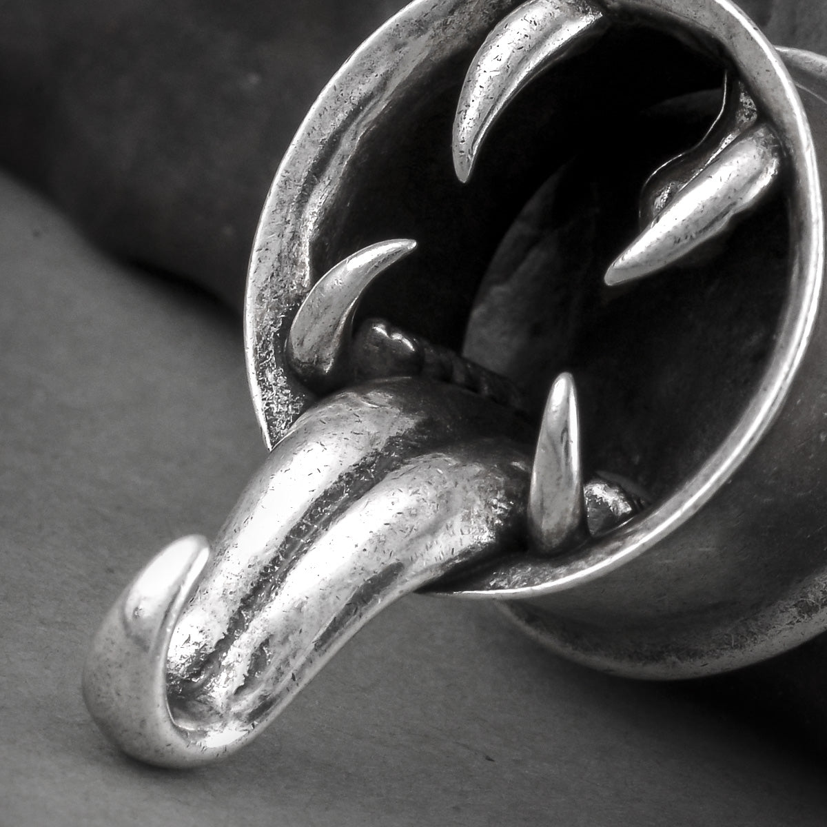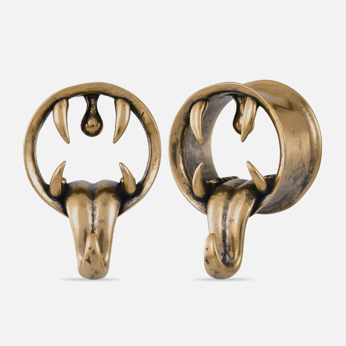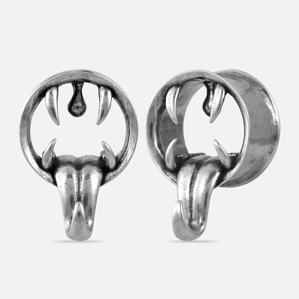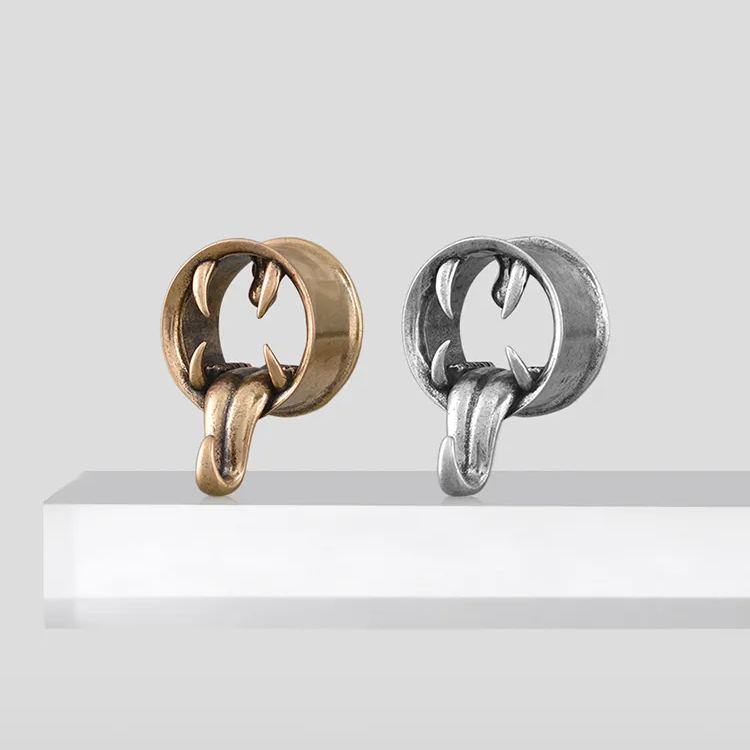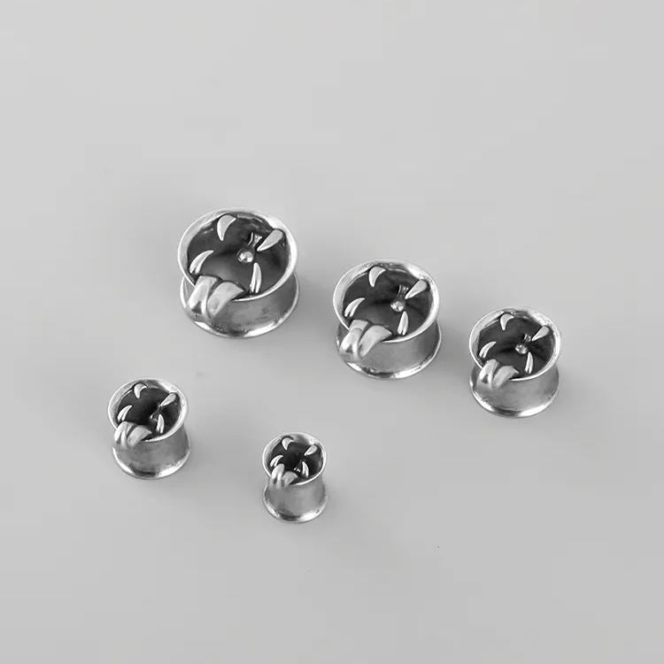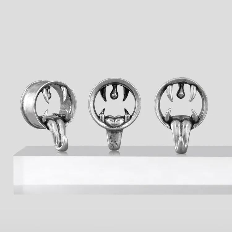 This piercing jewelry features a striking design resembling a gaping creature's mouth, complete with sharp fangs and a hanging tongue, creating a powerful visual impact. This item is sold as a pair.