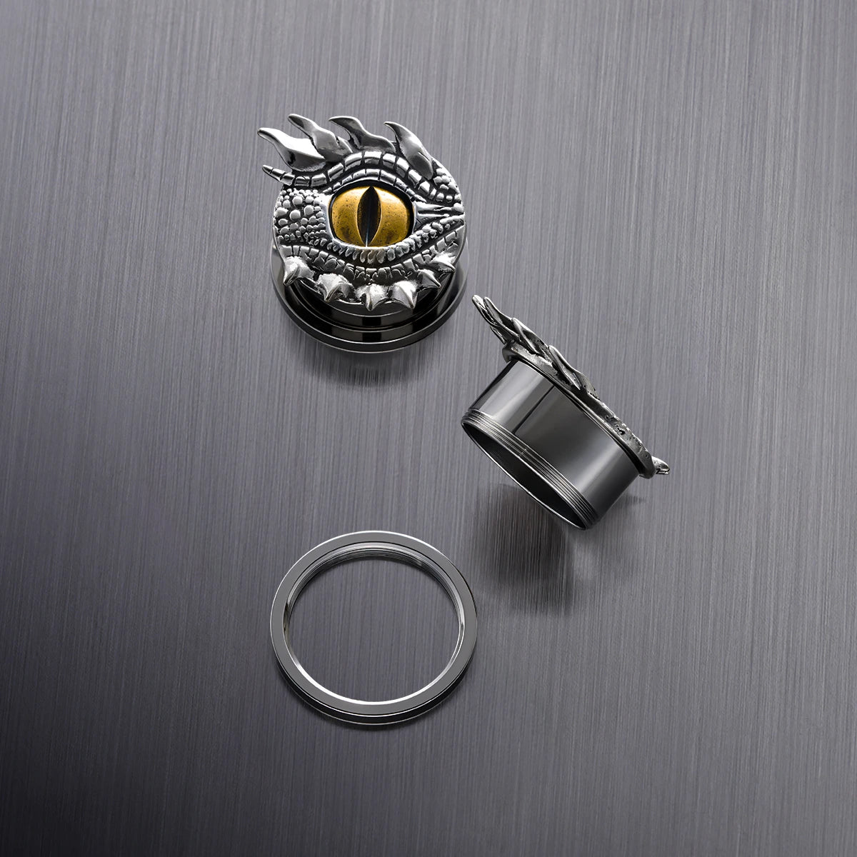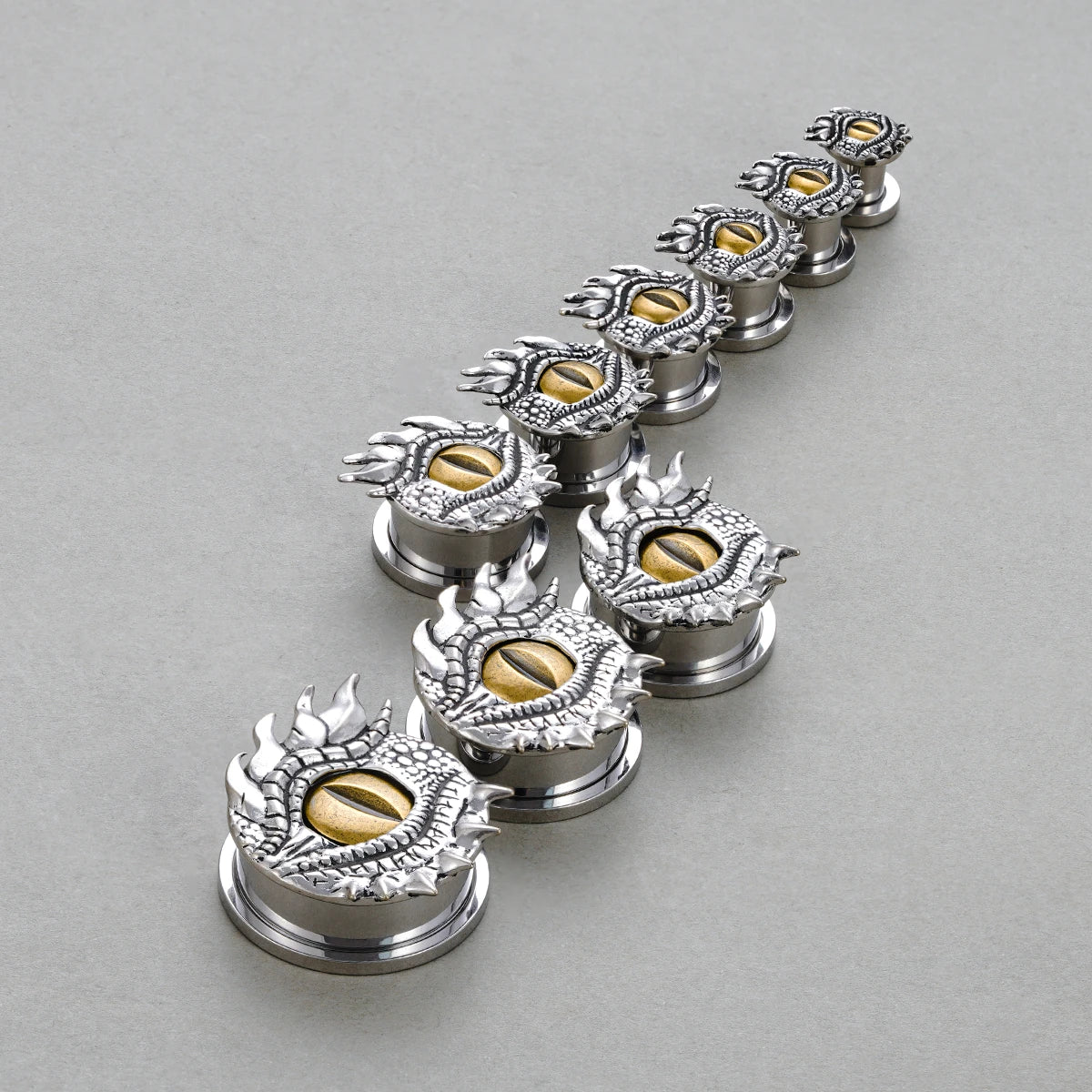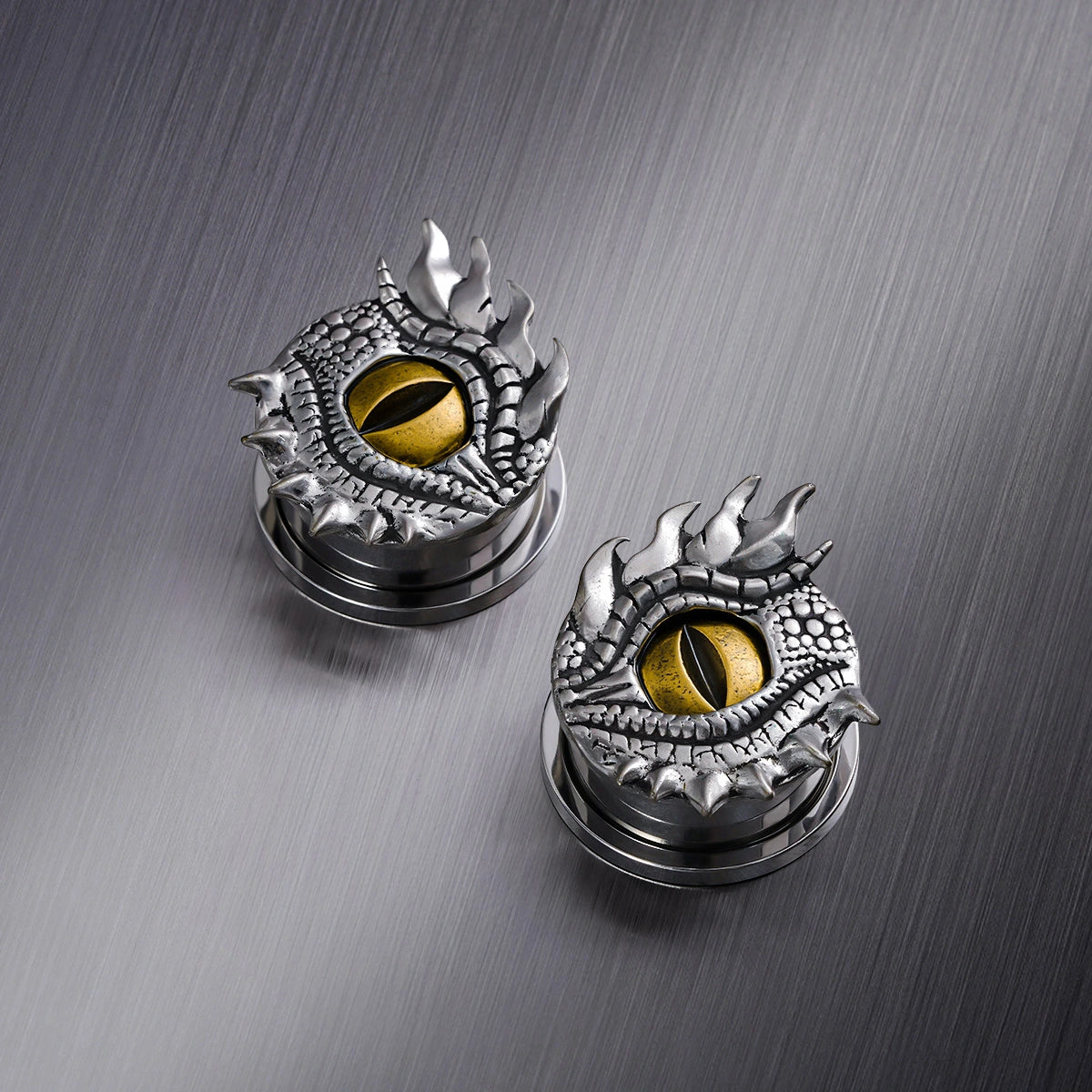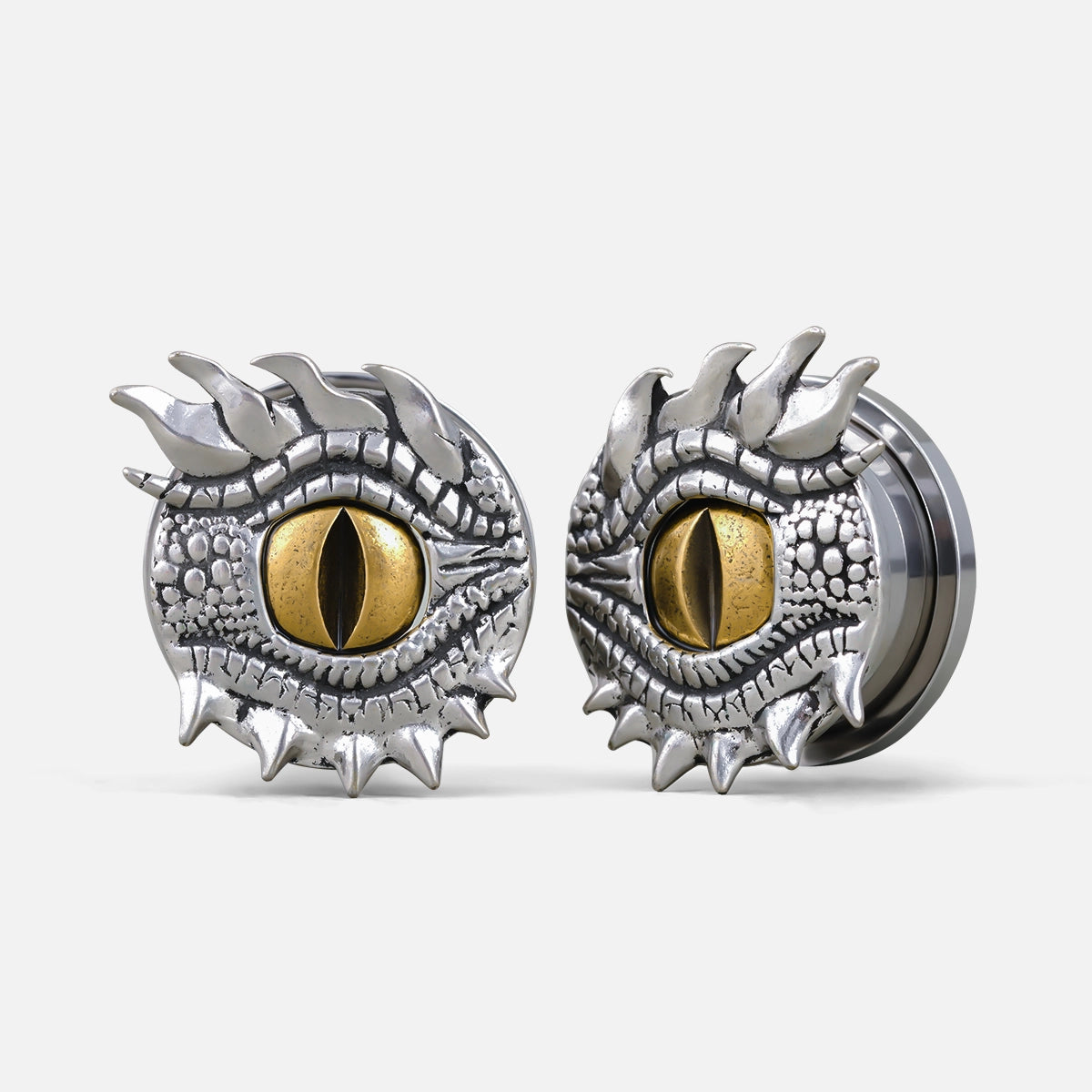 Featuring a captivating dragon eye design, these plugs are crafted with intricate scales and a bold metallic finish. This item is sold as a pair.