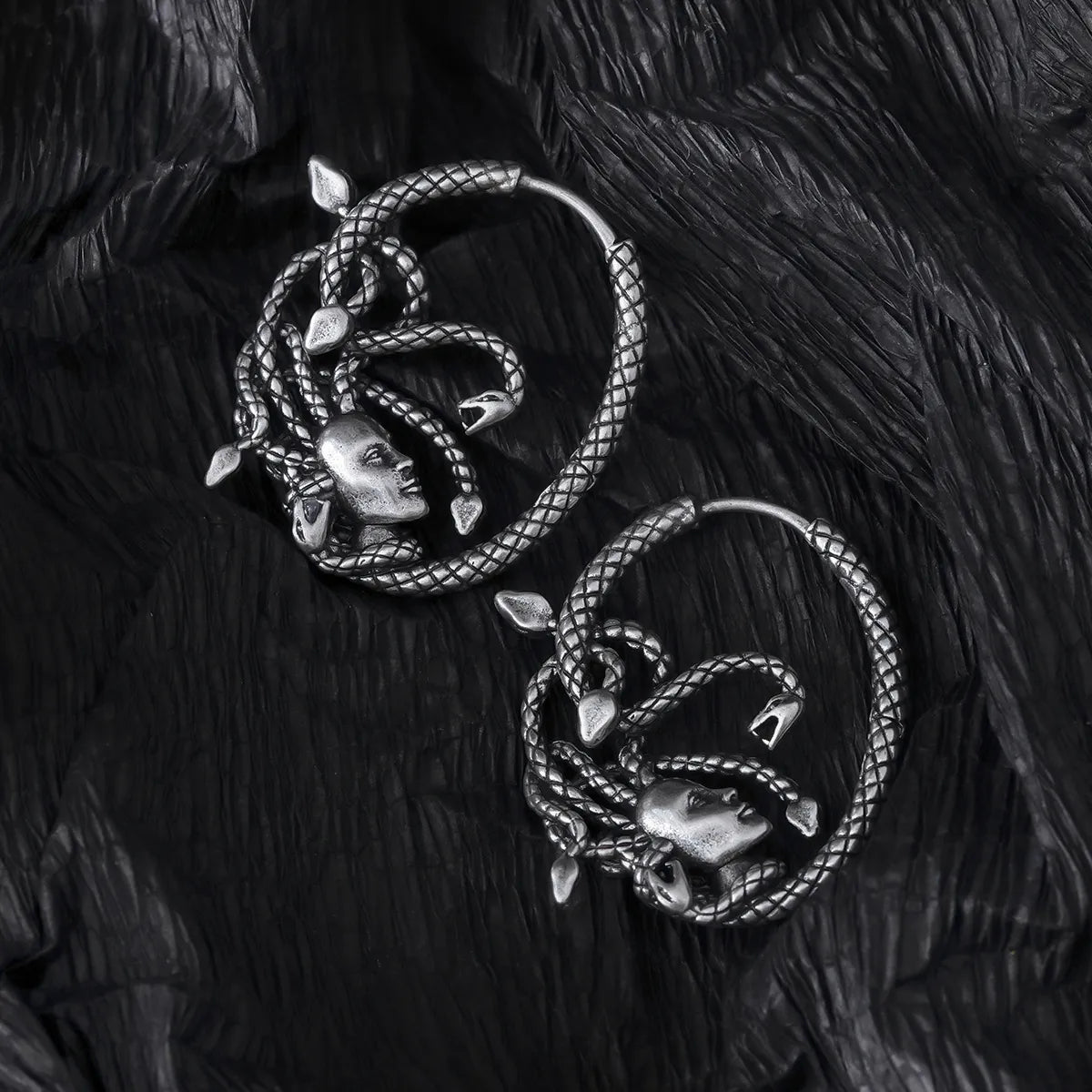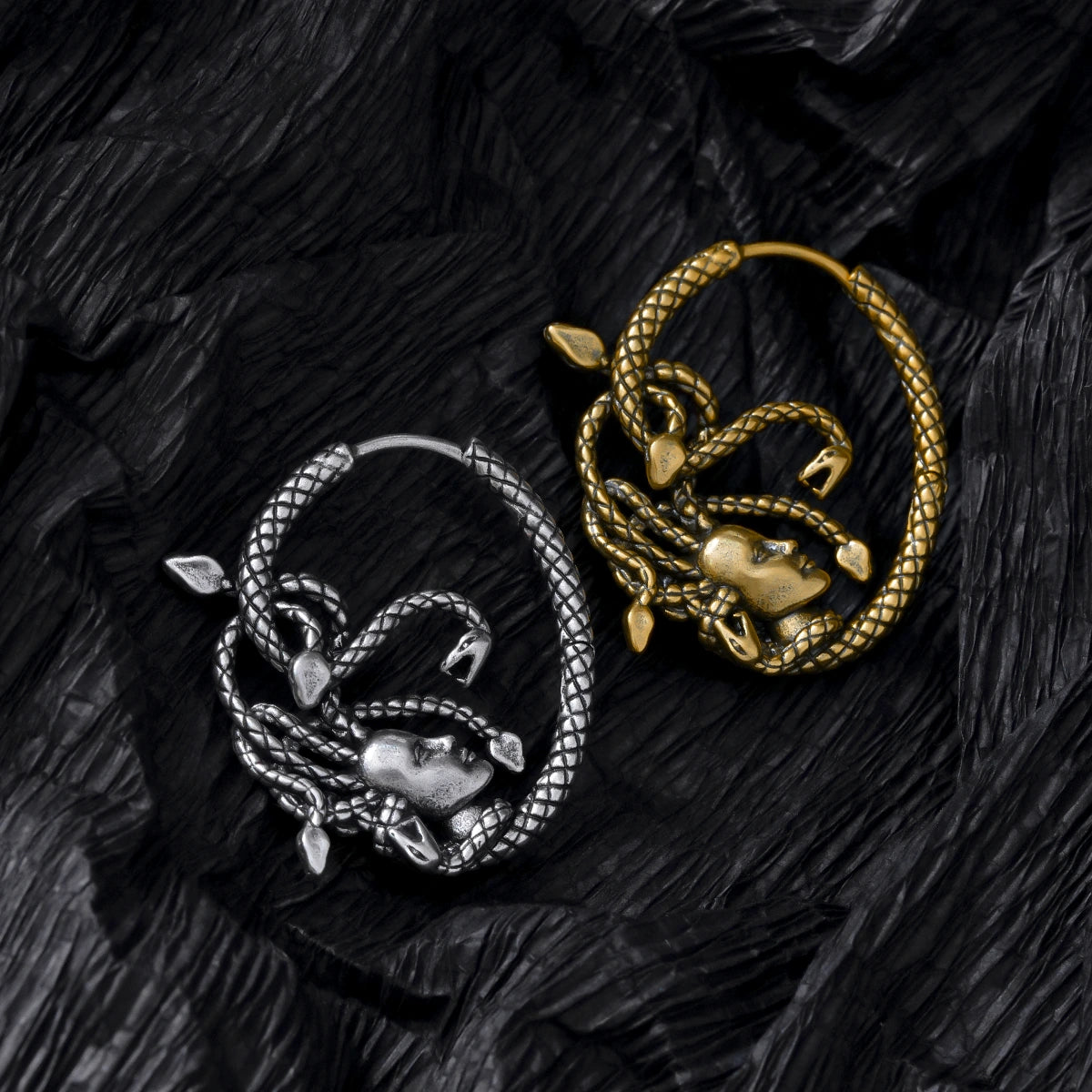 These earrings feature intricate serpent motifs, creating a look that is both mysterious and elegant. This item is sold as a pair.