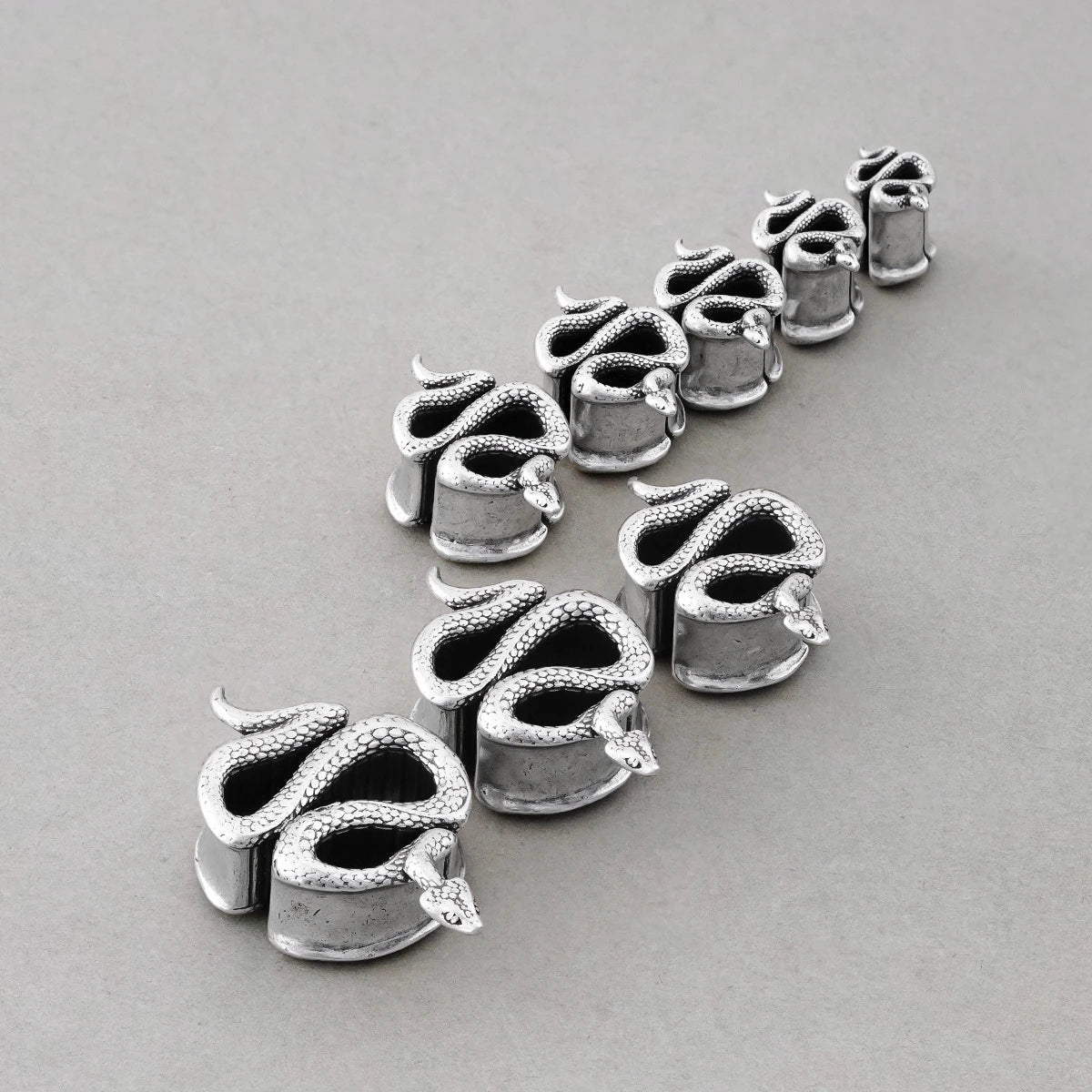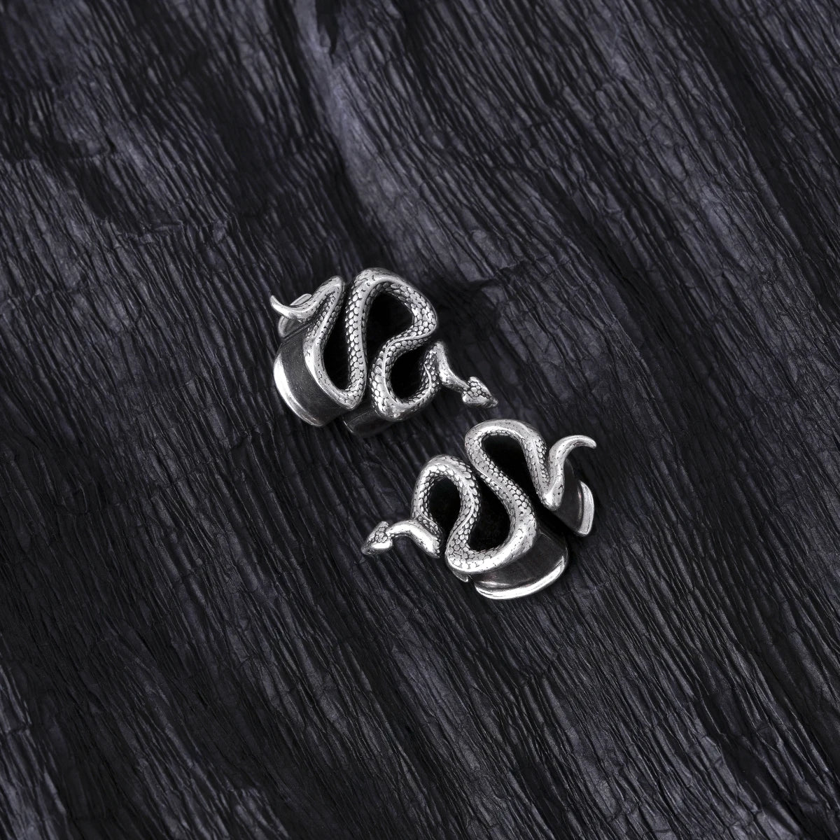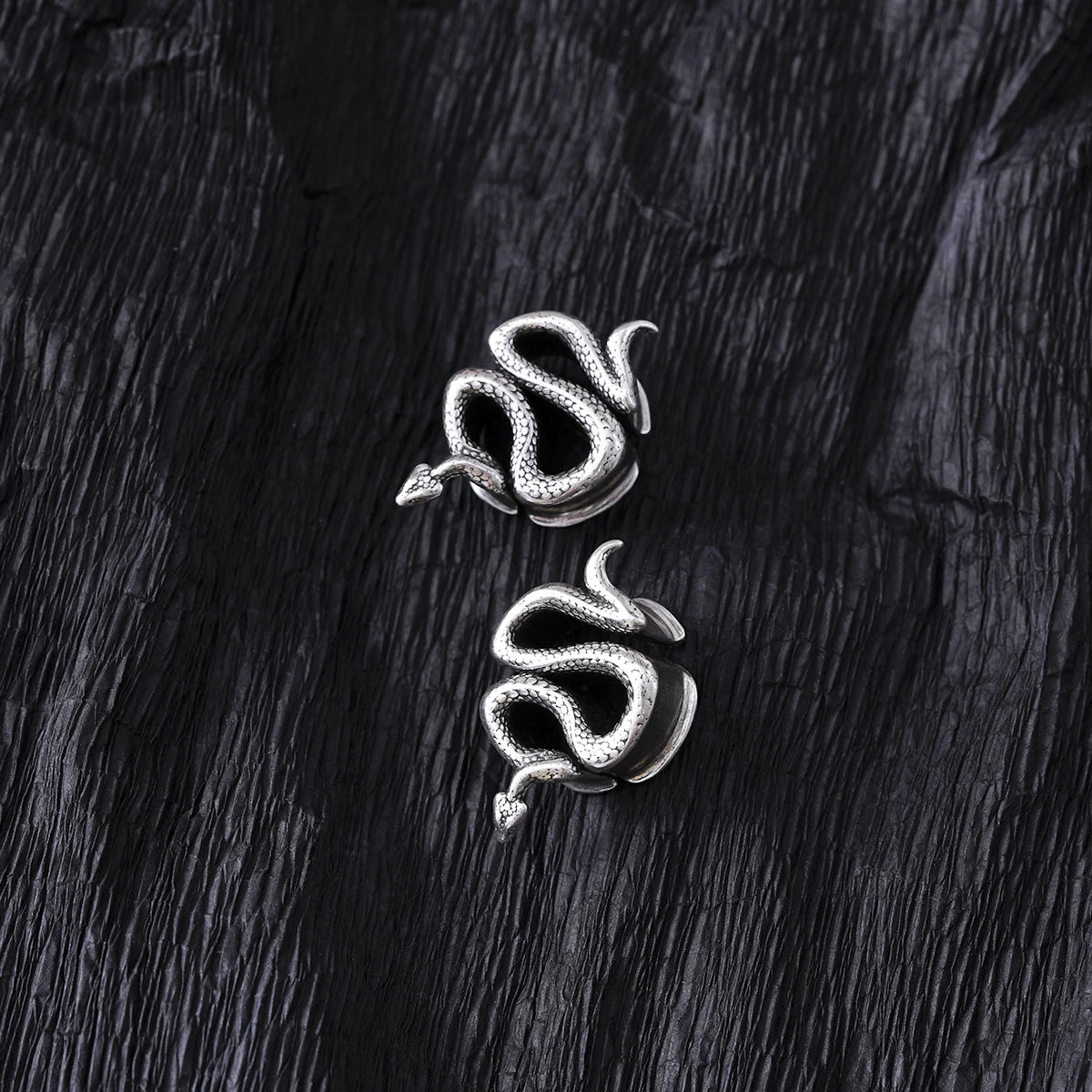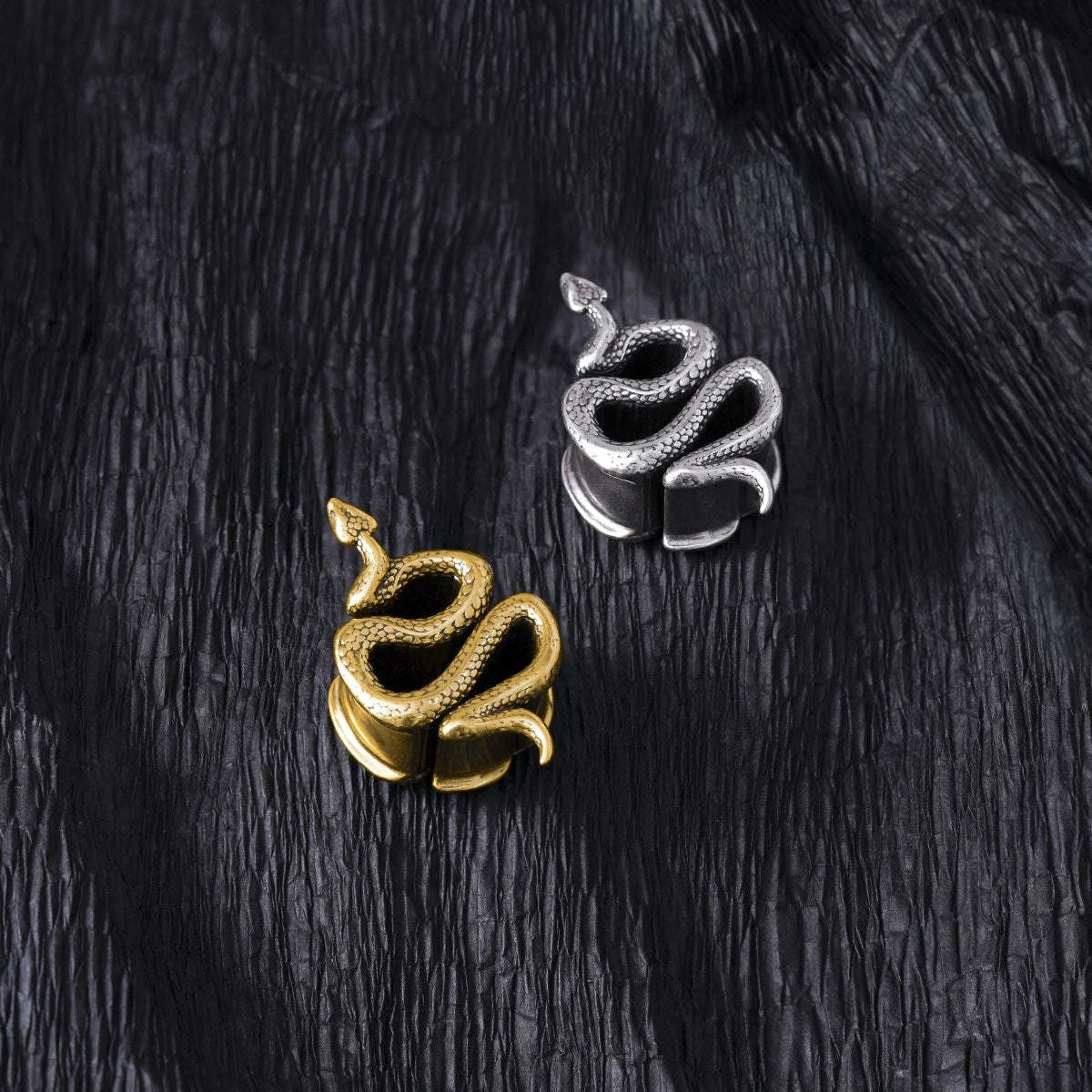 Crafted in the form of an elegant serpent, these tunnels feature sleek metal, exuding a mystical allure. This item is sold as a pair.