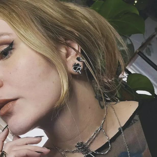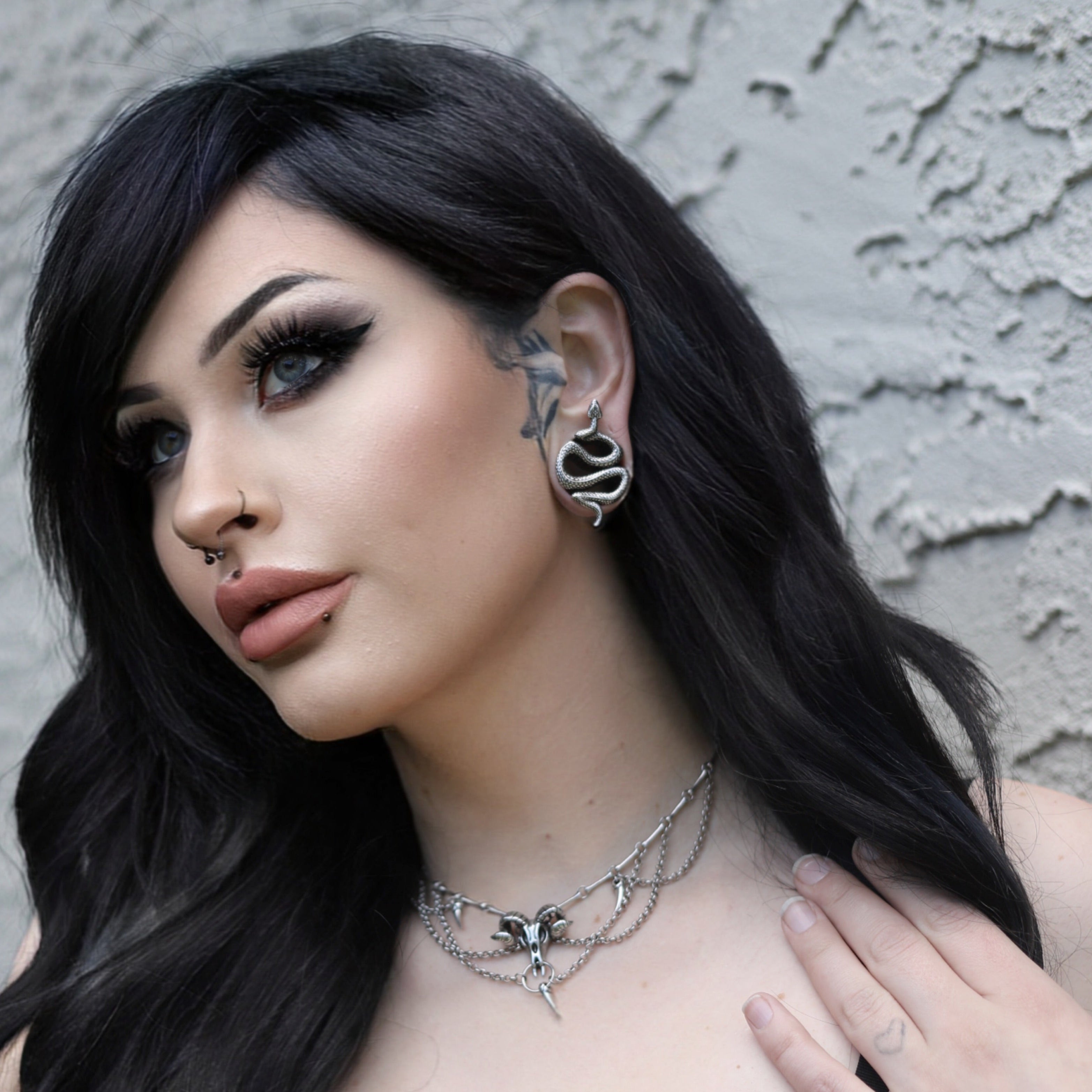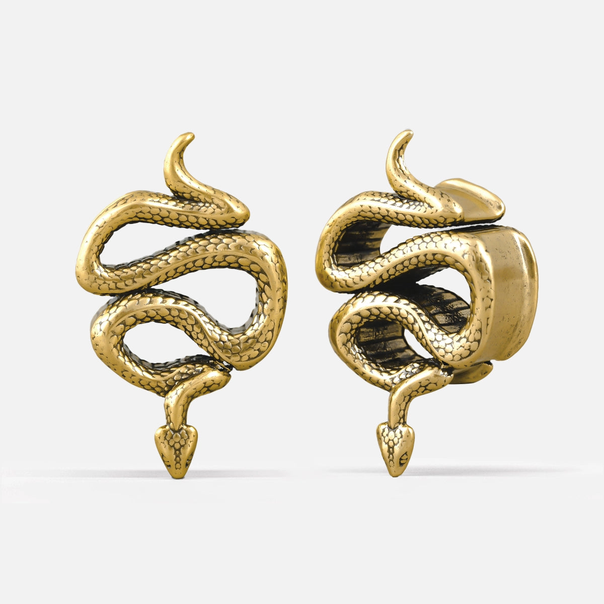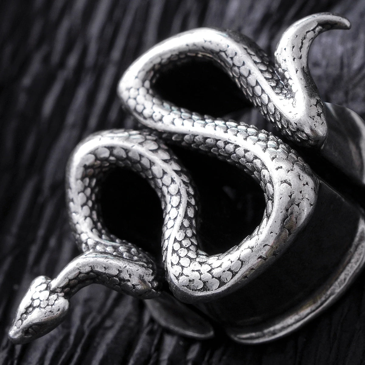 Crafted in the form of an elegant serpent, these tunnels feature sleek metal, exuding a mystical allure. This item is sold as a pair.