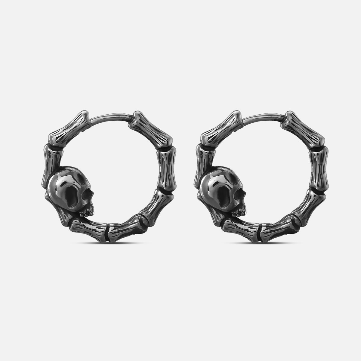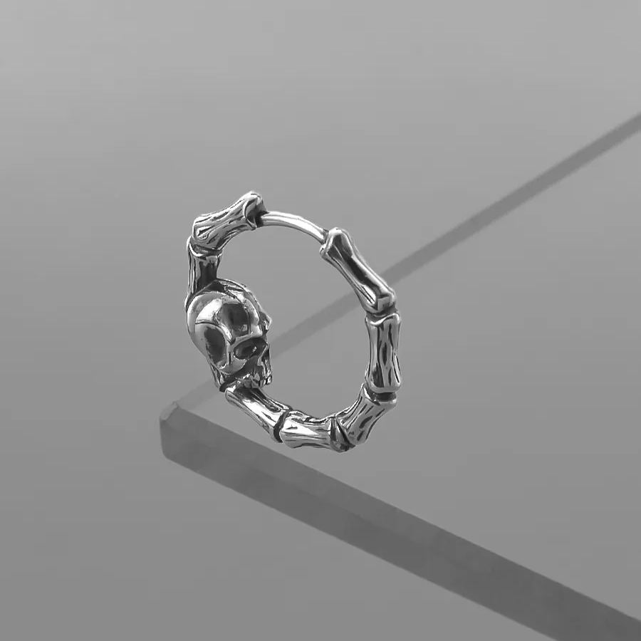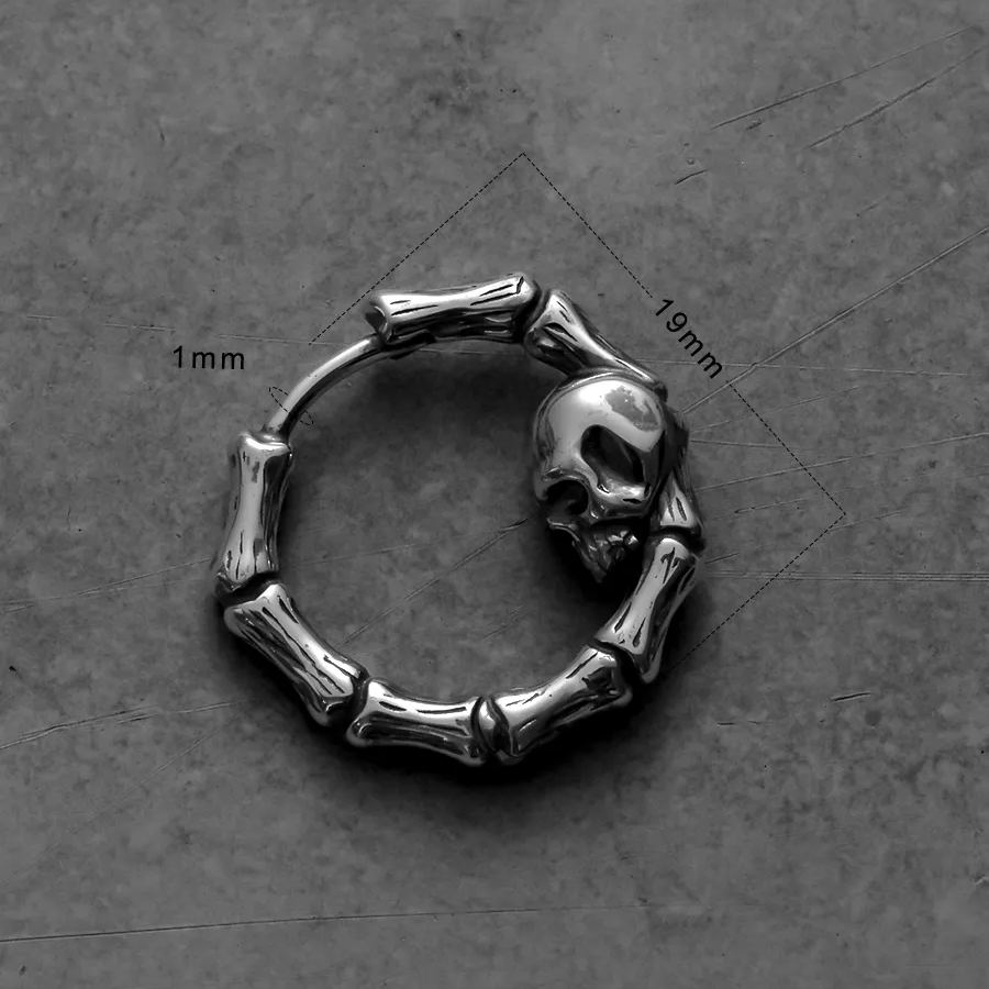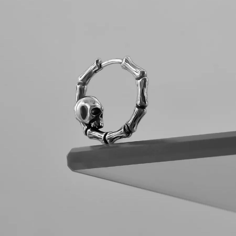 The earrings feature a circular design made up of skeletal bones with a prominent skull, creating a striking and bold look. This item is sold as a pair.