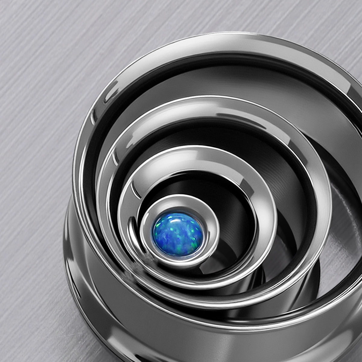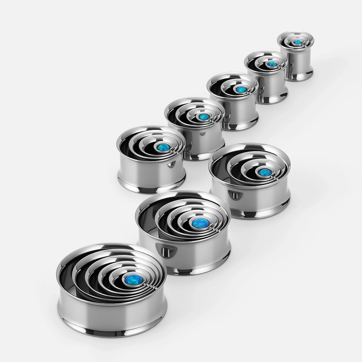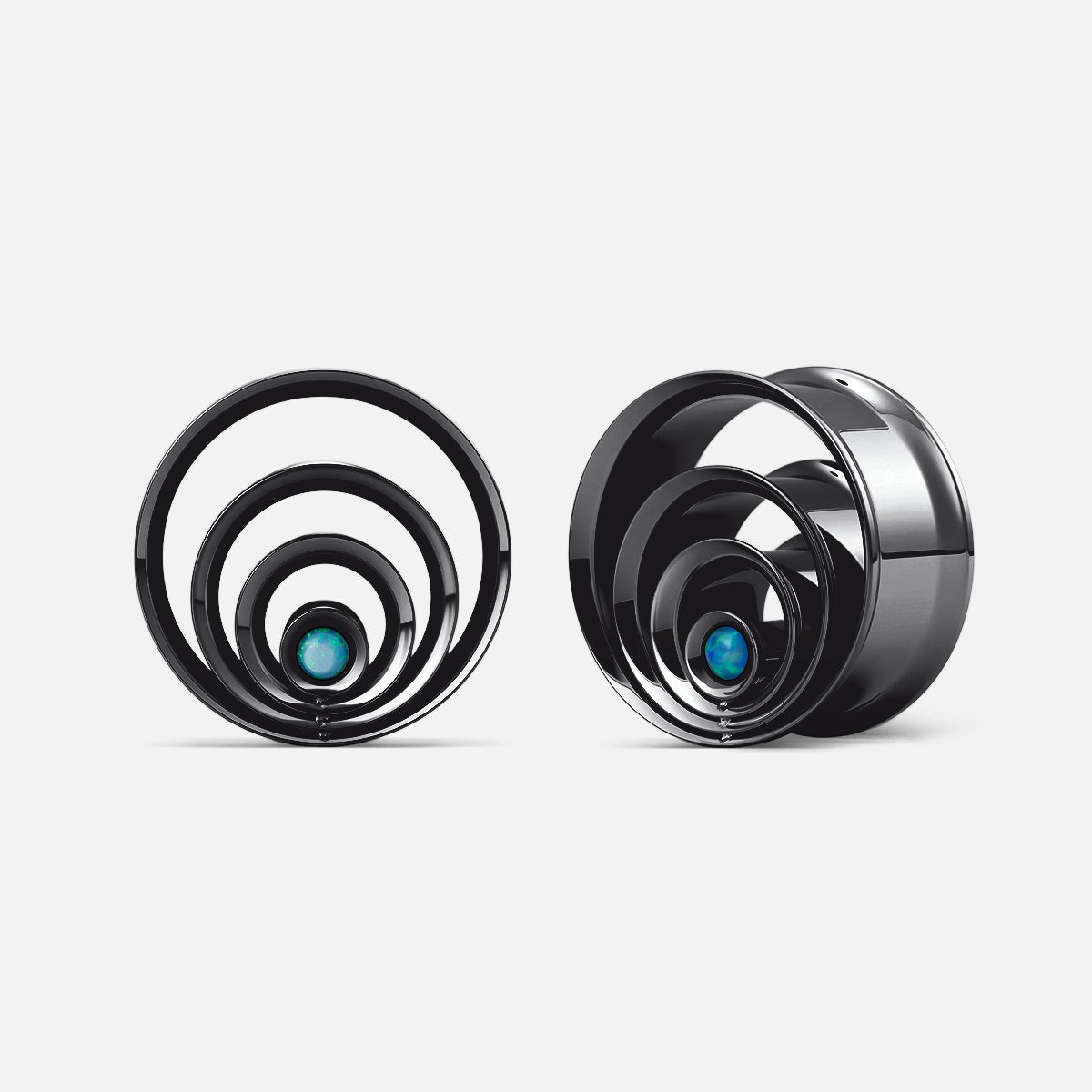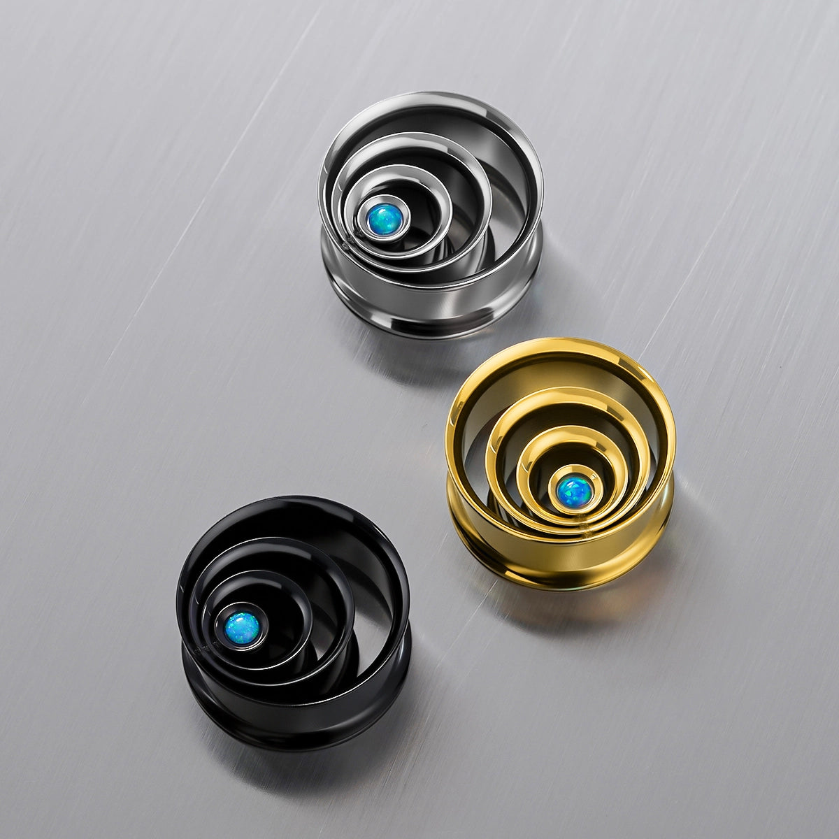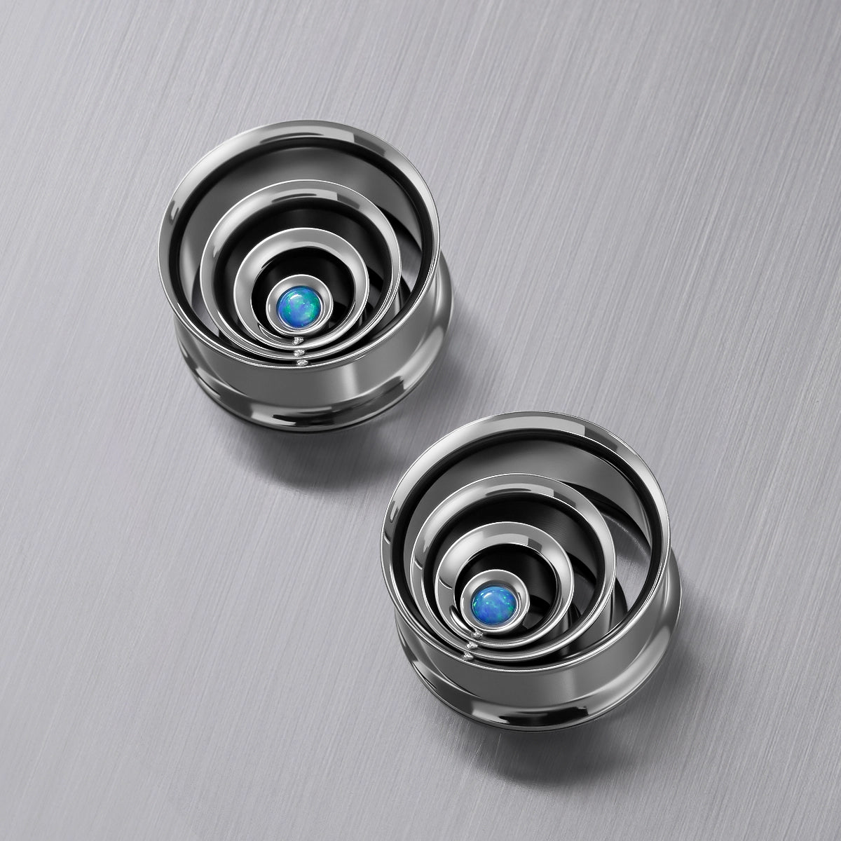 Galactic Core Tunnels feature a multi-ring spiral structure centering a vibrant synthetic opal, available in gold, black, and silver finishes. This item is sold as a pair.