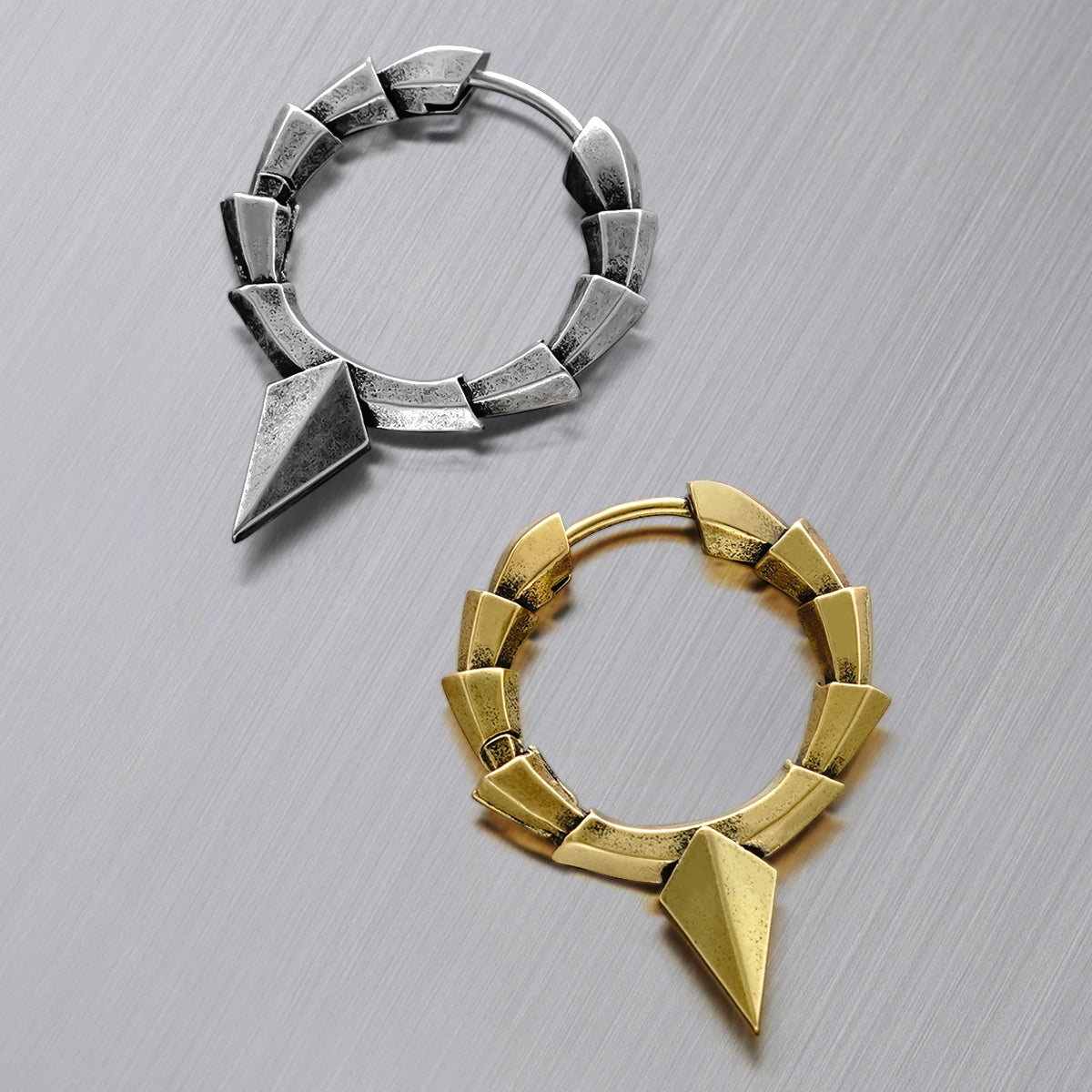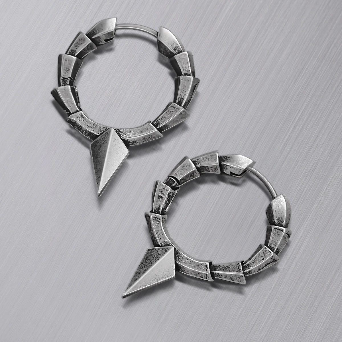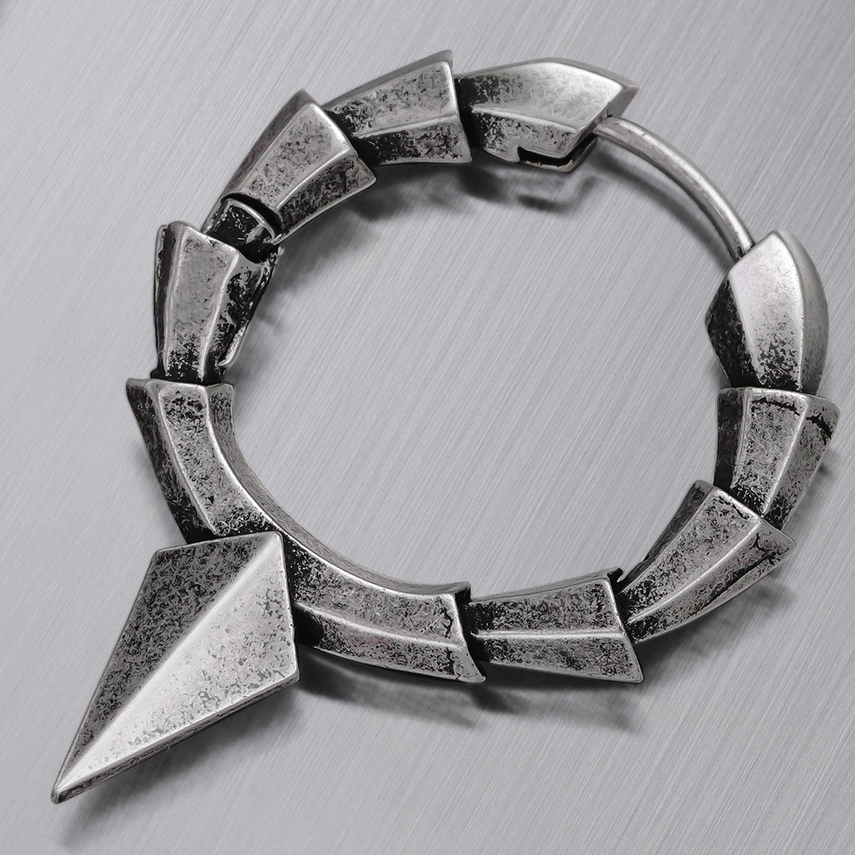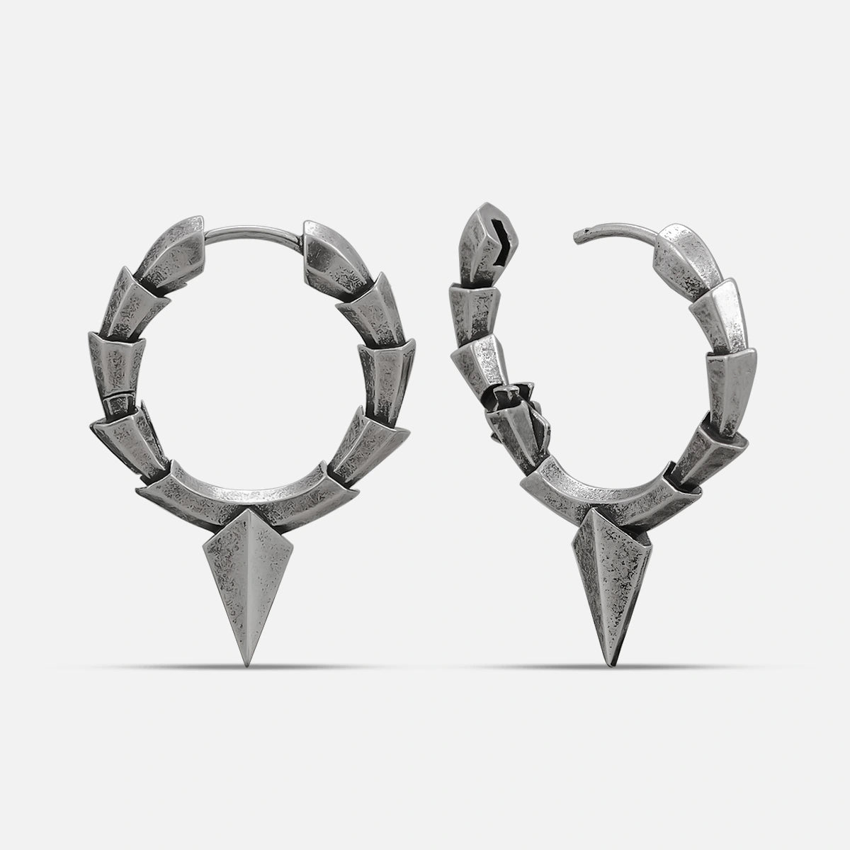 Geometric Armor Earring features a hoop made of sharp, angled segments and a pointed drop spike, finished in distressed silver for a bold, armored look. This item is sold as a pair.