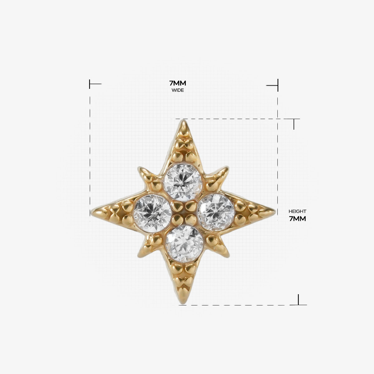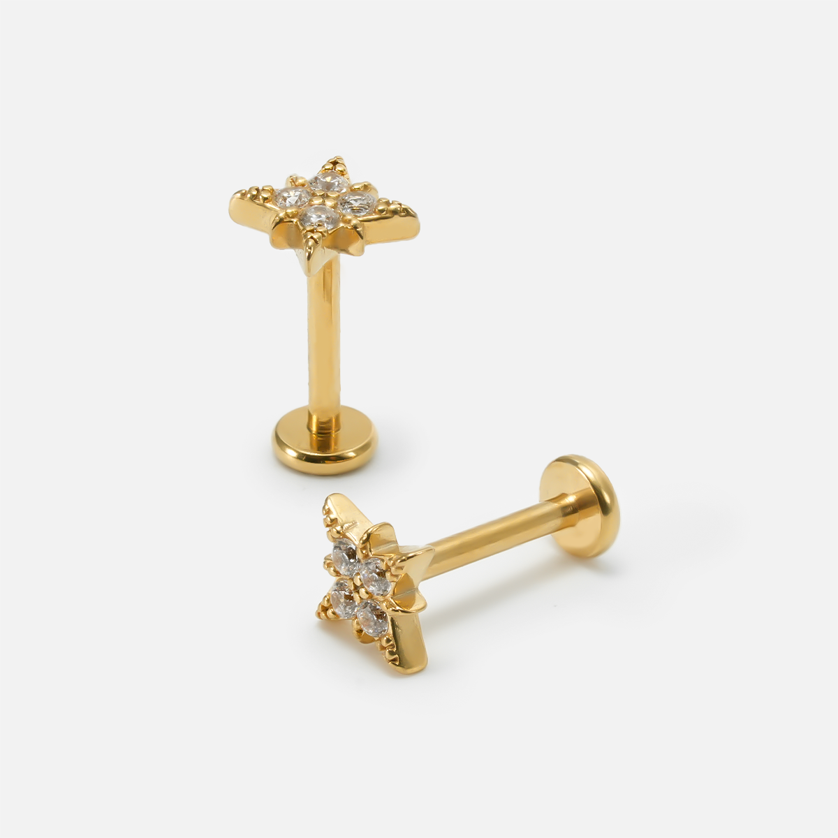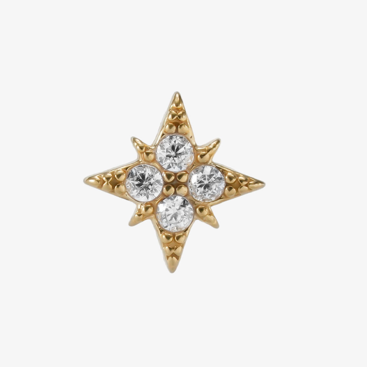 This gold-tone flat back stud features a radiant four-point star design set with shimmering cubic zirconia stones. This item is sold individually.