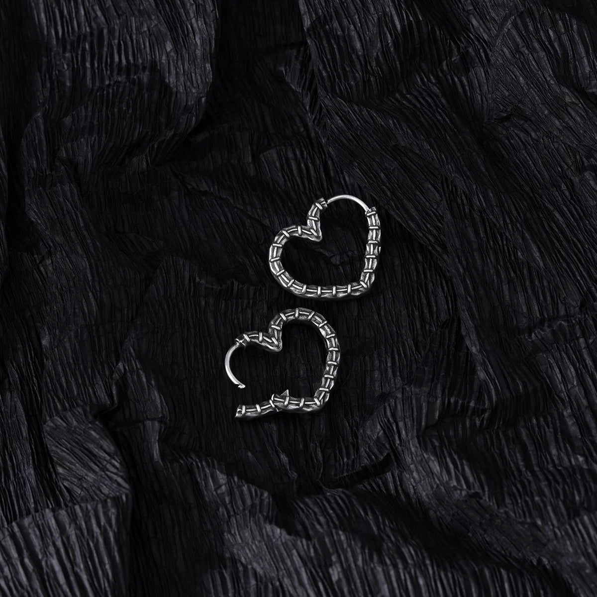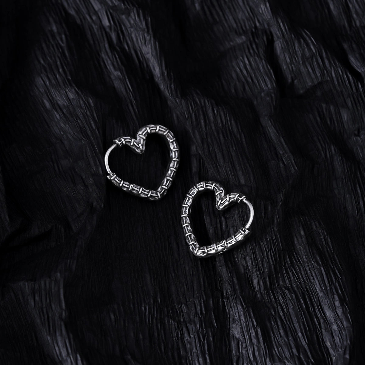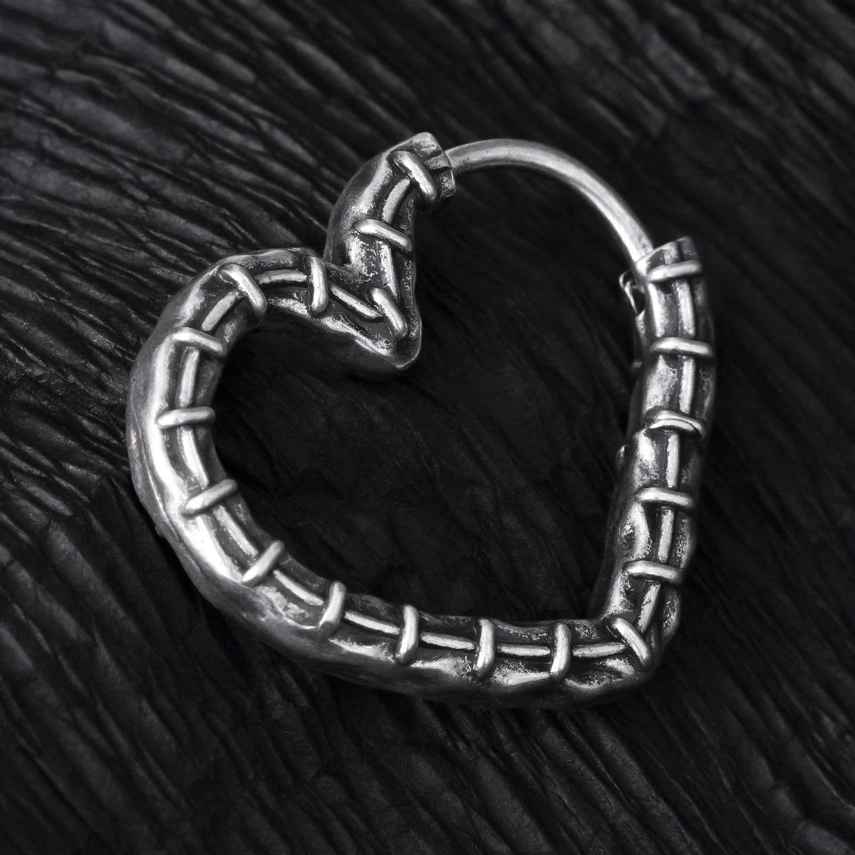 Crafted with a unique heart shape and intricate stitching details, these earrings blend elegance with an edgy twist. This item is sold as a pair.