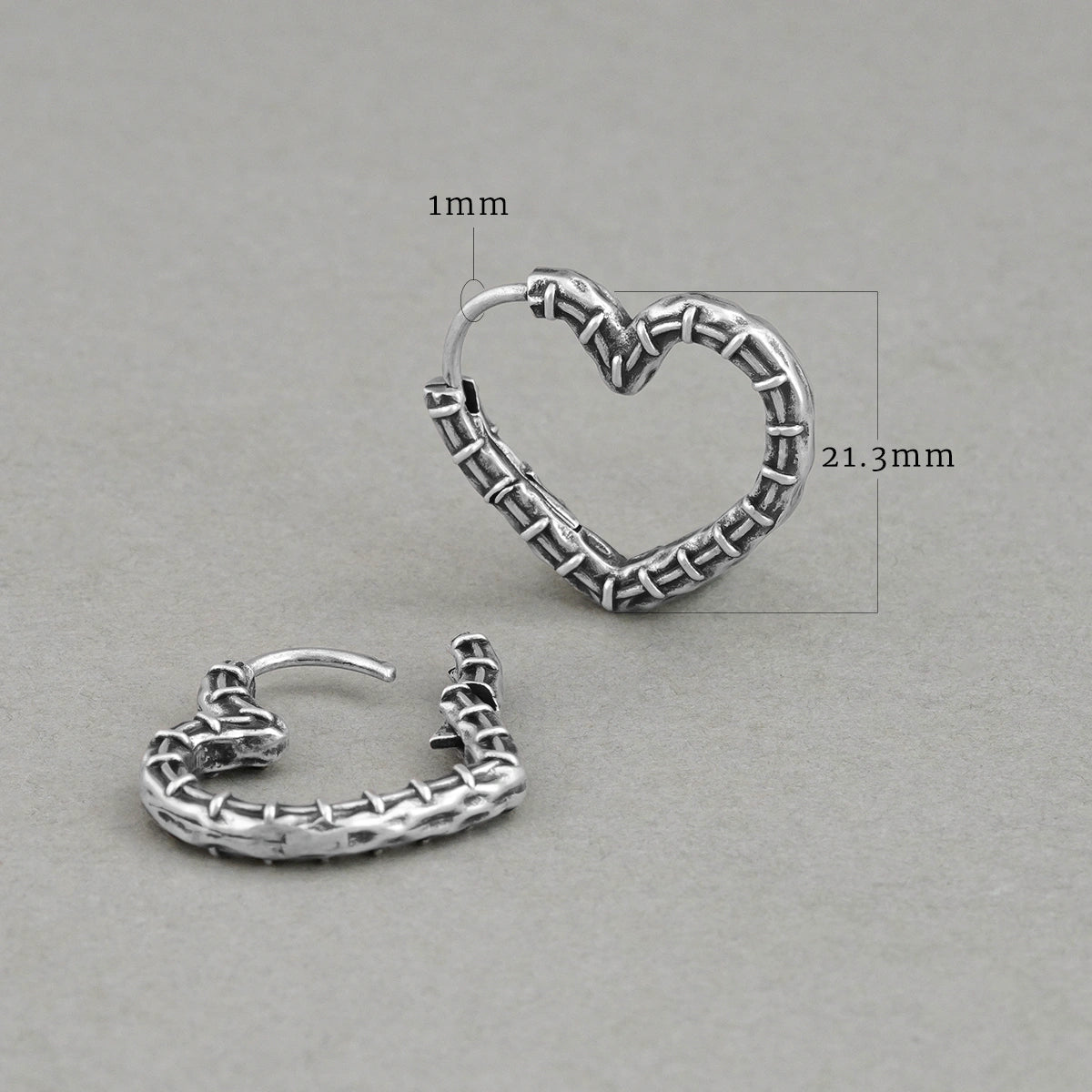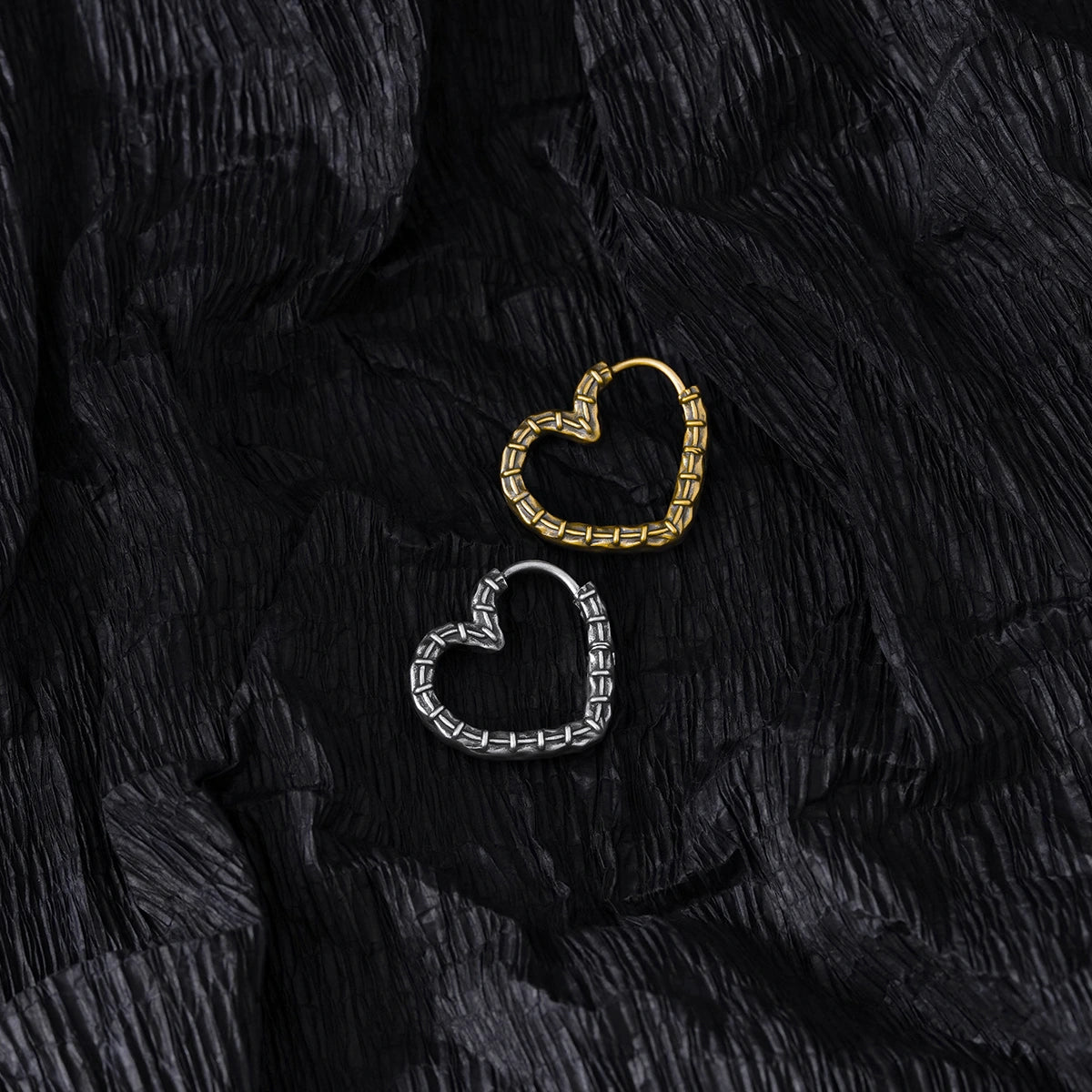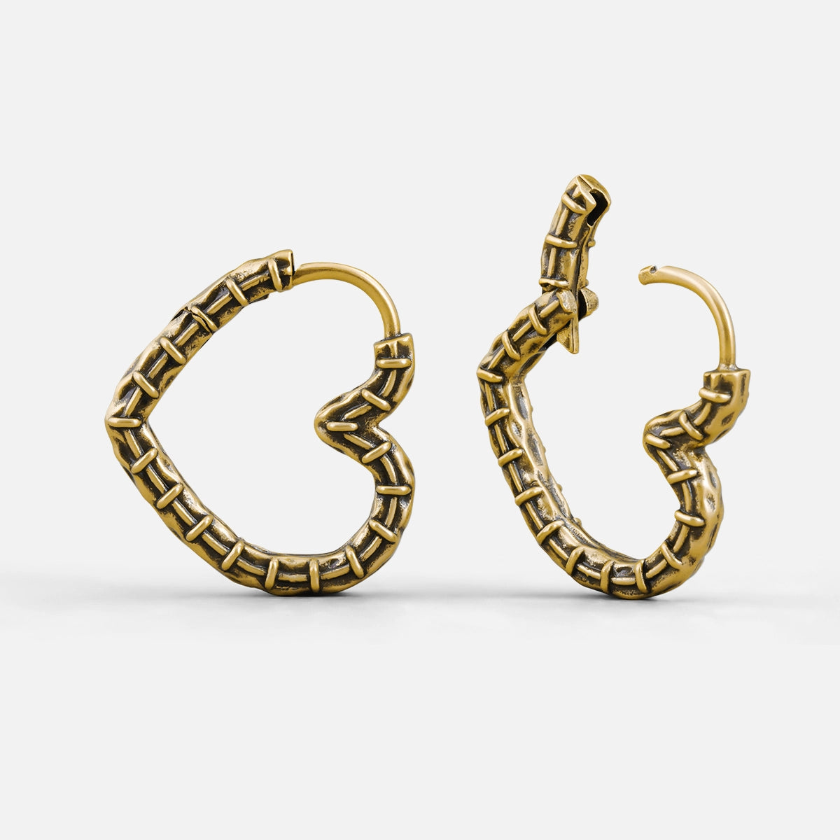 Crafted with a unique heart shape and intricate stitching details, these earrings blend elegance with an edgy twist. This item is sold as a pair.