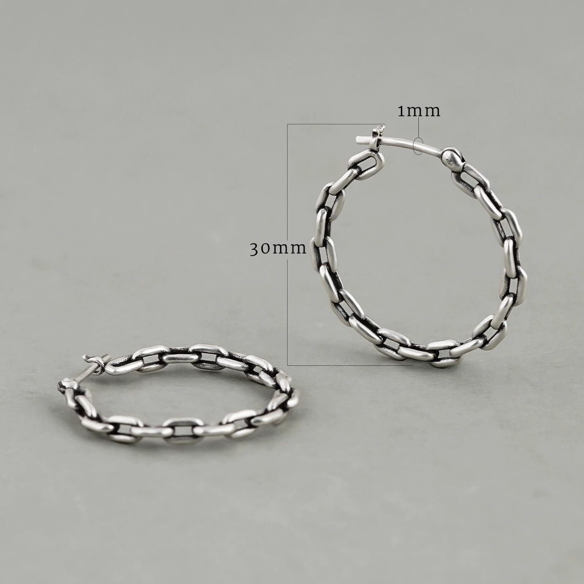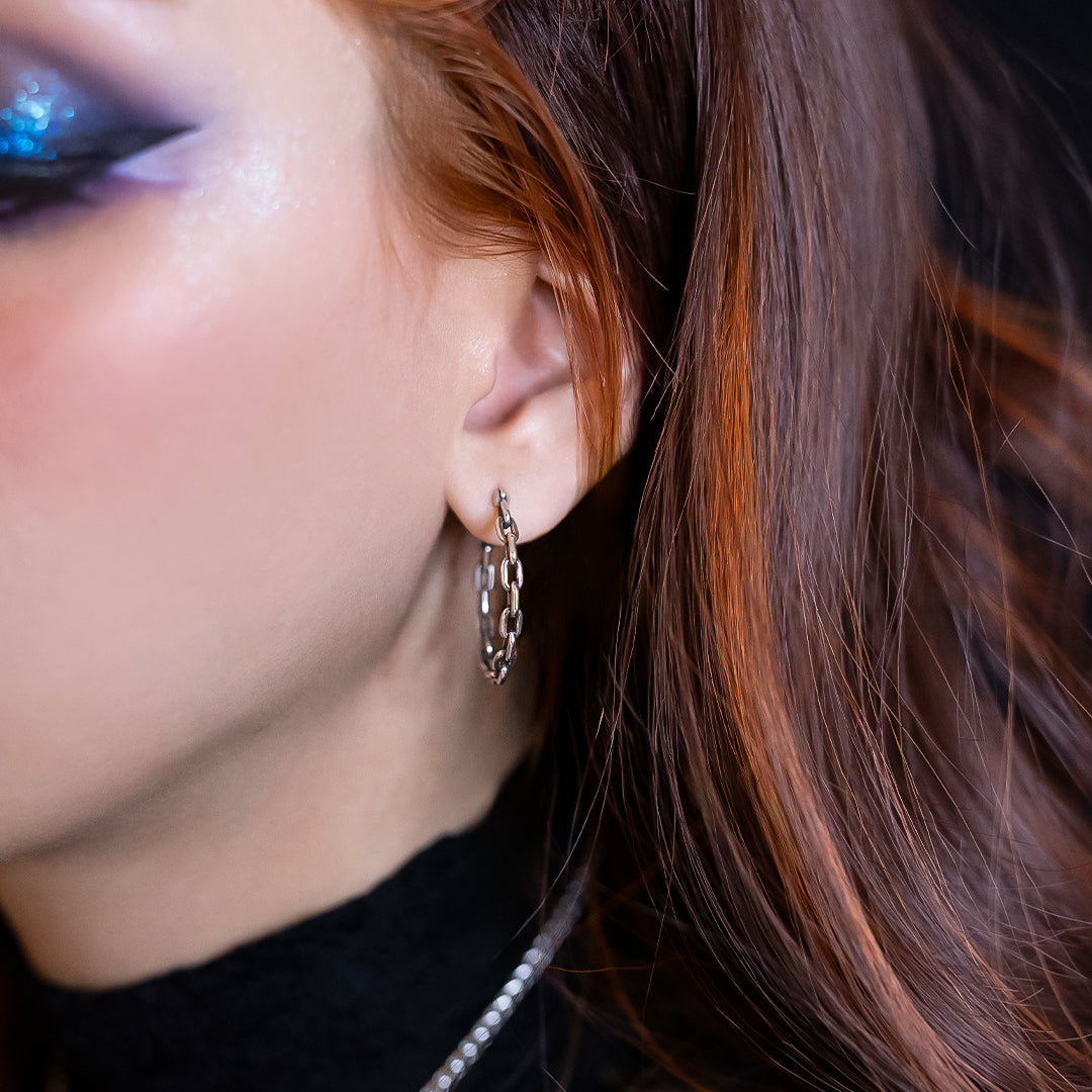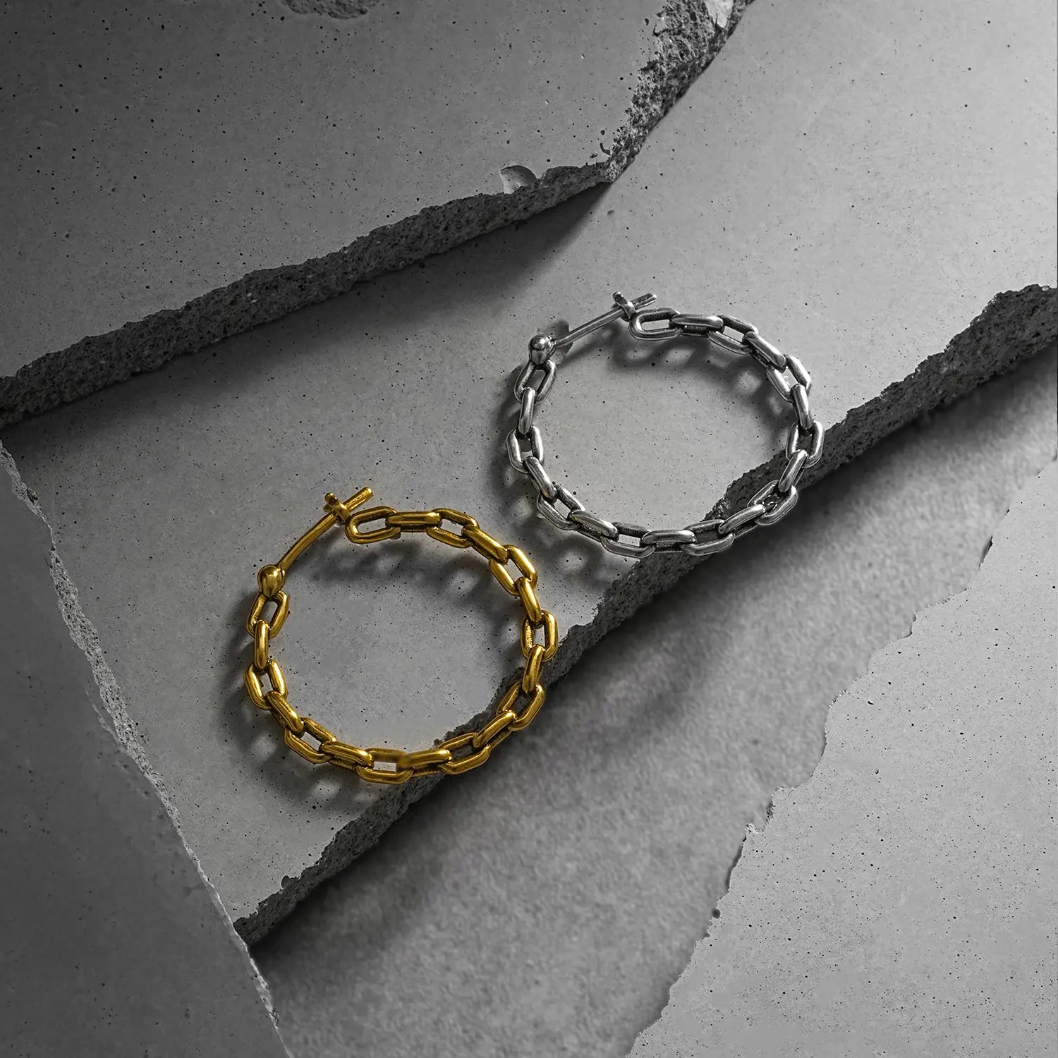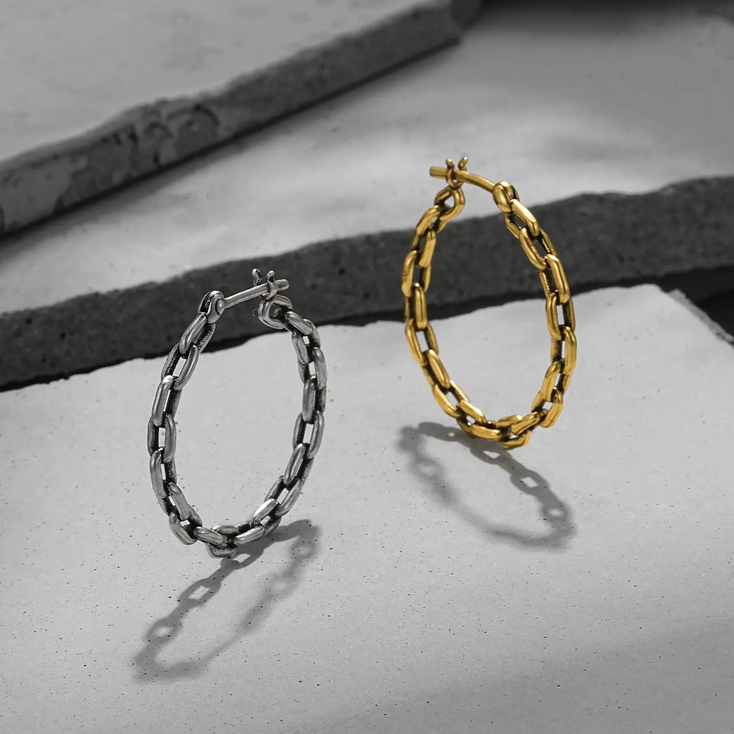 These Industrial Chain Earrings feature a bold hoop design with interlinked chain elements, offering a sleek metallic finish. This item is sold as a pair.