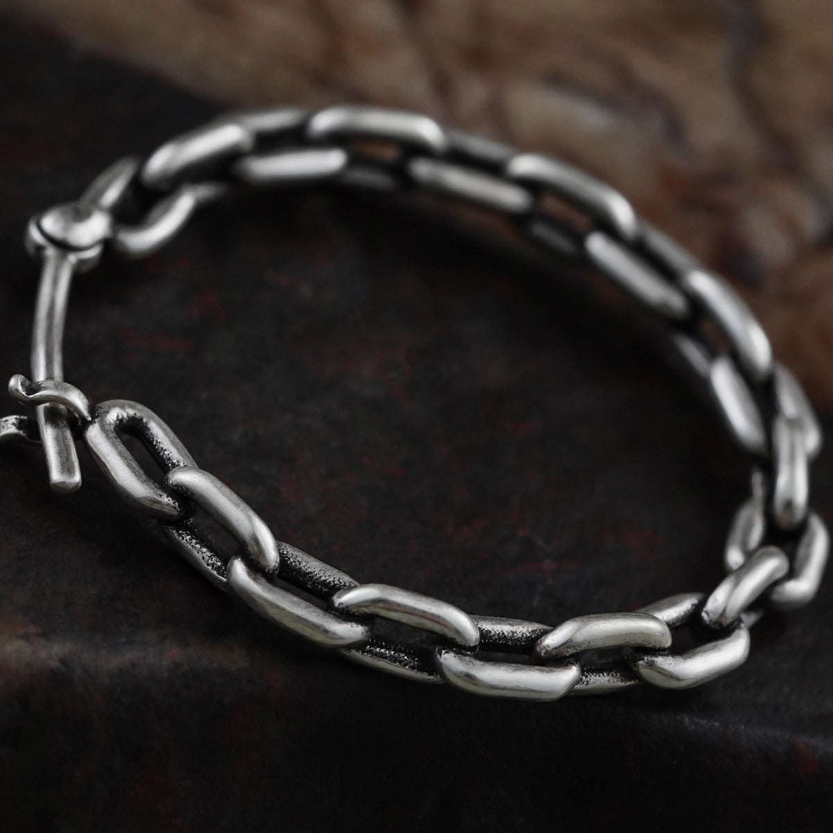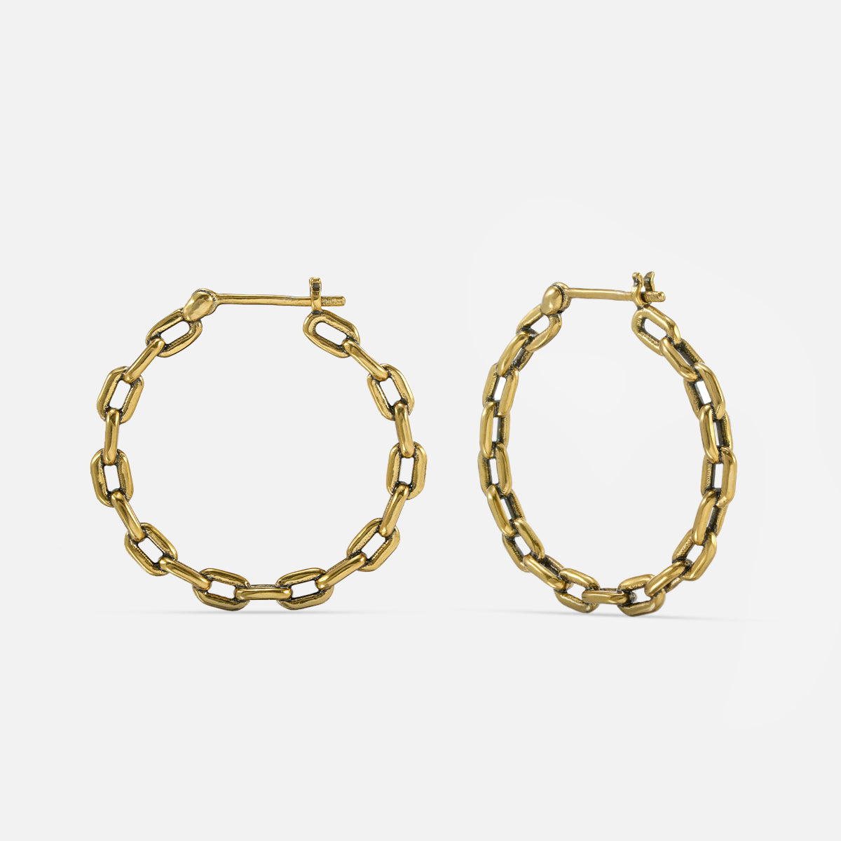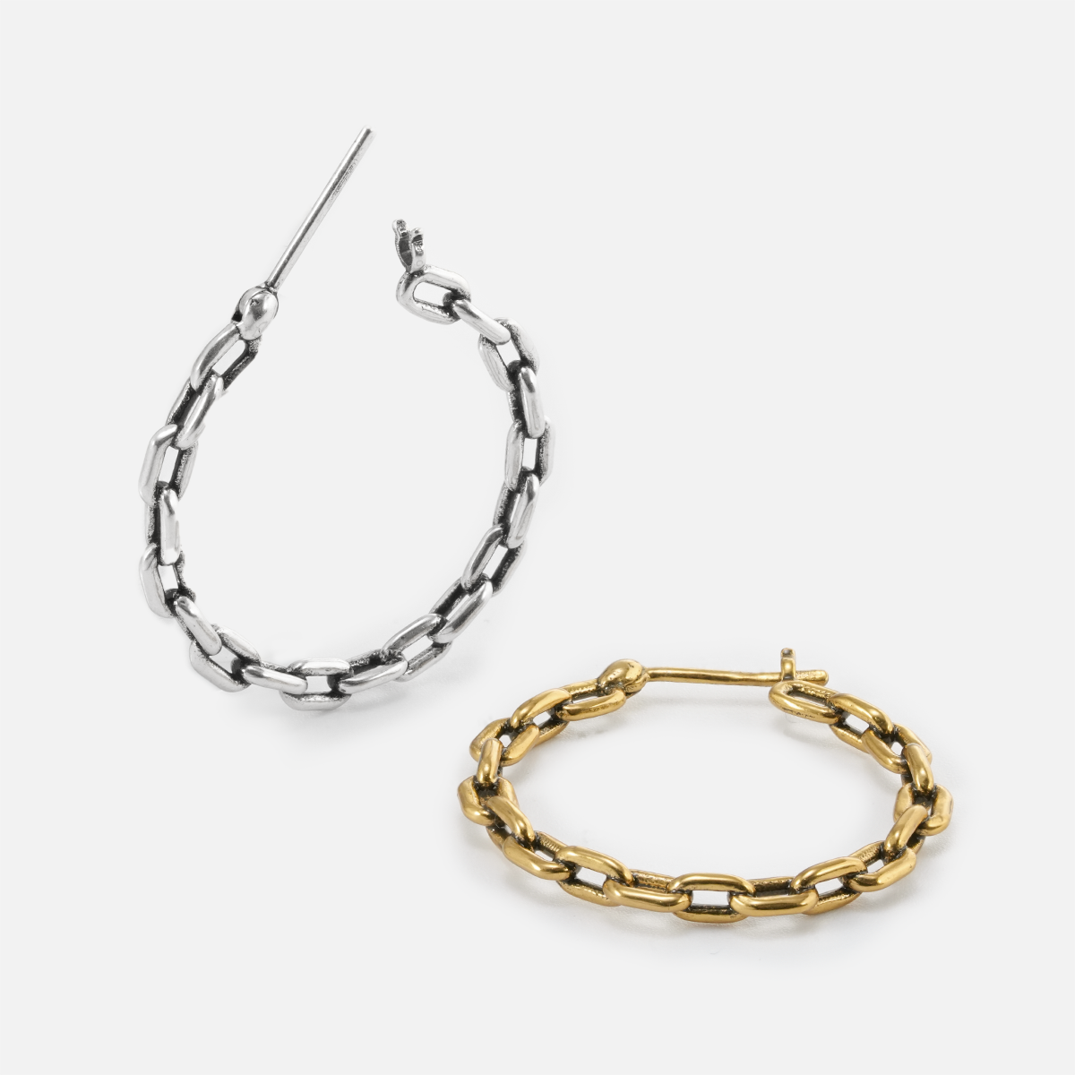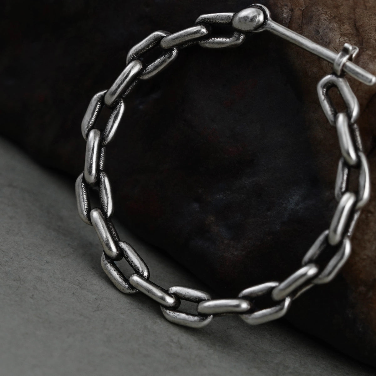 These Industrial Chain Earrings feature a bold hoop design with interlinked chain elements, offering a sleek metallic finish. This item is sold as a pair.