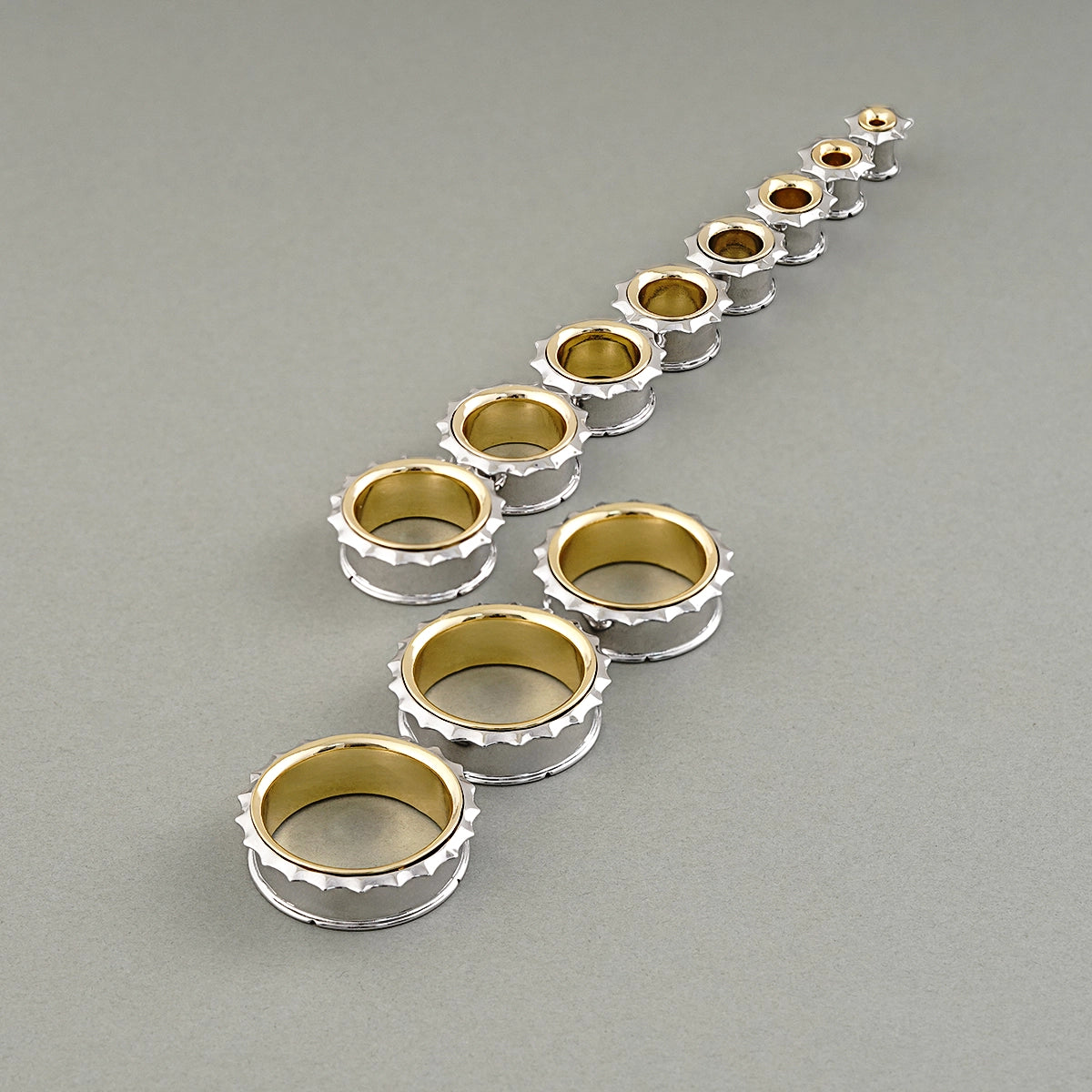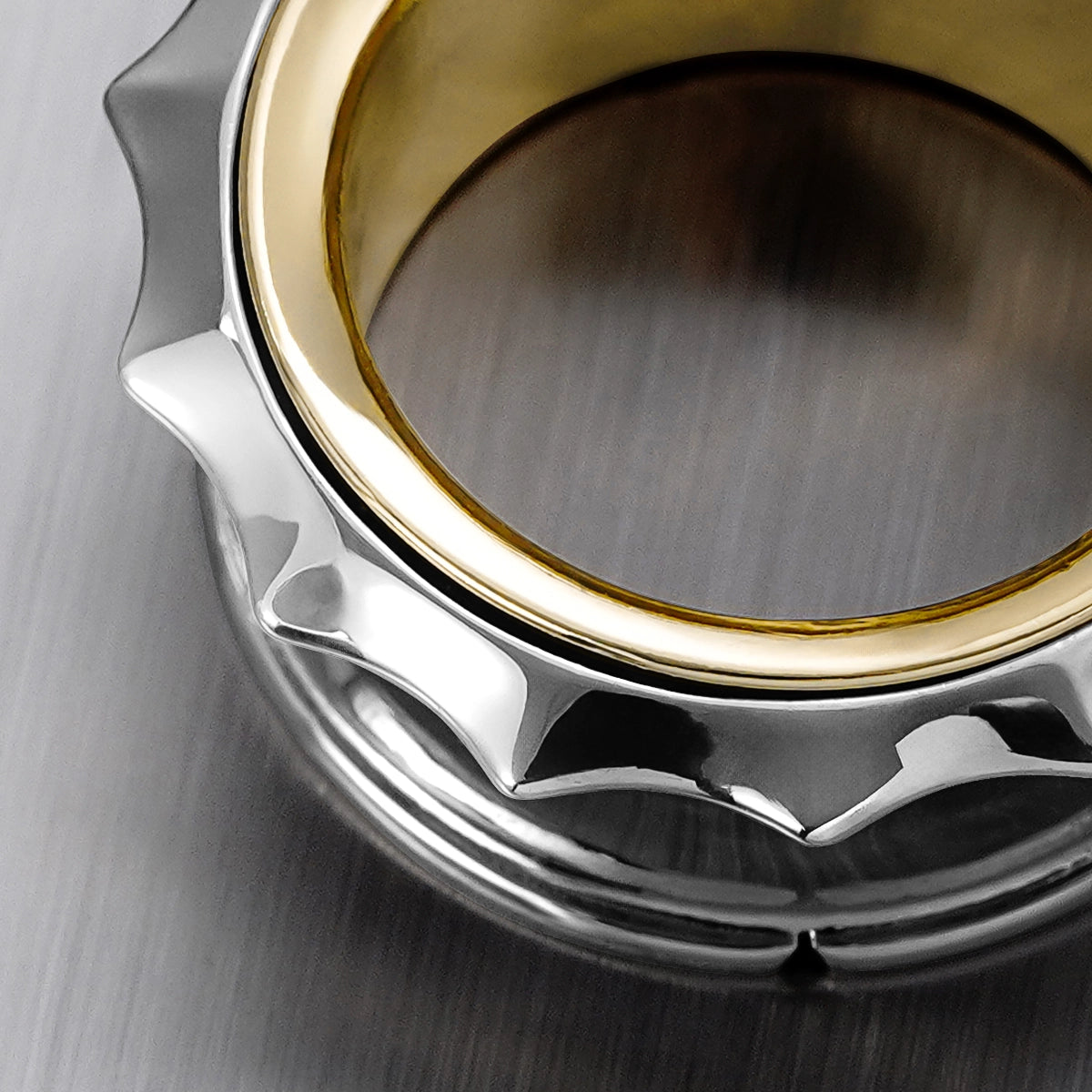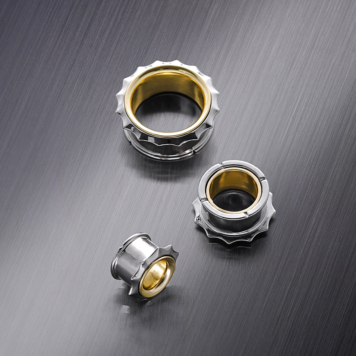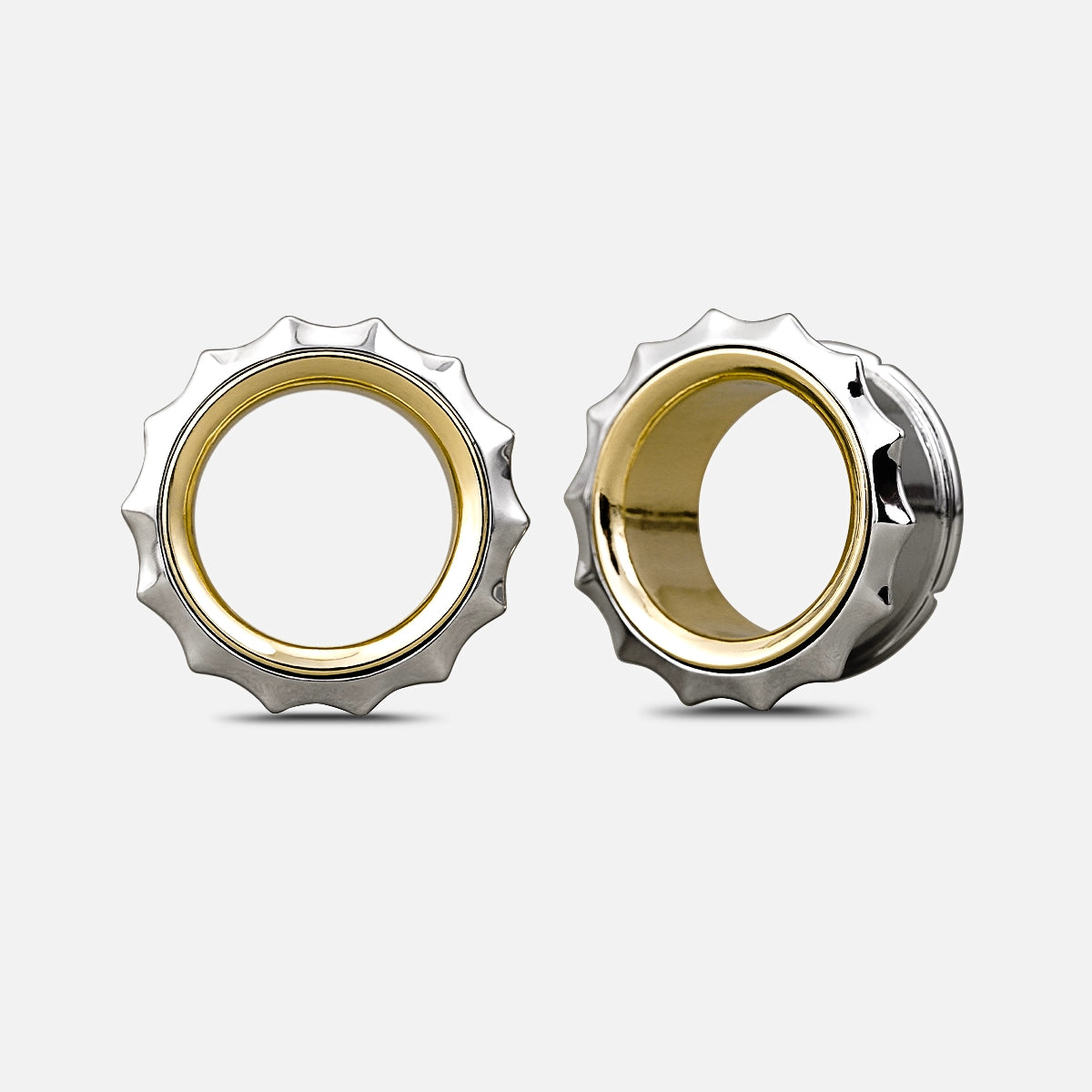 Sleek metallic tunnels with a striking gear-like edge, combining silver and gold tones for a bold, industrial look. This item is sold as a pair.