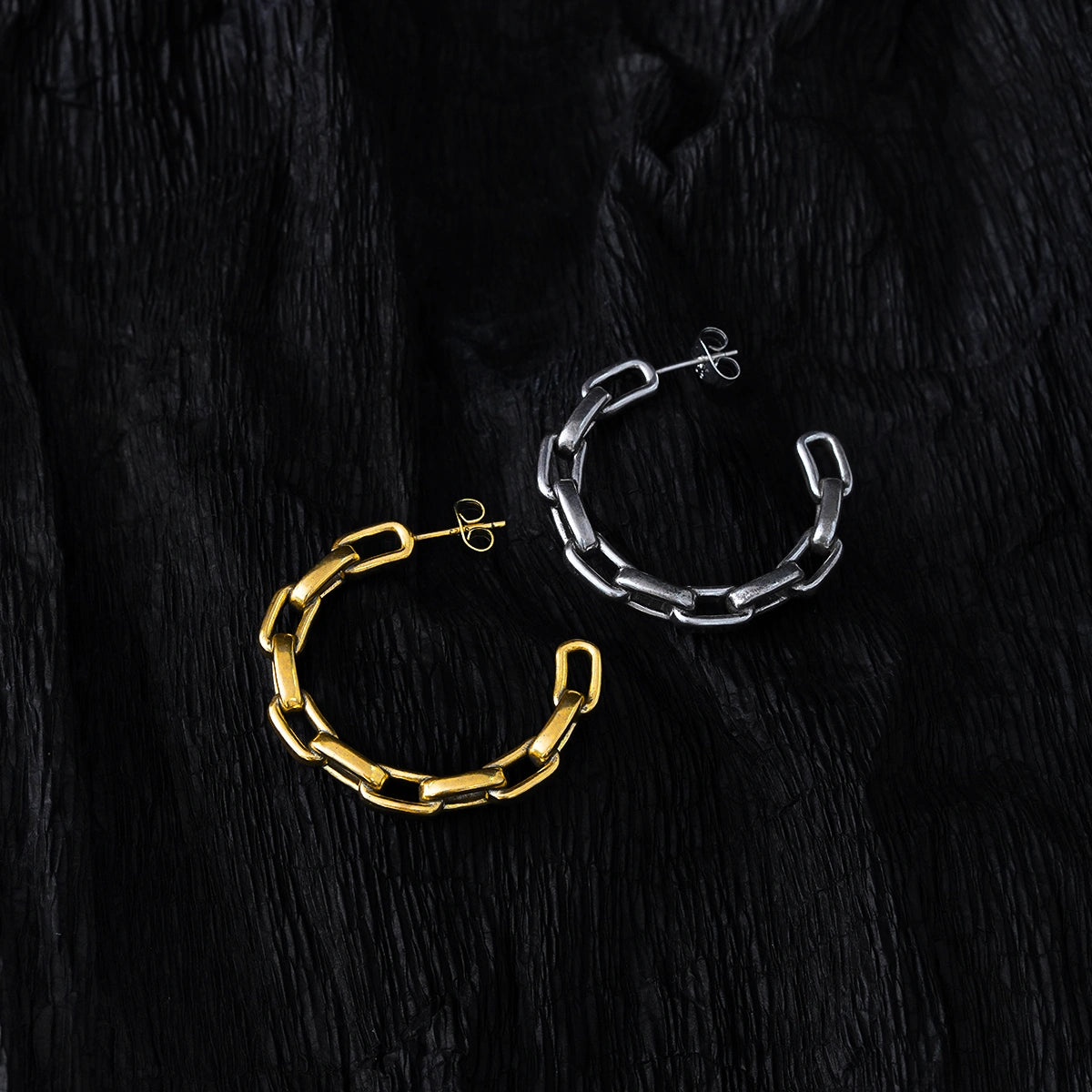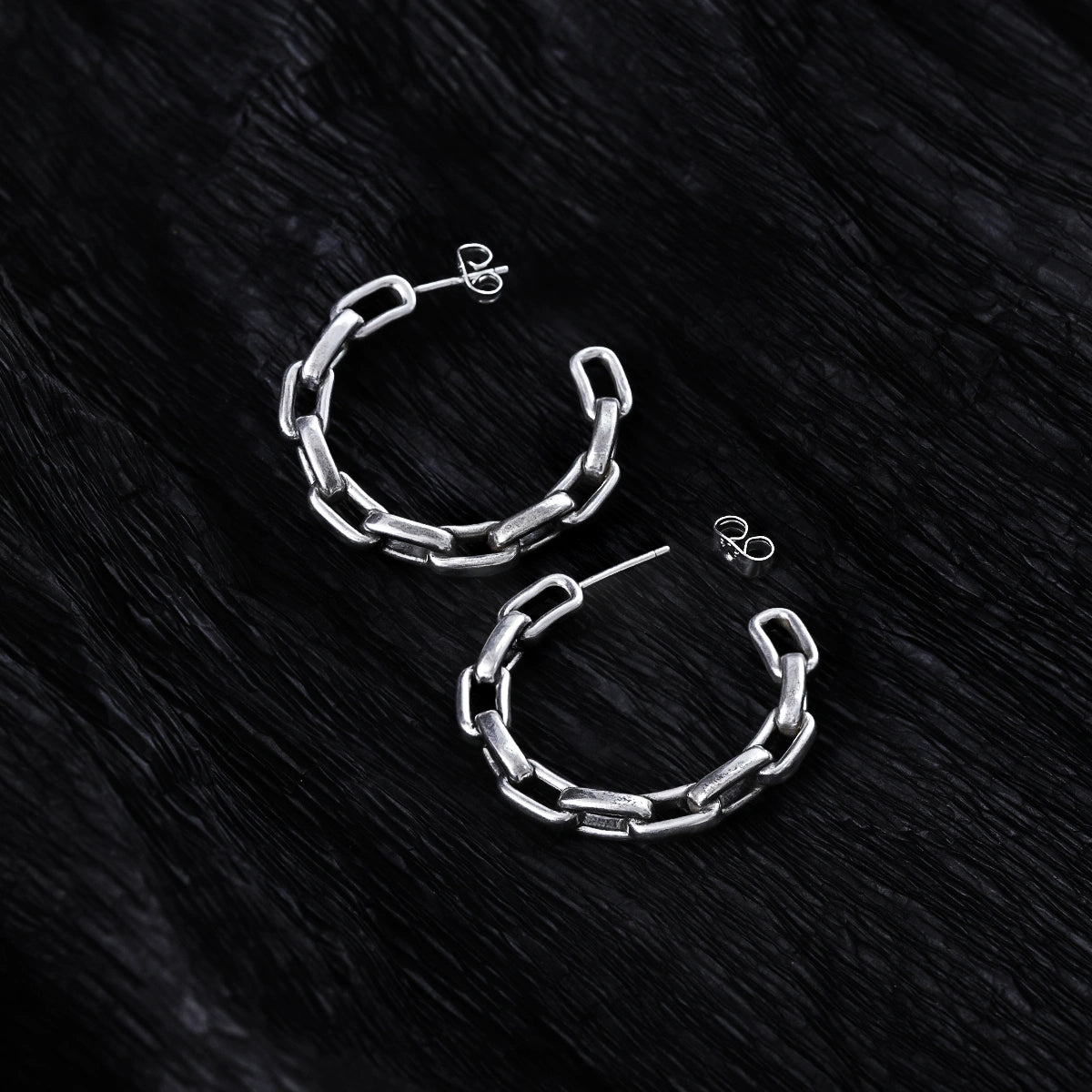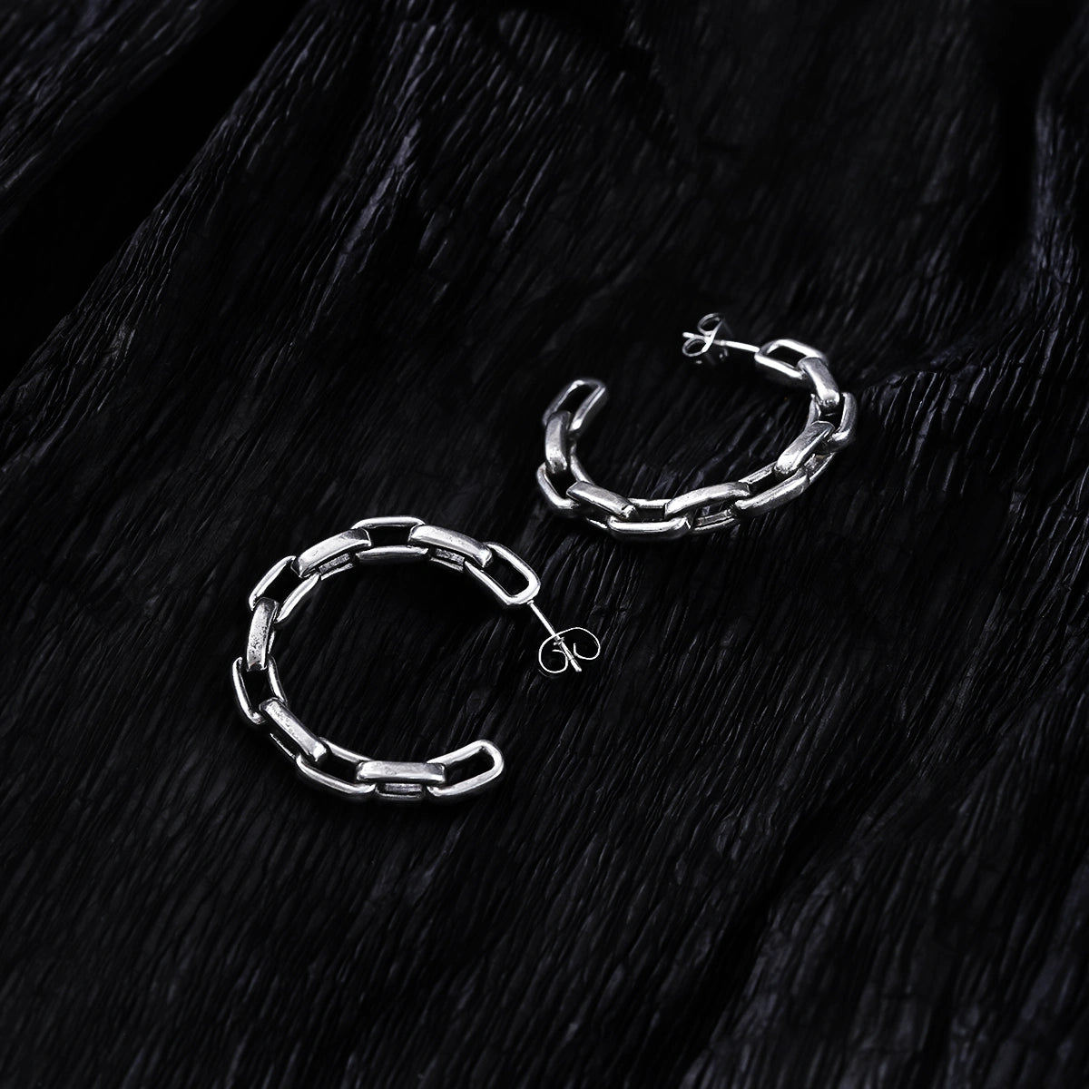 These industrial chain earrings feature a bold metal chain design, showcasing a unique mechanical aesthetic suitable for various piercing styles. This item is sold as a pair.