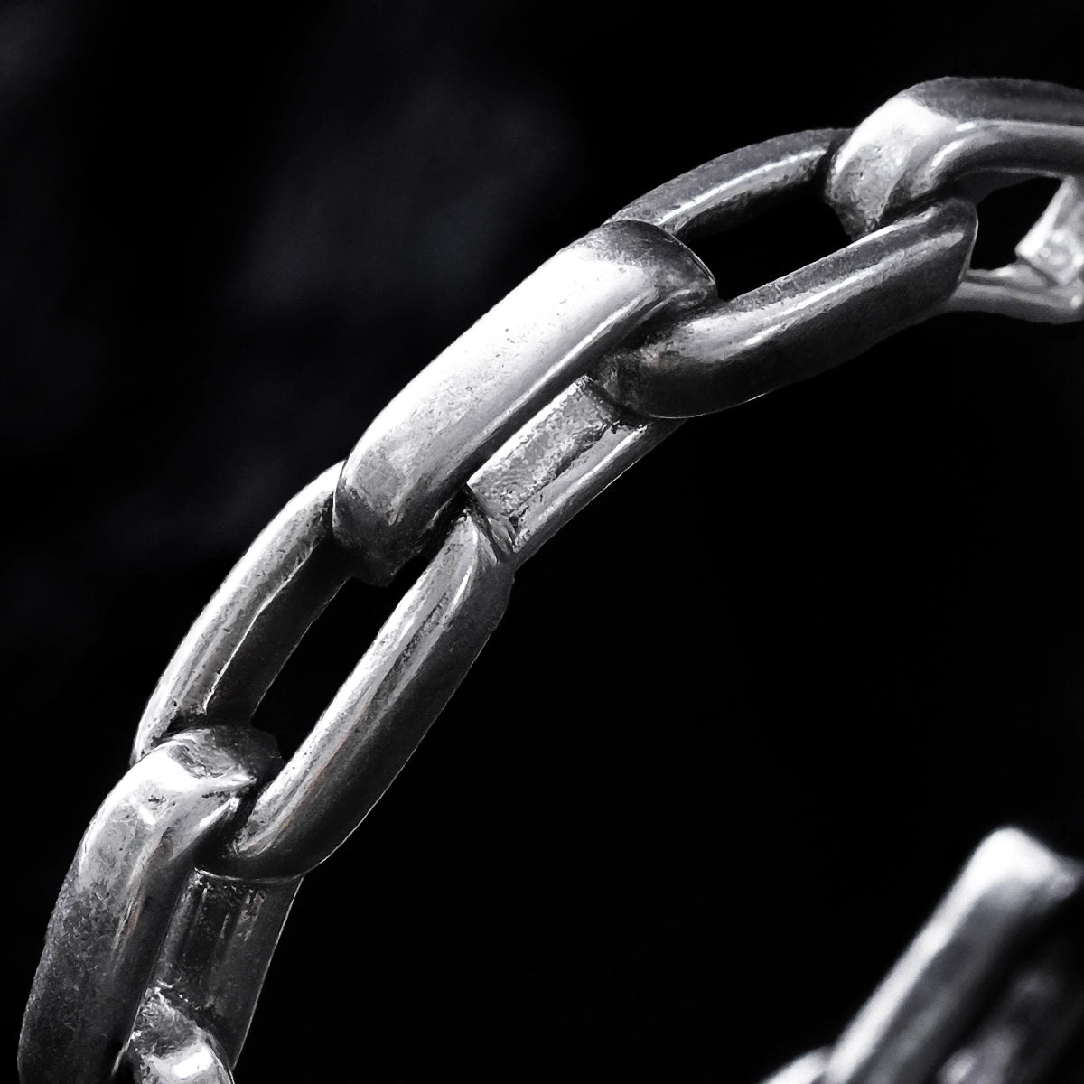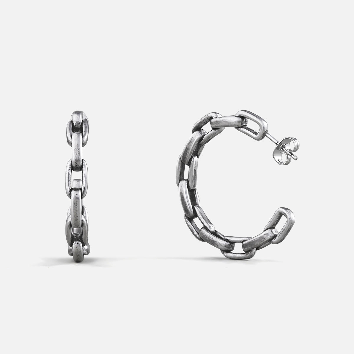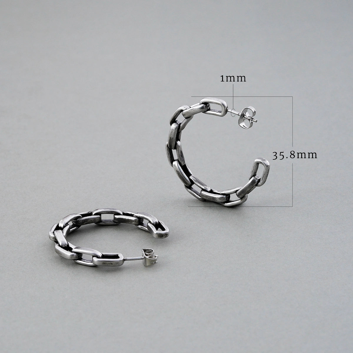 These industrial chain earrings feature a bold metal chain design, showcasing a unique mechanical aesthetic suitable for various piercing styles. This item is sold as a pair.