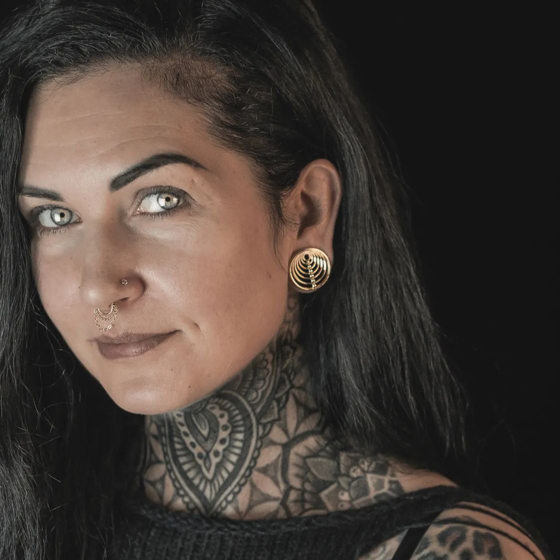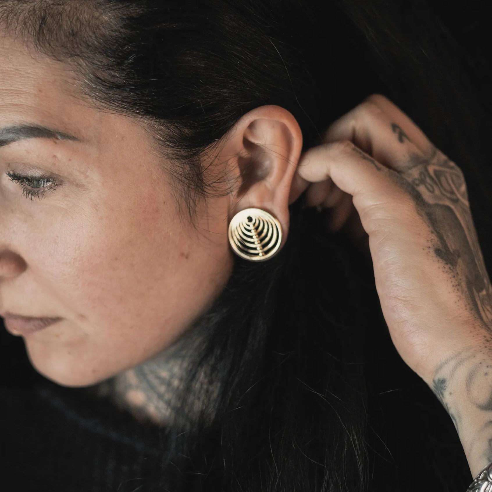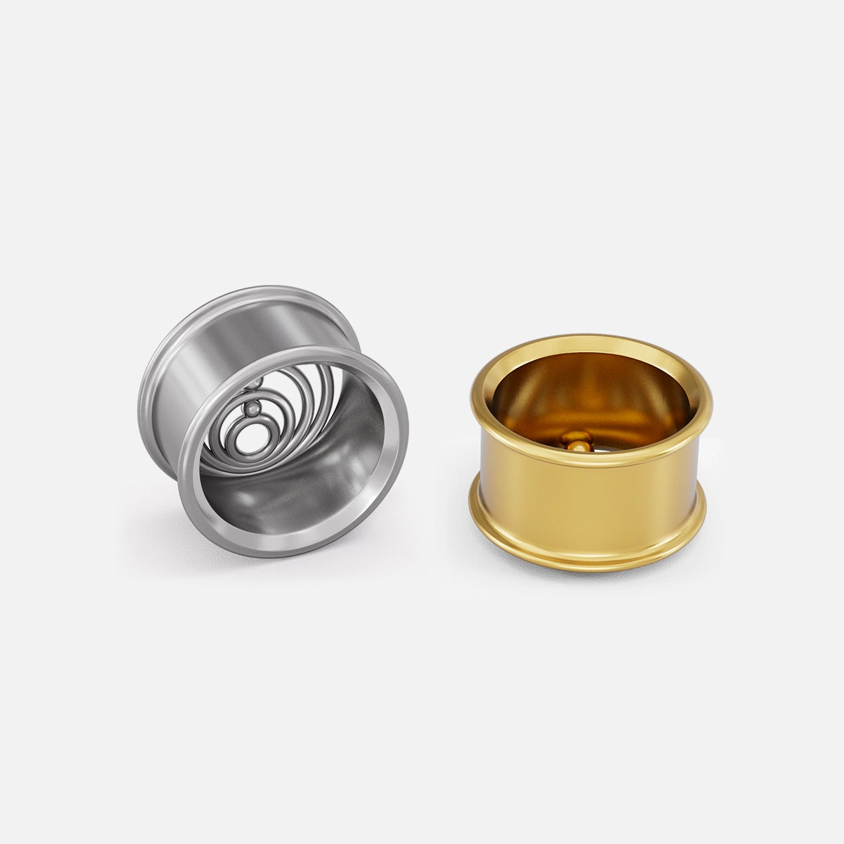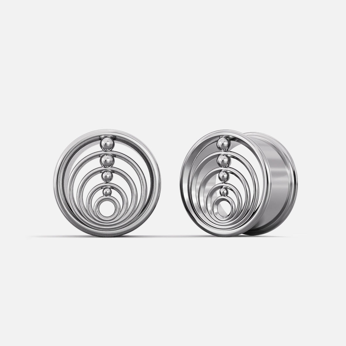 Discover the sleek elegance of our Infinite Harmony Tunnels, featuring a captivating concentric circle design with a polished metallic finish. This item is sold as a pair.