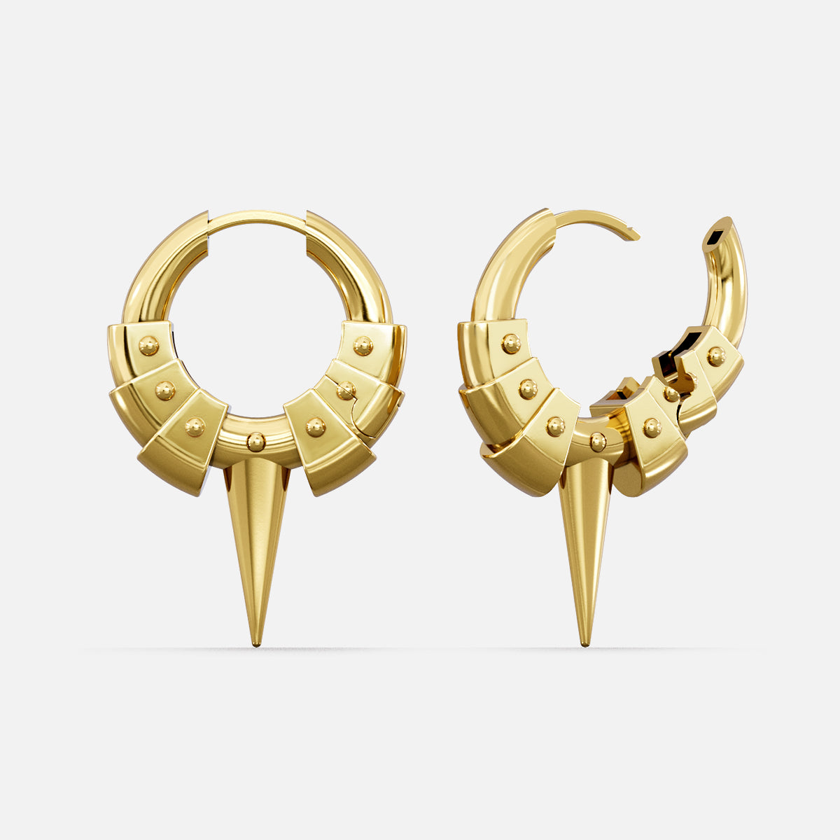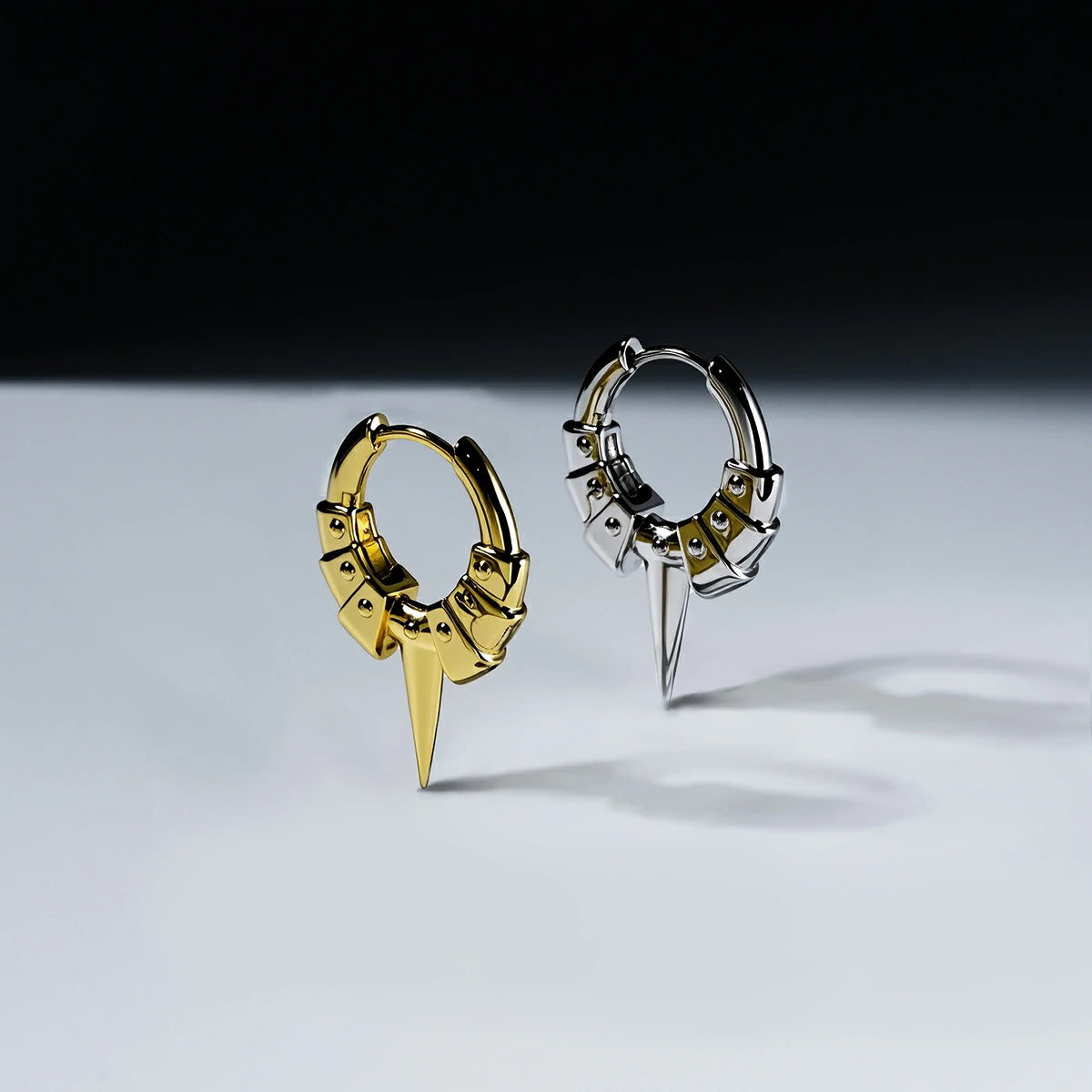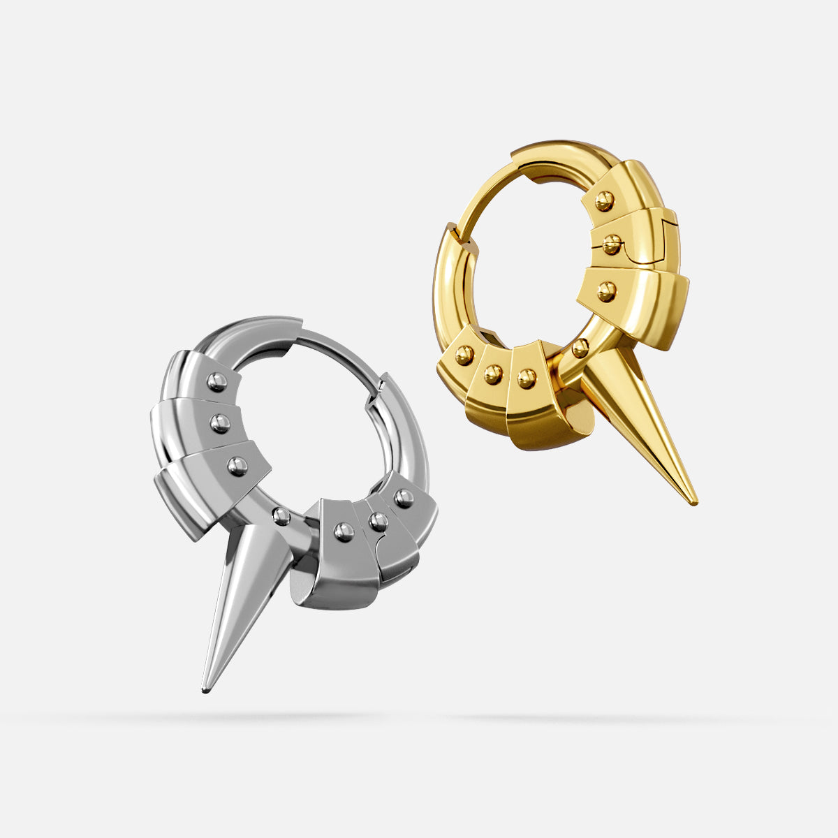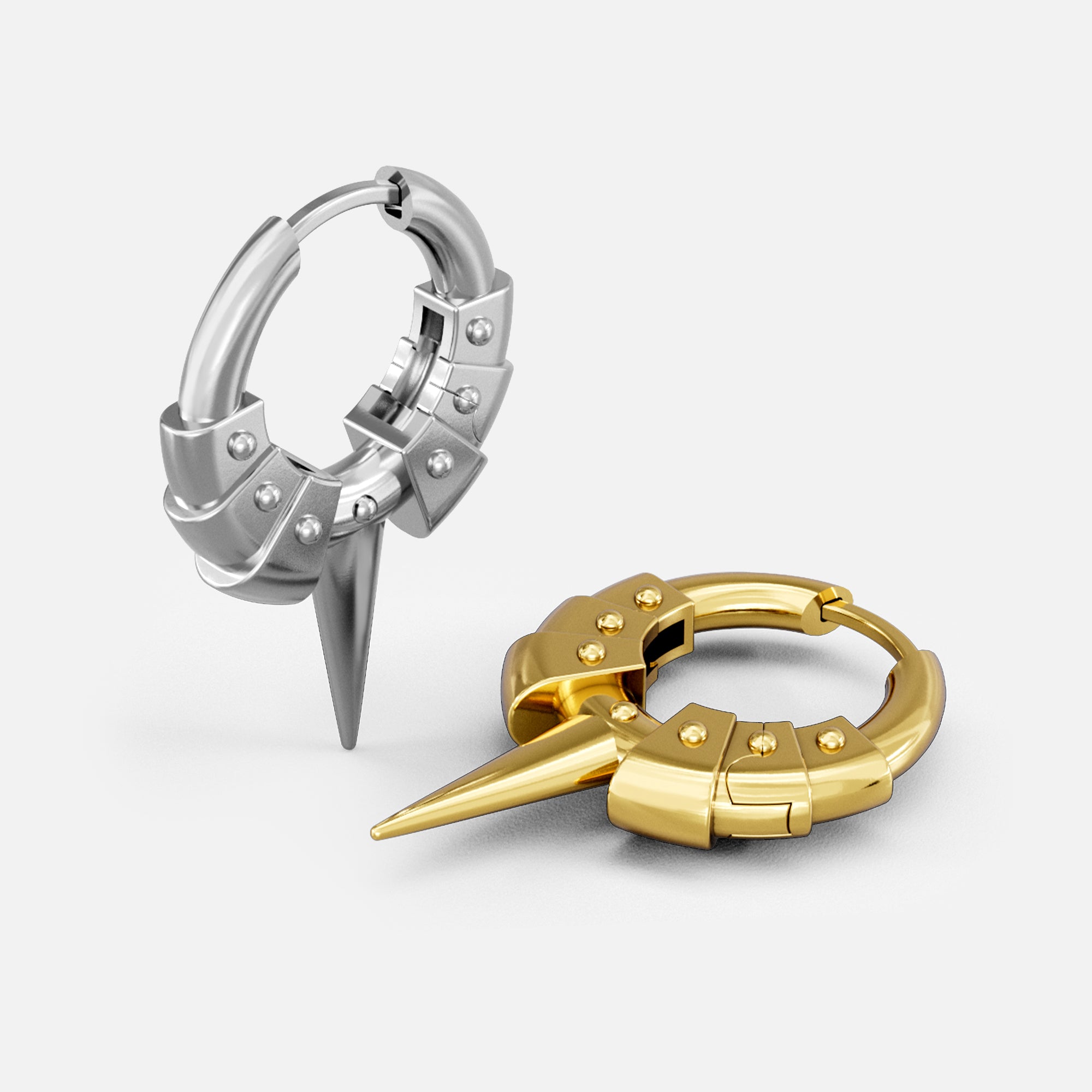 The Spike Plate Hoop Earrings stack armor plates along the hoop, converging at a tapered spike that reads as controlled force. Hinged closure seats cleanly, edges register precisely, and the form stays sharp without excess.