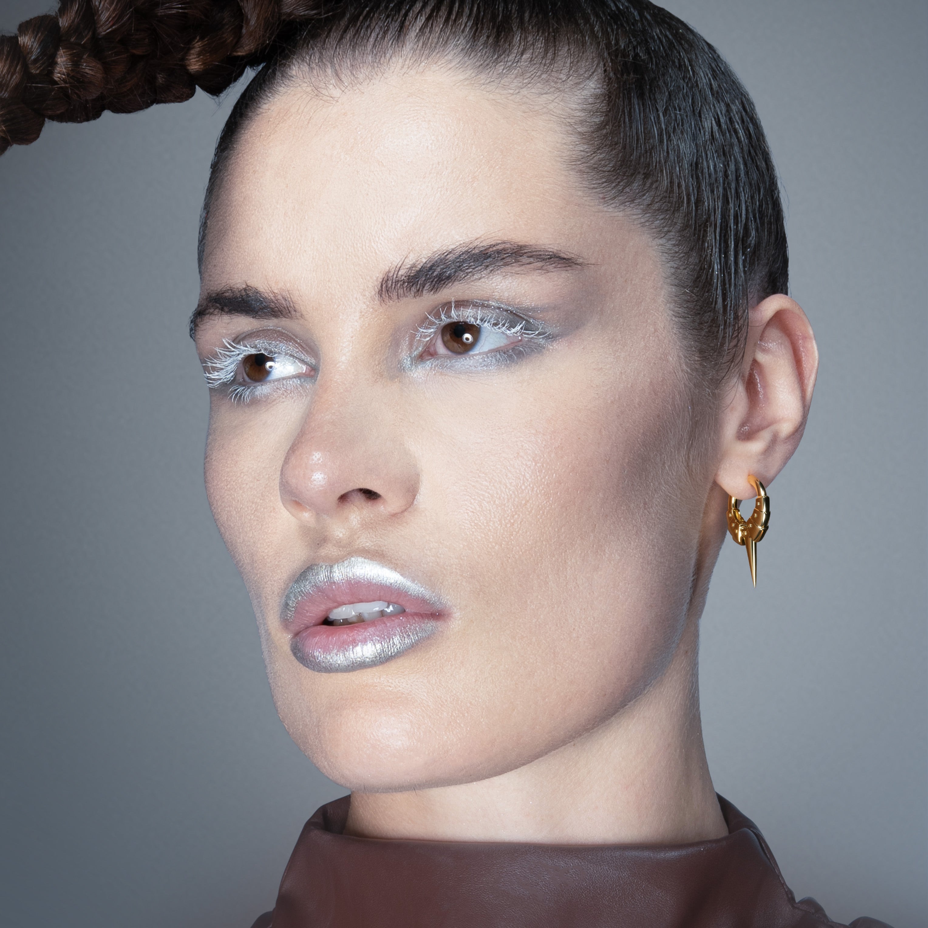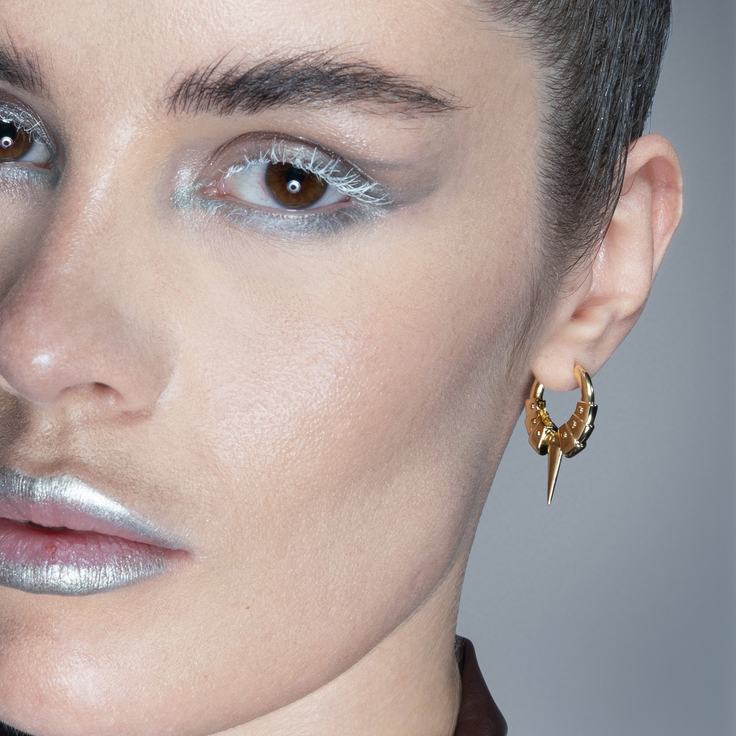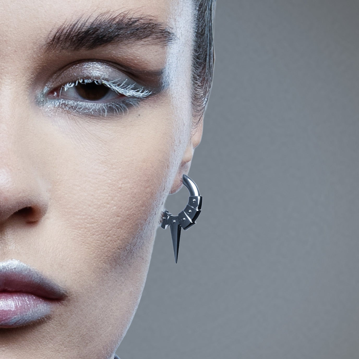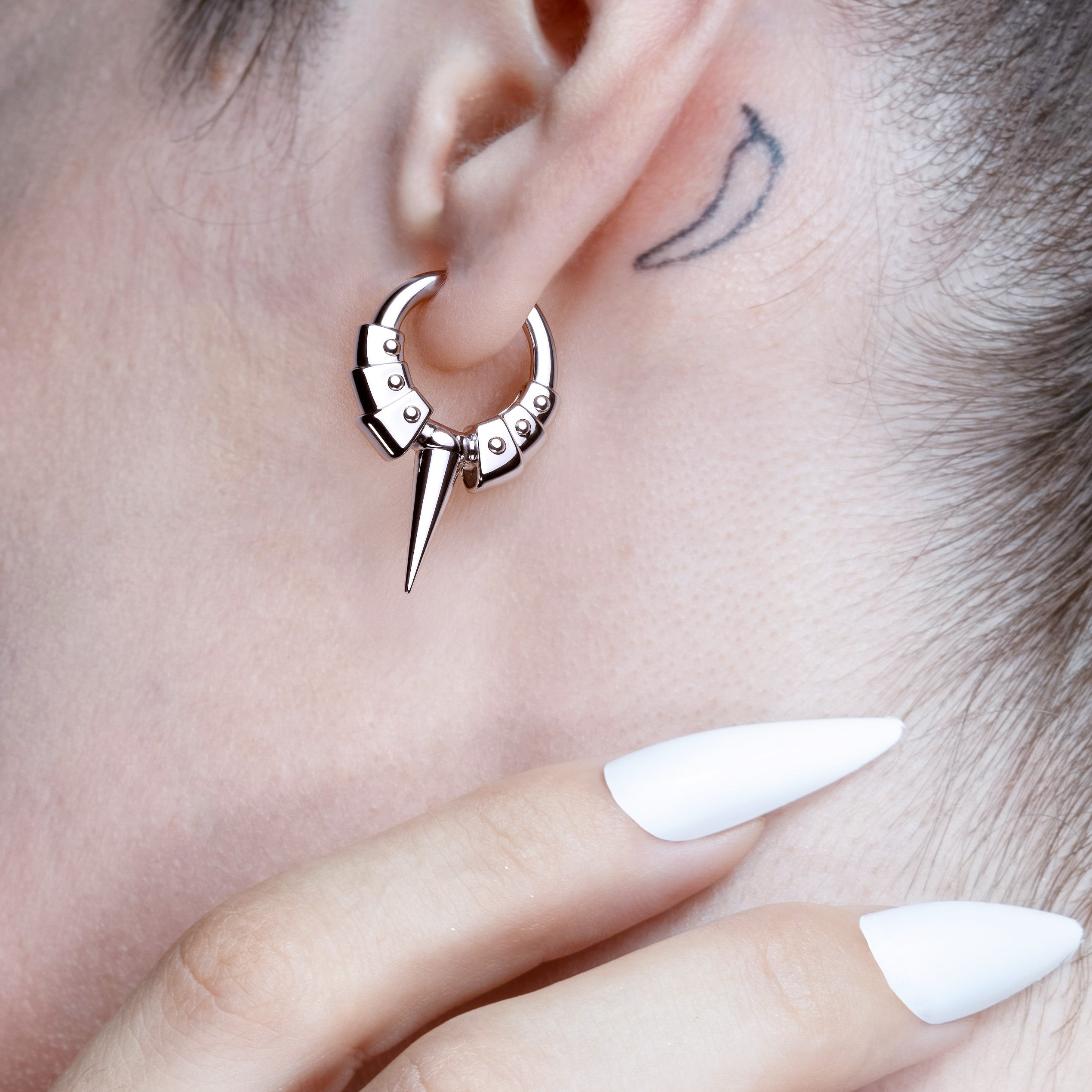 The Spike Plate Hoop Earrings stack armor plates along the hoop, converging at a tapered spike that reads as controlled force. Hinged closure seats cleanly, edges register precisely, and the form stays sharp without excess.