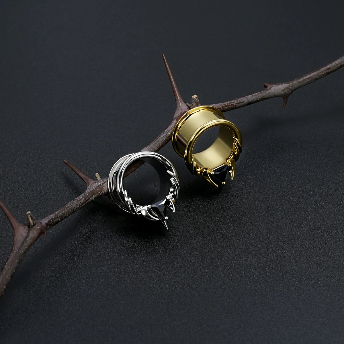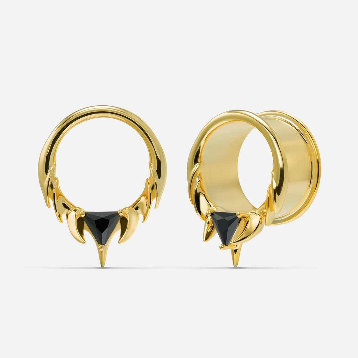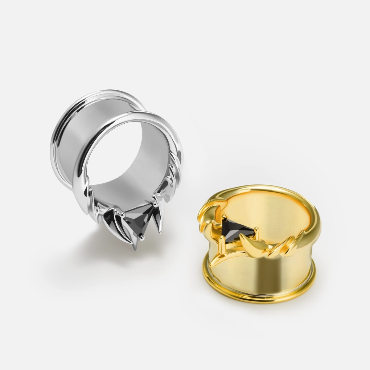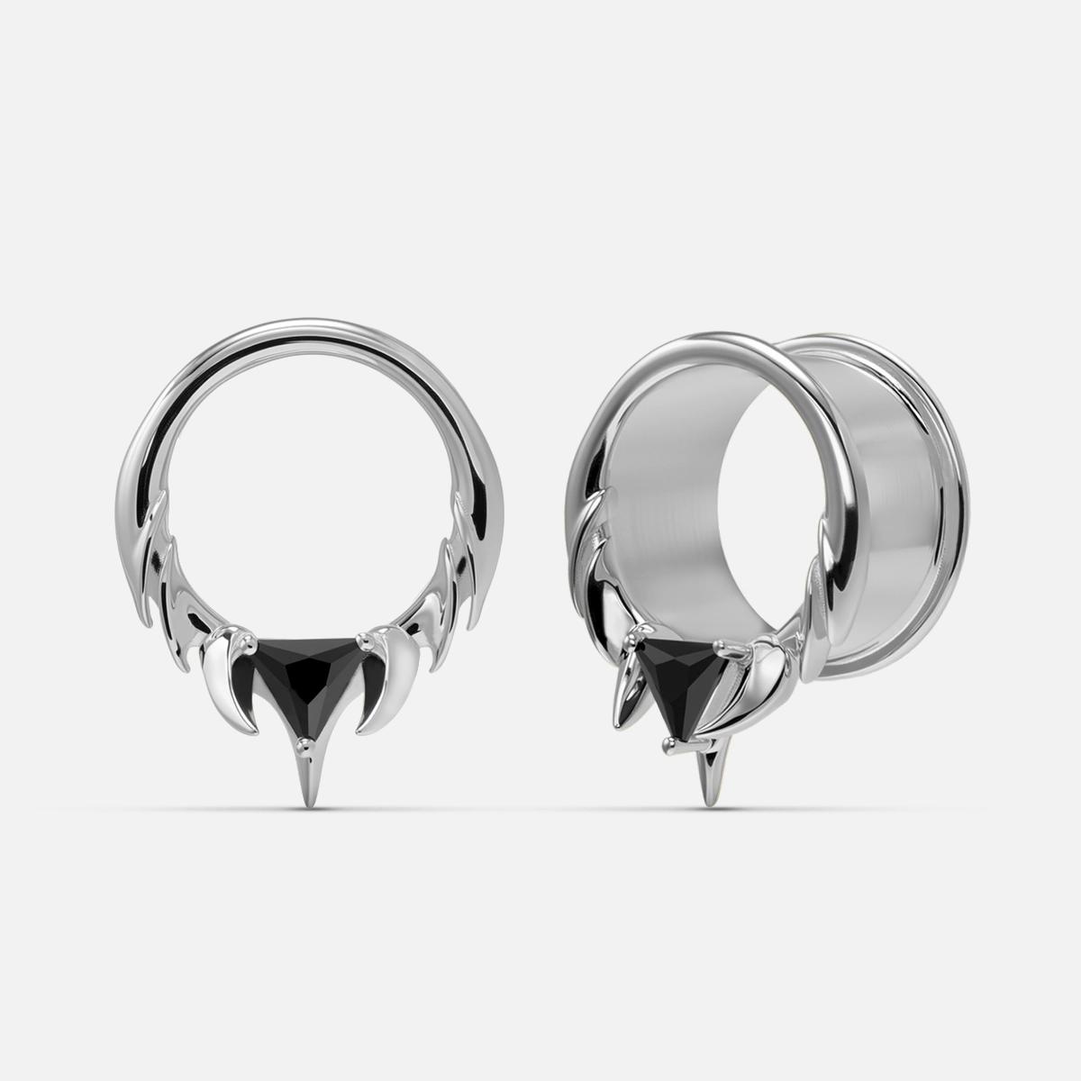 The Interlock Spine Tunnels circle the ear with clean weight, a double-flare profiles with ridge lines that read like bone under load. The geometry interlocks; edges register; the fit feels inevitable.