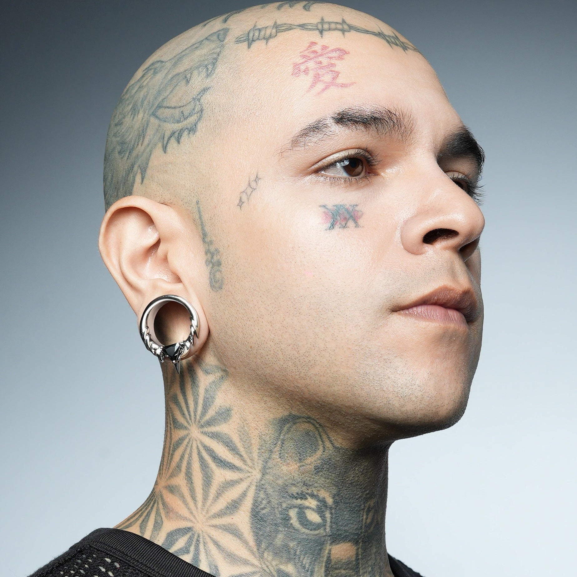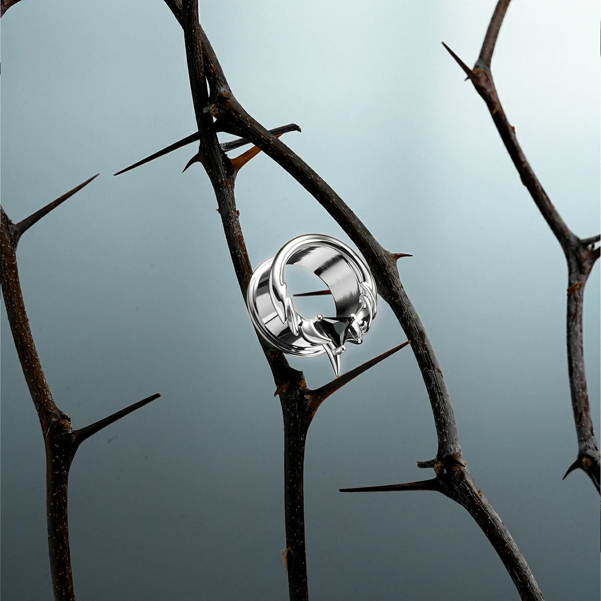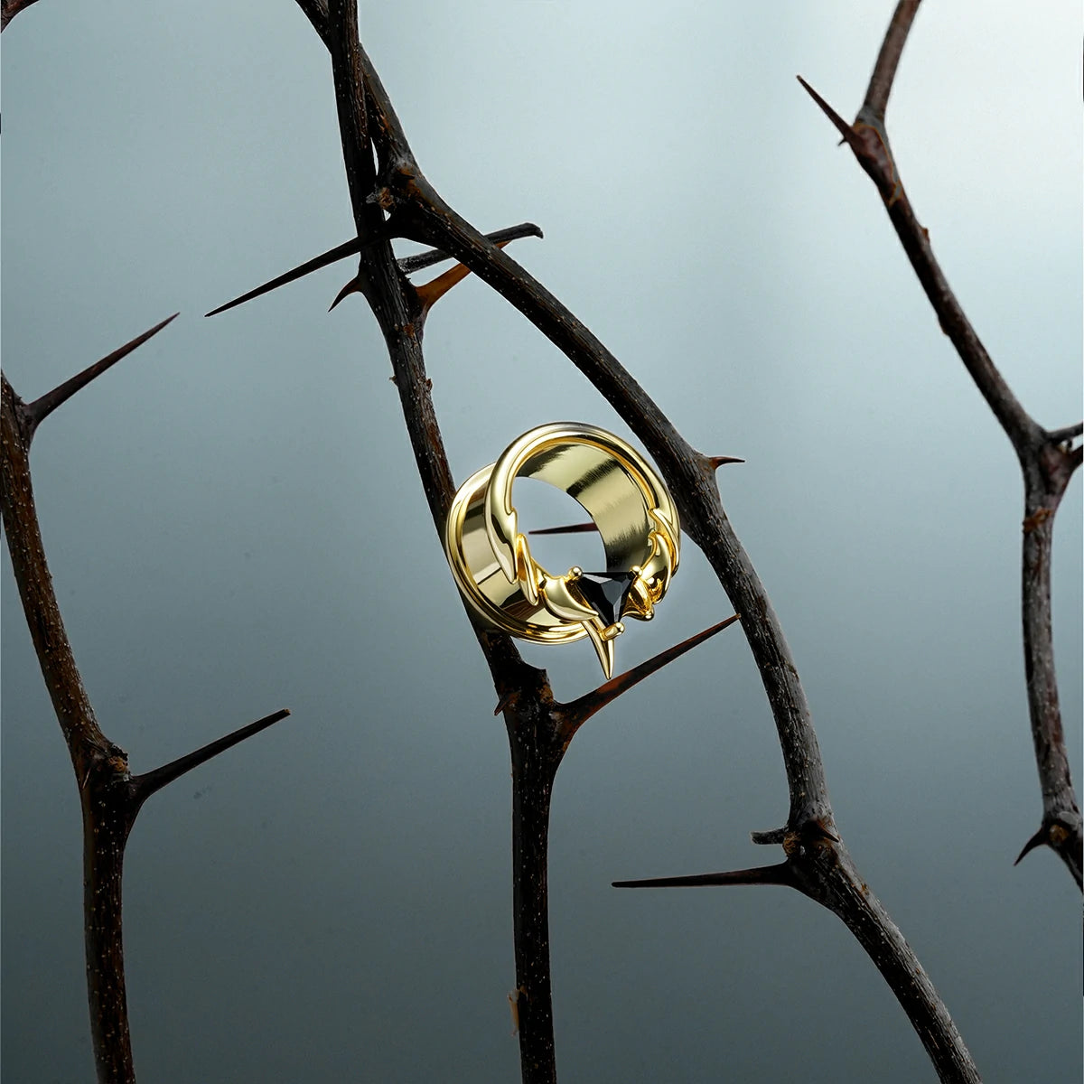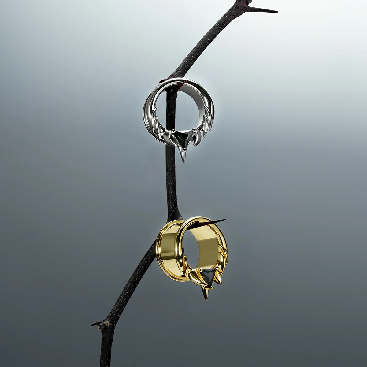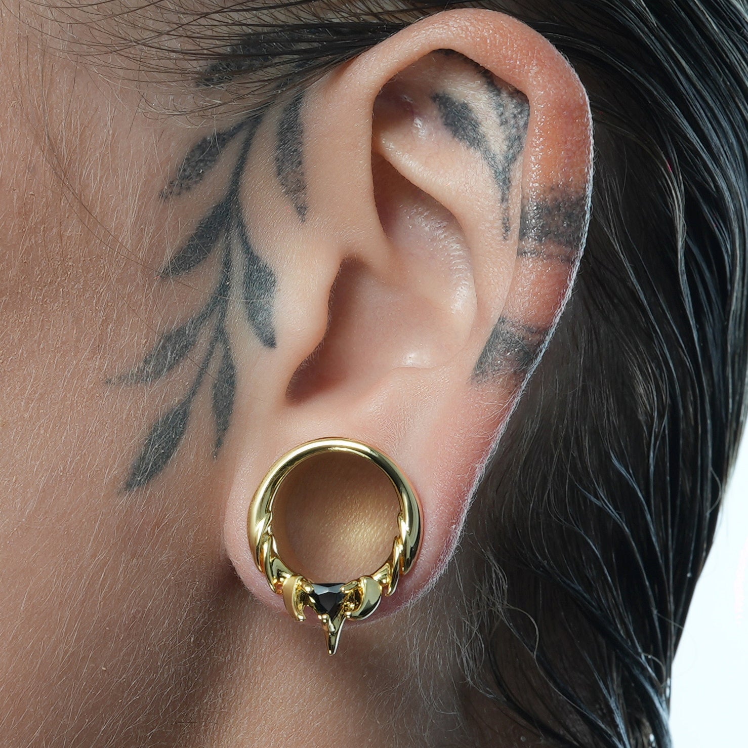The Interlock Spine Tunnels circle the ear with clean weight, a double-flare profiles with ridge lines that read like bone under load. The geometry interlocks; edges register; the fit feels inevitable.