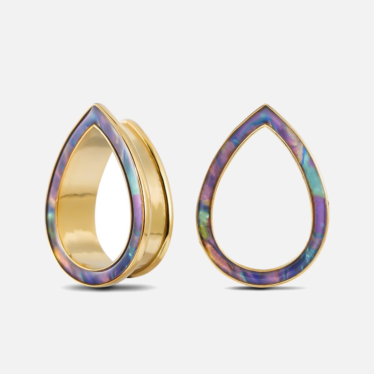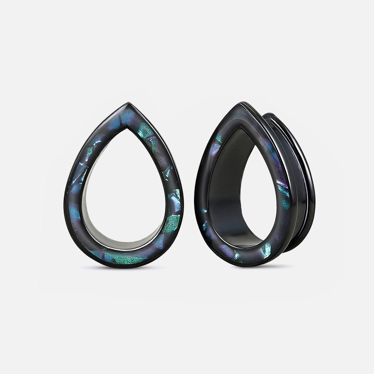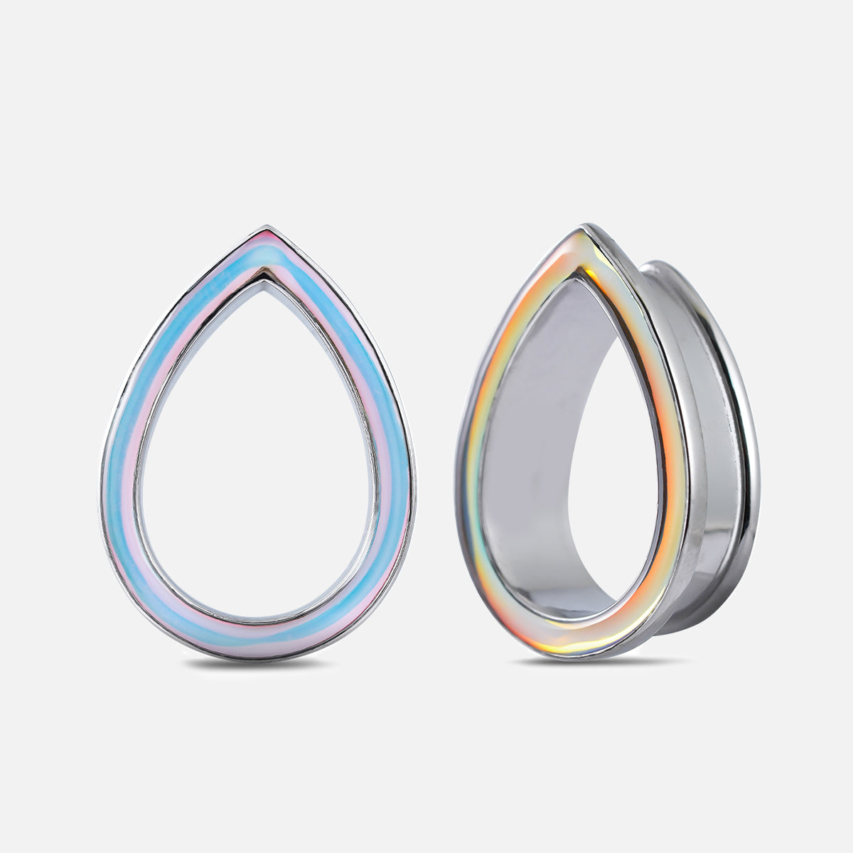 The design features a sleek teardrop shape with an iridescent finish that changes color at different angles, creating a mesmerizing visual effect. This item is sold as a pair.