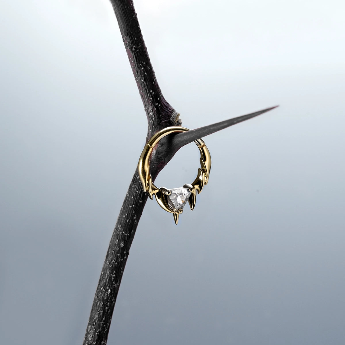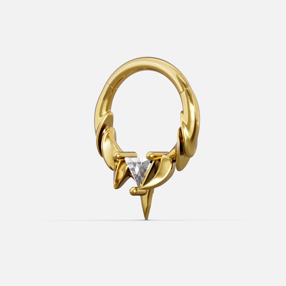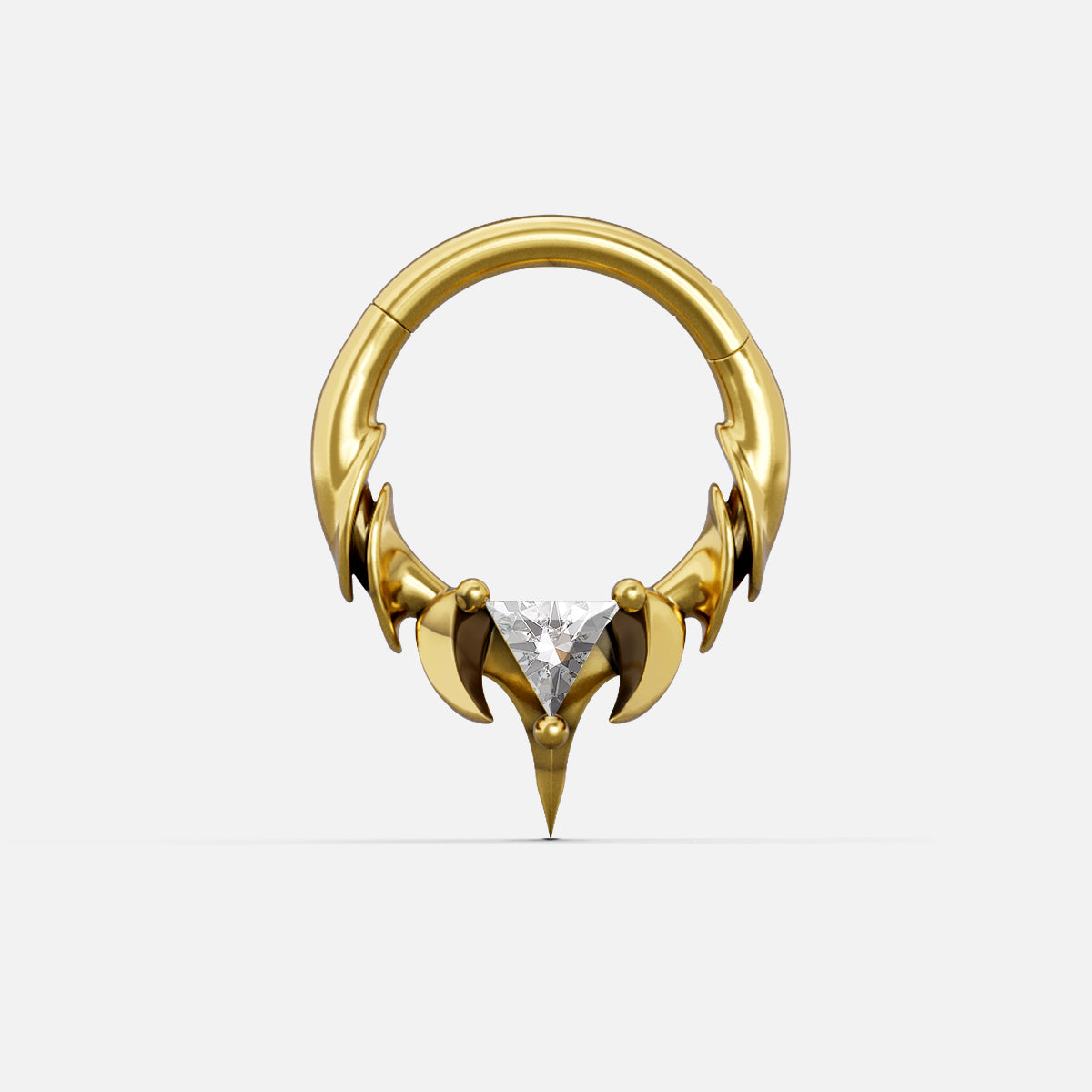 The Keystone Ridge Septum Clicker runs lifted ridge links along a tight arc, resolving at the base in a pronged seat for a triangle-cut stone above a tapered point. Openwork keeps weight low; edges taper for clean clearance—Spinal Bone logic in a compact clicker.
