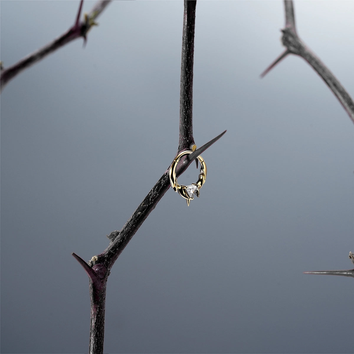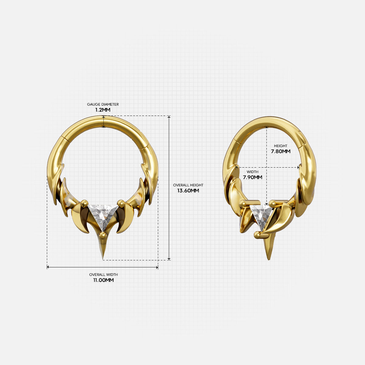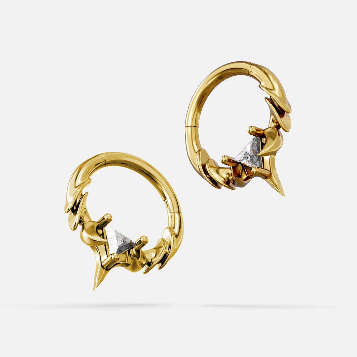 The Keystone Ridge Septum Clicker runs lifted ridge links along a tight arc, resolving at the base in a pronged seat for a triangle-cut stone above a tapered point. Openwork keeps weight low; edges taper for clean clearance—Spinal Bone logic in a compact clicker.