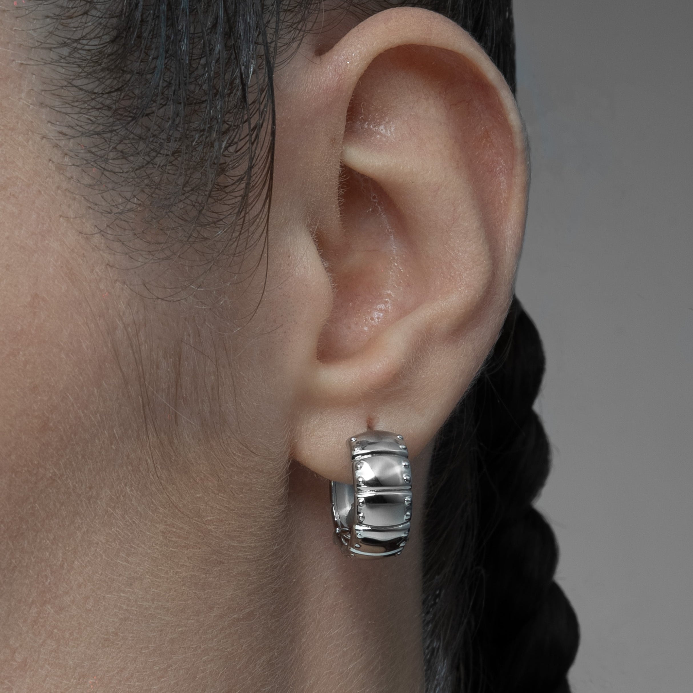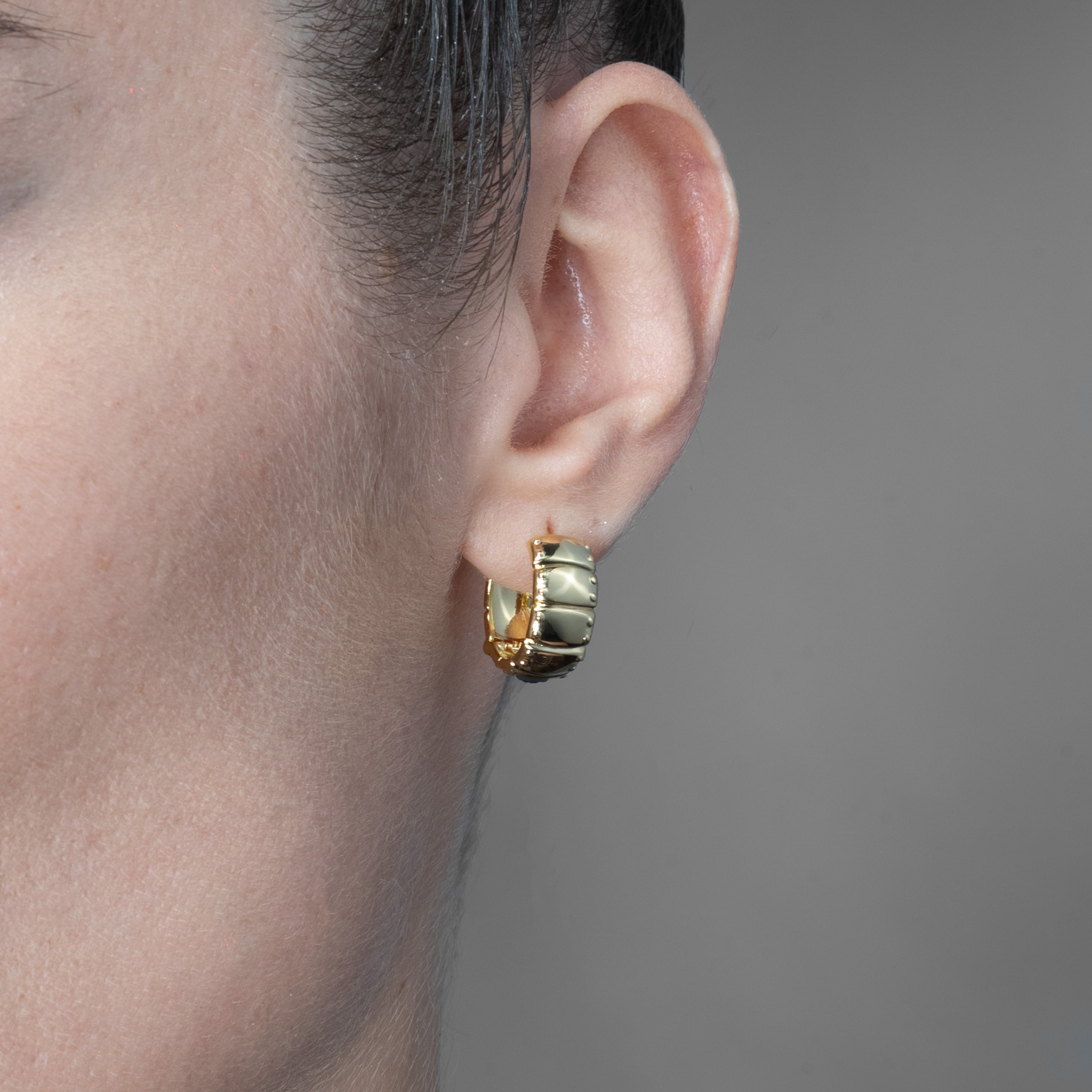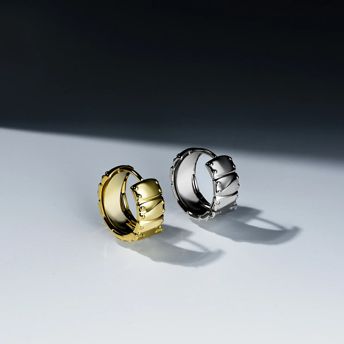 The Laminar Armor Hoop Earrings layer overlapping plates in the logic of armor—each seam disciplined, each edge seated flush. Mass gathers in the arc, but the form stays balanced, structured, and close to the lobe.